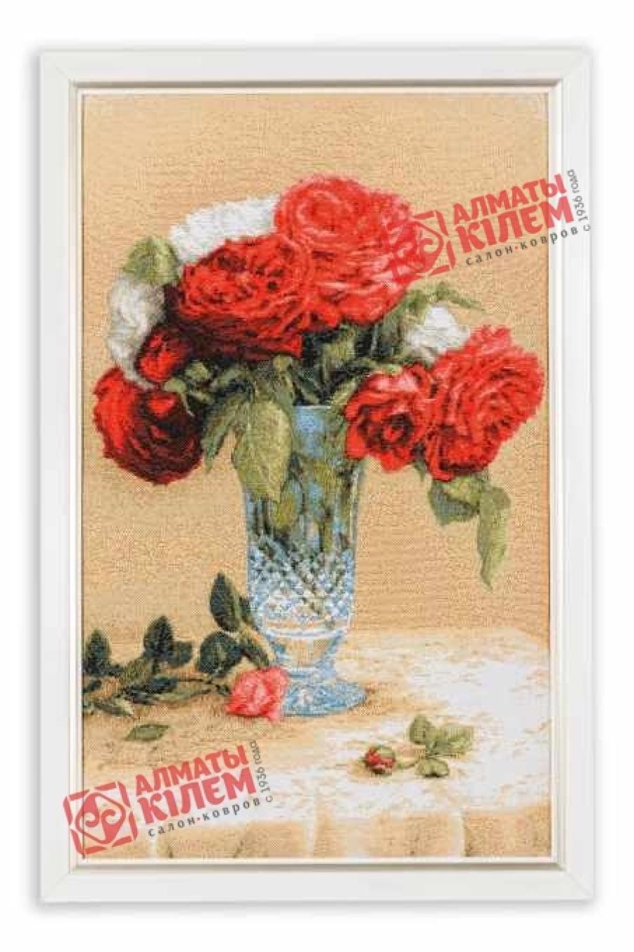 Великолепная тканная картина «Красные Розы» станет изысканным гобеленом для гостиной комнаты квартиры или дома. С роскошным букетом из свежесрезанных красивых цветов в высокой хрустальной вазе, изображенной на полотне, ваш интерьер всегда будет украшать флористическая композиция. Купить тканую картину в белой багетной раме, перекликающейся с палитрой гобелена, можно с доставкой из Алматы-Кілем в любой регион Казахстана.