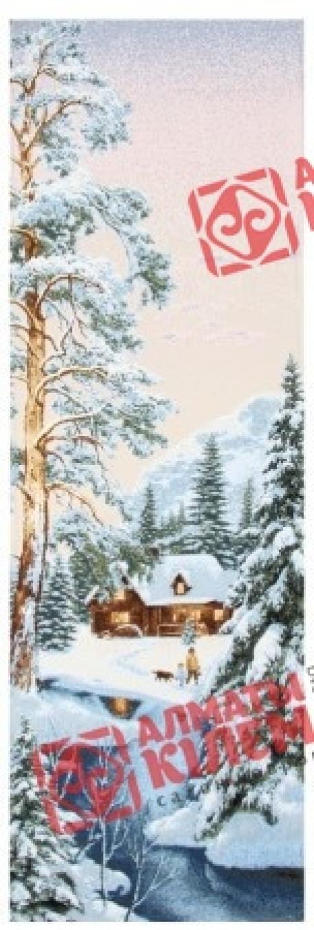 Гобелен «Зимний лес» с деревянным домиком на фоне заснеженного ландшафта. На снегу возле речушки, бурный поток которой не сковали даже морозы, играет ребенок с собакой. Купить тканую картину с доставкой в Алматы-Кілем можно абсолютно в любой интерьер. Размеры 1х0,35 м позволяют повесить полотно даже на небольшом свободном пространстве стены.