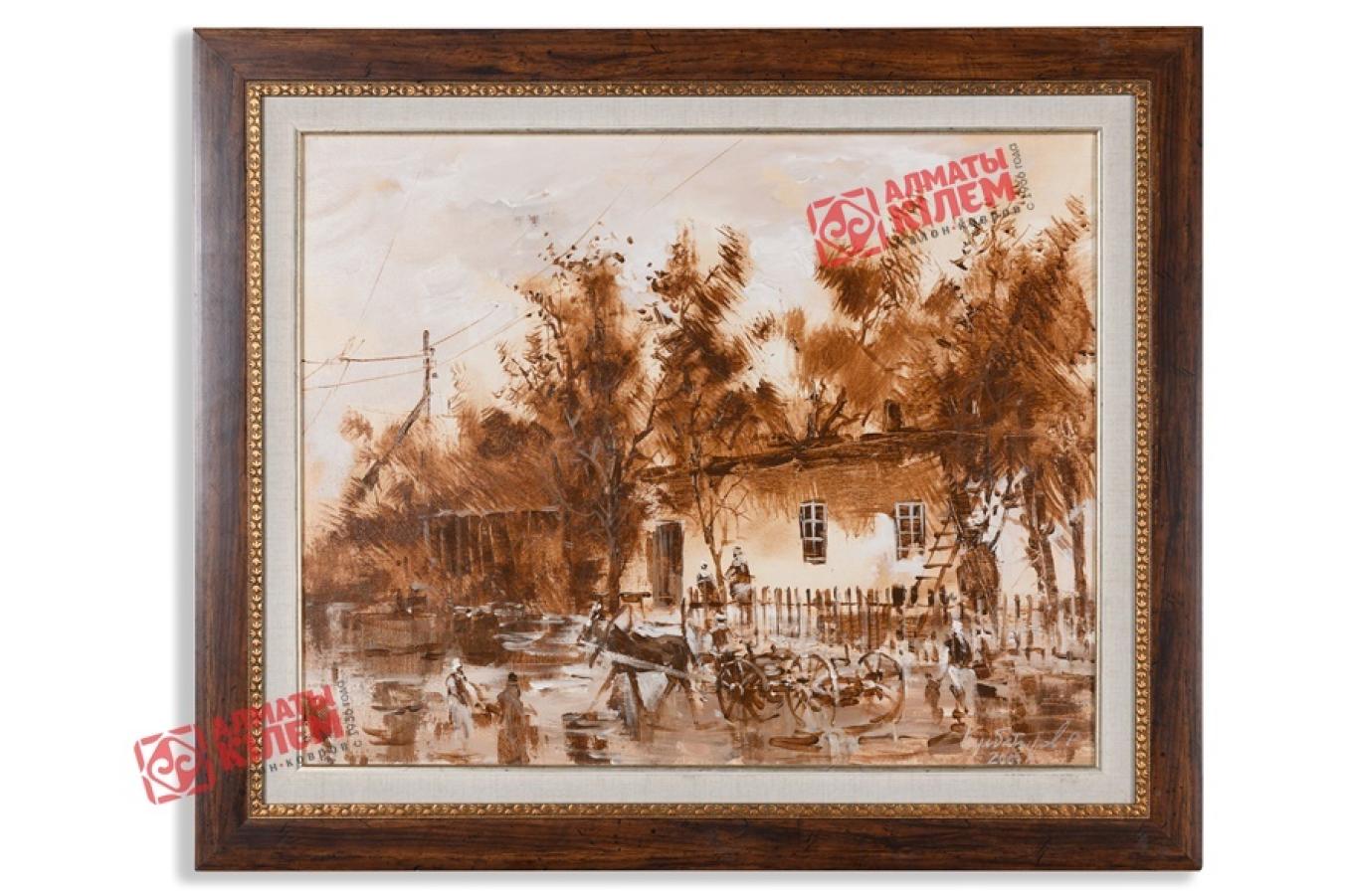 Великолепная картина художника Кульбатырова. На холсте маслом изображен типичный день из жизни казахского аула. Белые, бежевые, коричневые оттенки смогли полностью передать степенный и спокойный быт жителей нашей бескрайней родины. Небольшой саманный домик на фоне высоких деревьев с плоской крышей и невысоким забором впереди не скрывает от глаз аульчан передний двор. По улице неспешно едет телега, запряженная лошадью. Все выглядит так, будто время здесь остановилось и ничто не напоминает о современности, кроме столбов электропередач, виднеющихся вдали. Картина навевает воспоминания и ностальгию. Она займет достойное место на стене гостиной, в офисе или личном кабинете.