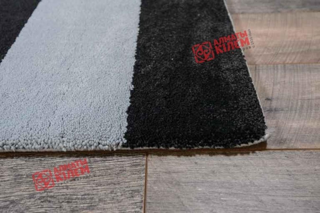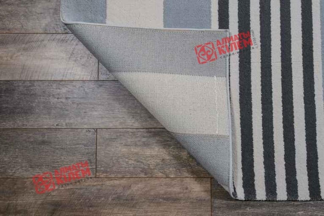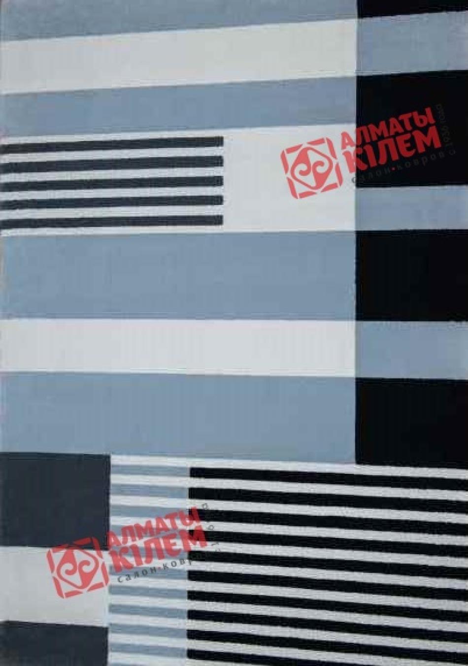 Оригинальное напольное покрытие в серо-голубой палитре с добавлением контрастного черного и белого станет идеальным покрытием для современных интерьеров в стилях минимализма, хай-тек, модерн. Оно прекрасно сочетается с яркой и сдержанной палитрой, необычными по форме и фактуре предметами интерьера. Ковер выполнен из устойчивого к высокой влажности воздуха, скоплению пыли и грязи, простого в уходе полипропилена. Он станет идеальным выбором не только для жилых комнат, кухонь, столовых и прихожих, но даже для ванной. На светлом фоне изображена эффектная абстракция в виде разноцветных серо-голубых, полосатых и черных прямоугольников, образующих вместе эффектный узор.