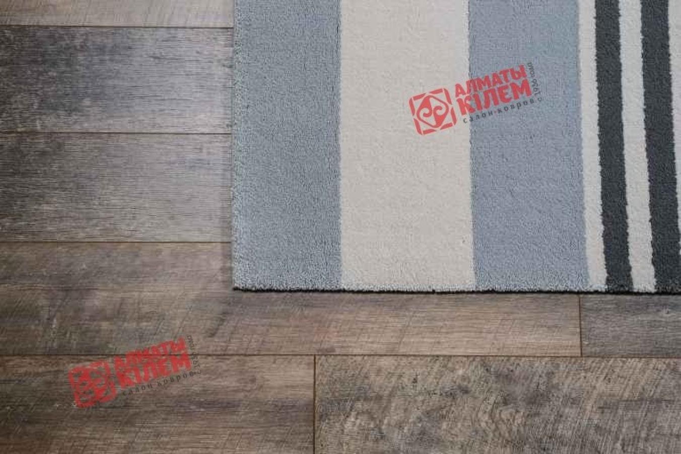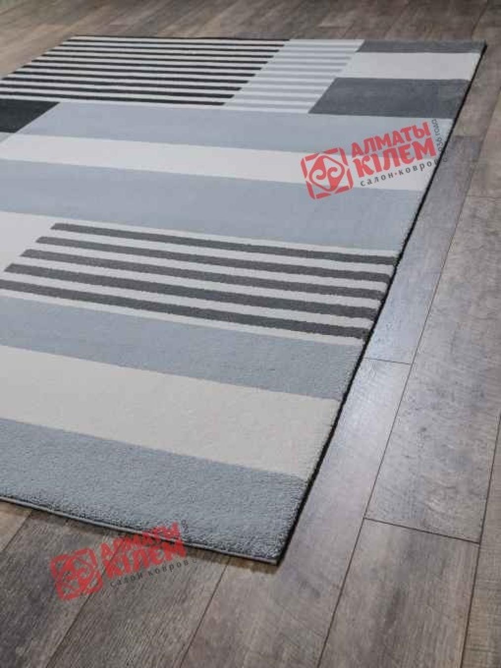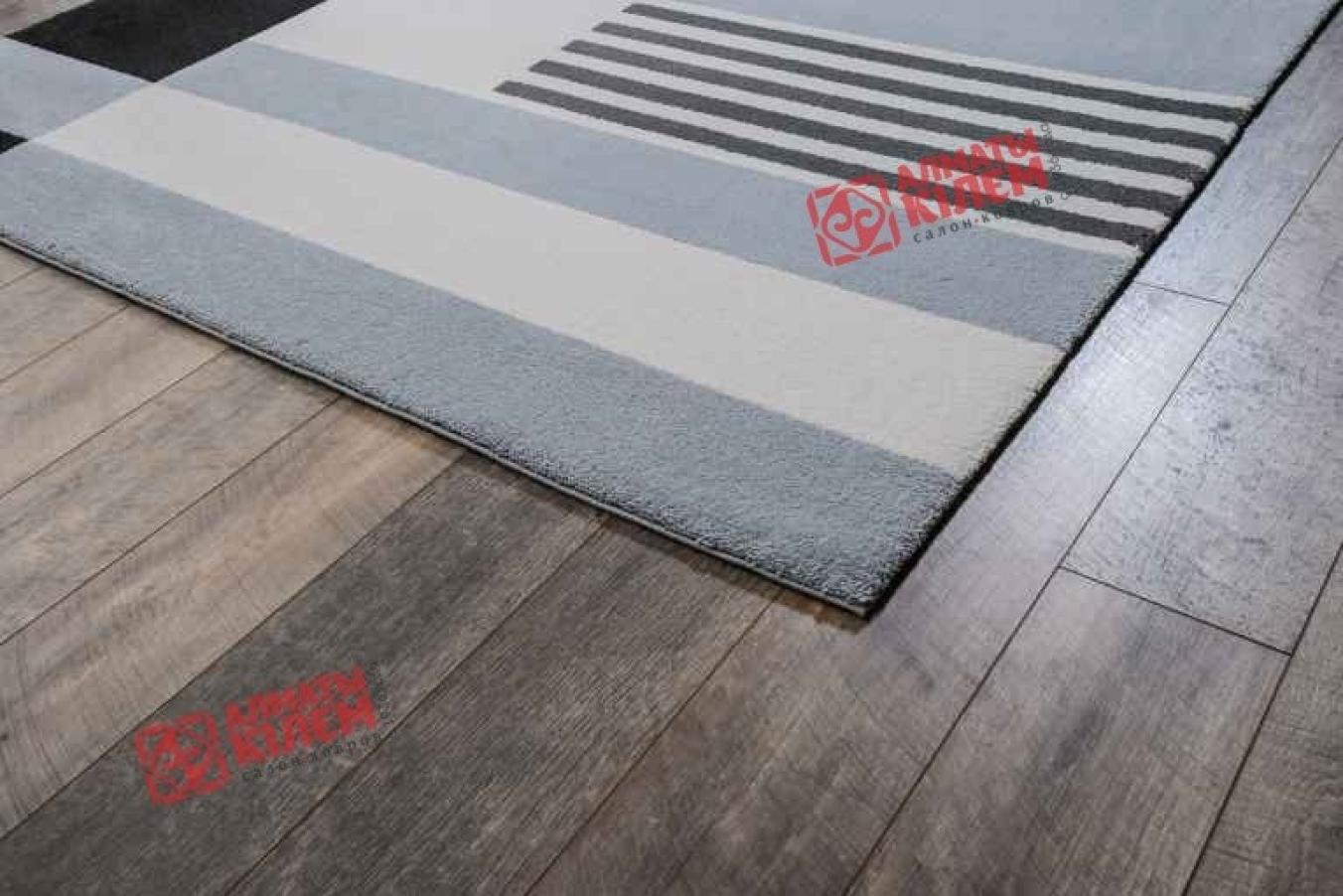 Оригинальное напольное покрытие в серо-голубой палитре с добавлением контрастного черного и белого станет идеальным покрытием для современных интерьеров в стилях минимализма, хай-тек, модерн. Оно прекрасно сочетается с яркой и сдержанной палитрой, необычными по форме и фактуре предметами интерьера. Ковер выполнен из устойчивого к высокой влажности воздуха, скоплению пыли и грязи, простого в уходе полипропилена. Он станет идеальным выбором не только для жилых комнат, кухонь, столовых и прихожих, но даже для ванной. На светлом фоне изображена эффектная абстракция в виде разноцветных серо-голубых, полосатых и черных прямоугольников, образующих вместе эффектный узор.