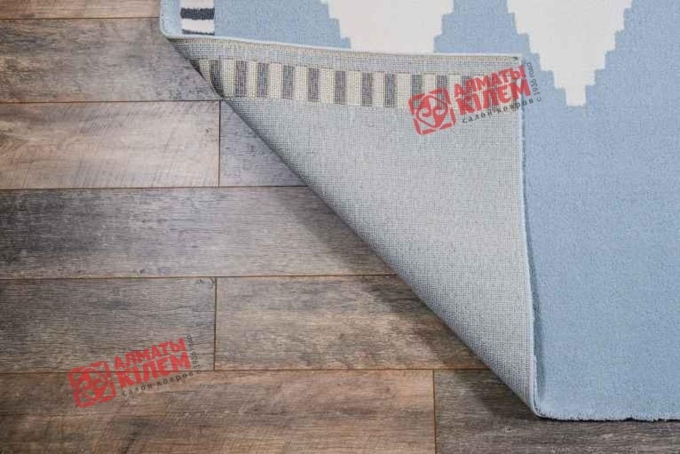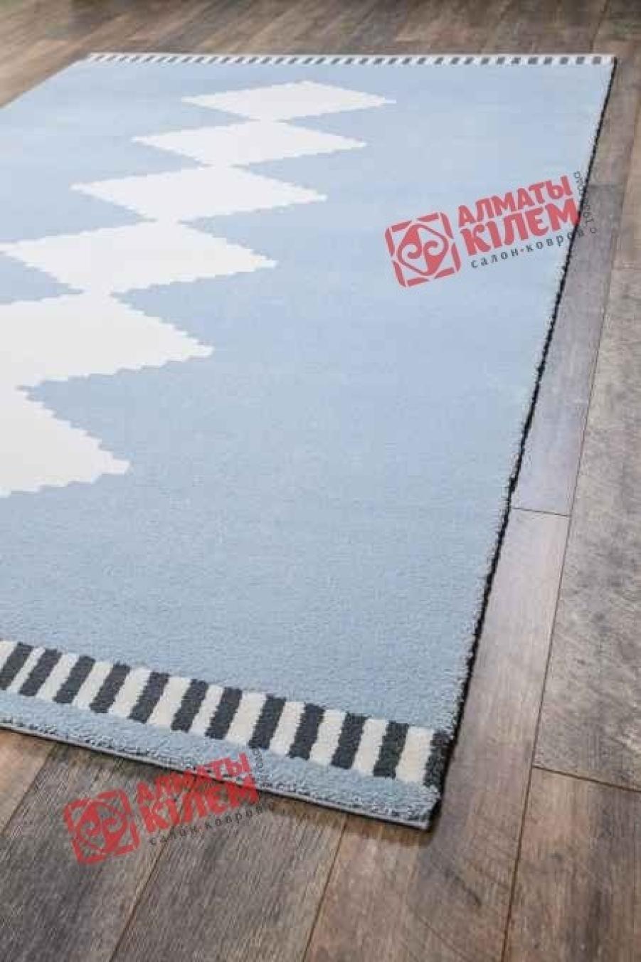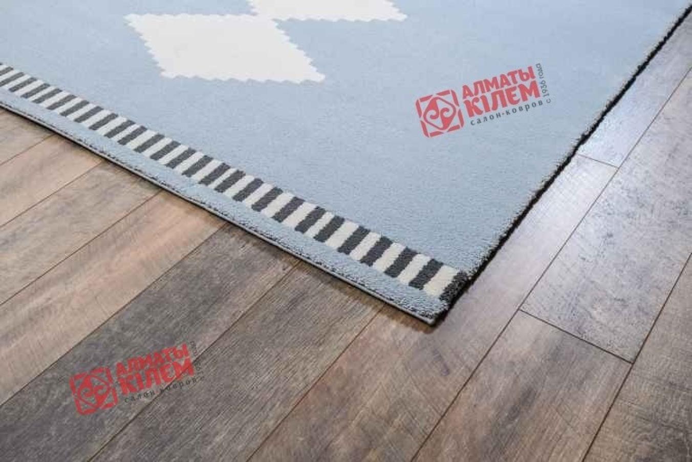 Оригинальный напольный ковер бельгийского производства представляет собой покрытие в современном стиле с геометрическим узором. На серо-голубом фоне изображены светлые ромбы. Они расположены вдоль полотна и образуют соединенную в единое целое полоску. Дизайн ковра отличает оригинальность и универсальность. Модель прекрасно впишется абсолютно в любой современный интерьер гостиной, спальни, детской, ванной, прихожей, кухни и спальни. Универсальность достигается благодаря полипропилену, из которого выполнено изделие. Этот материал прекрасно «чувствует» себя при высокой влажности и не притягивает пыль с грязью, а также отличается простотой в уходе.
