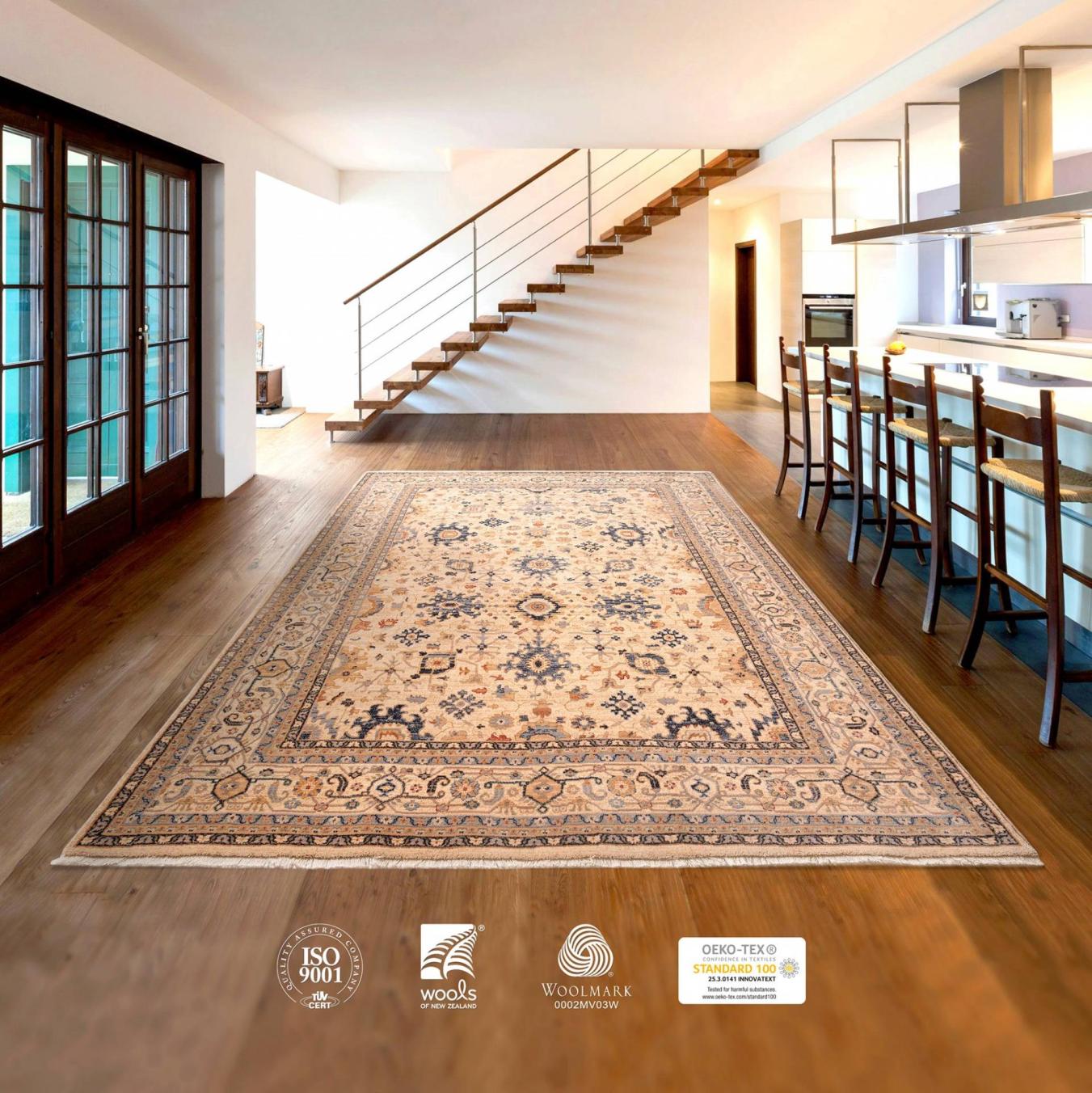 Роскошный ковер производства Молдовы от бренда MOLDABELA из коллекции «Antique» из новозеландской шерсти. Основа выполнена из джута. Высота ворса достигает 10 мм. На каждый квадратный метр приходится 700 тысяч узелков. Рисунок — этнический. Основной оттенок — бежевый. Шерстяной ковер идеально вписывается в классические и современные интерьеры гостиных комнат, спален, прихожих. Средняя высота ворса и плотность позволяют использовать покрытие в офисах и кабинетах.