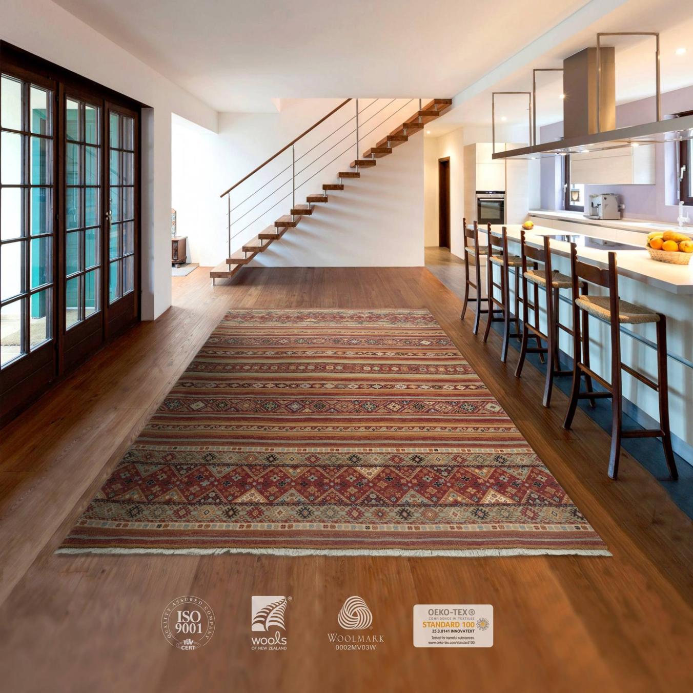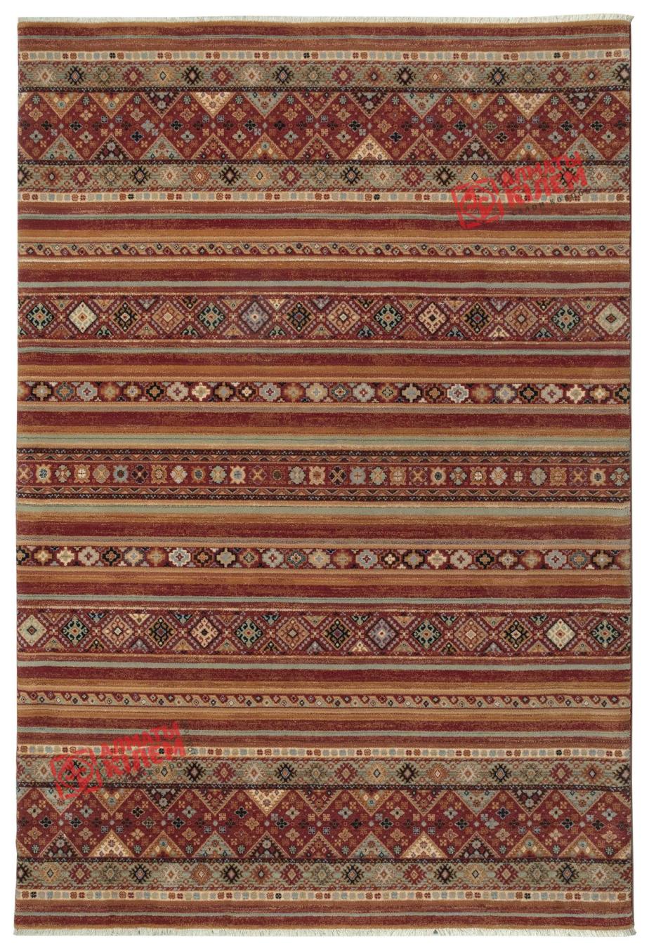 Ковер в этническом стиле производства Молдовы с основой из джута и ворсом средней высоты от бренда MOLDABELA из коллекции «Antique». Модель обладает высокой плотностью — на 1 кв. м. приходится 700 000 узелков. Высота ворса средняя — около 10 мм. По верхнему и нижнему краю полотно декорировано бахромой. Изделие одинаково великолепно смотрится как в домашних, так и в офисных интерьерах. Джутовая основа позволяет укладывать полы в таком помещении с высокой влажностью, как кухня.