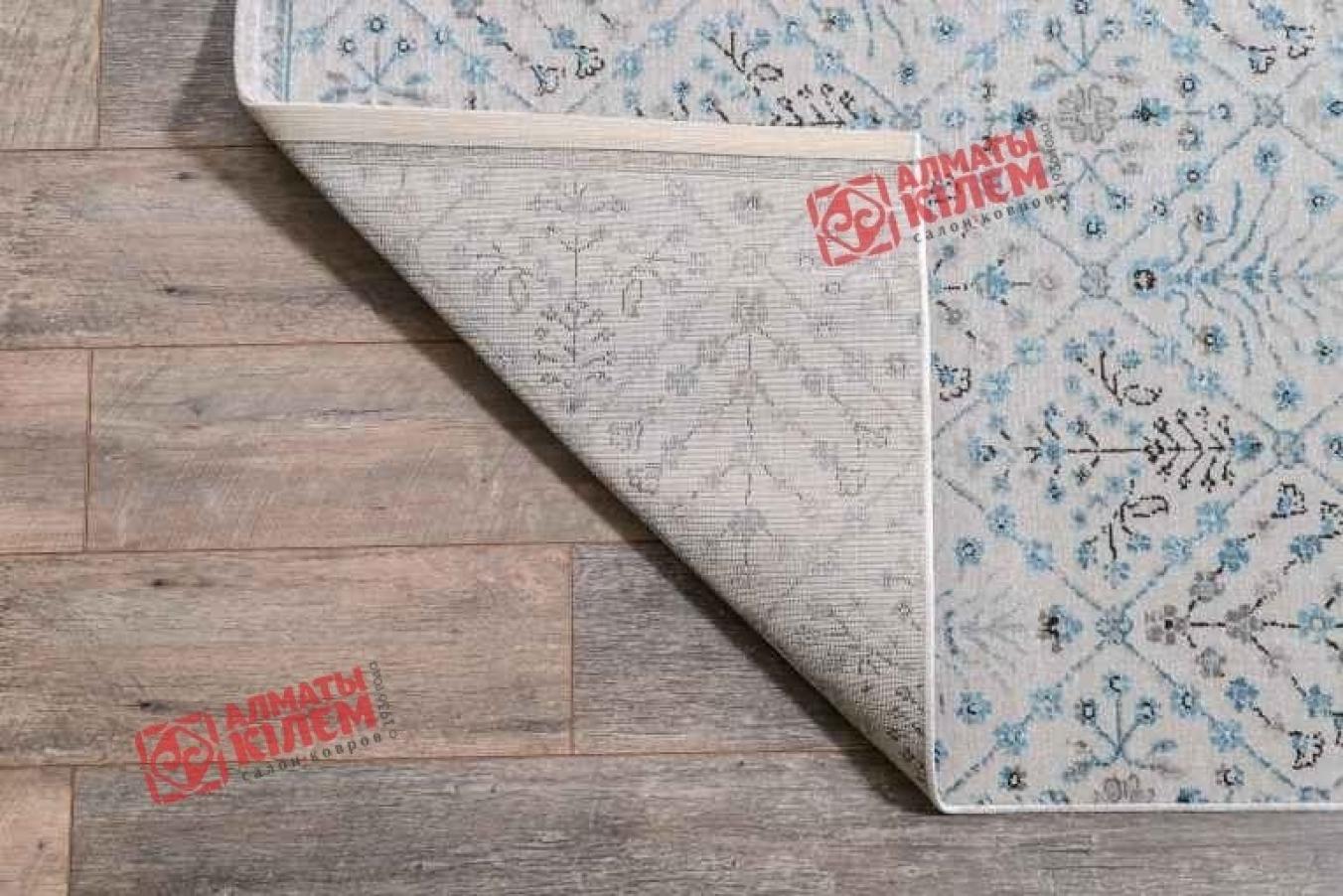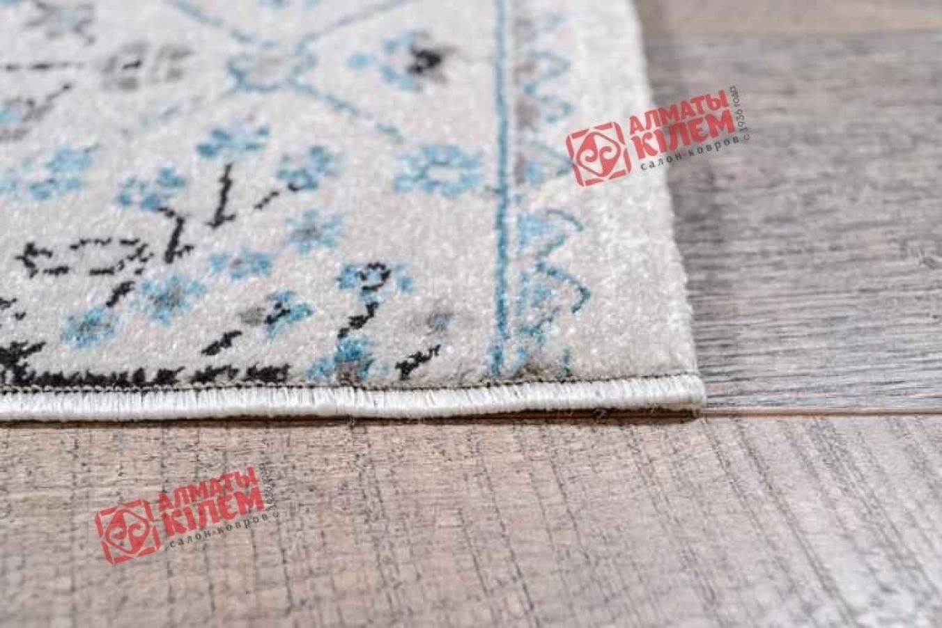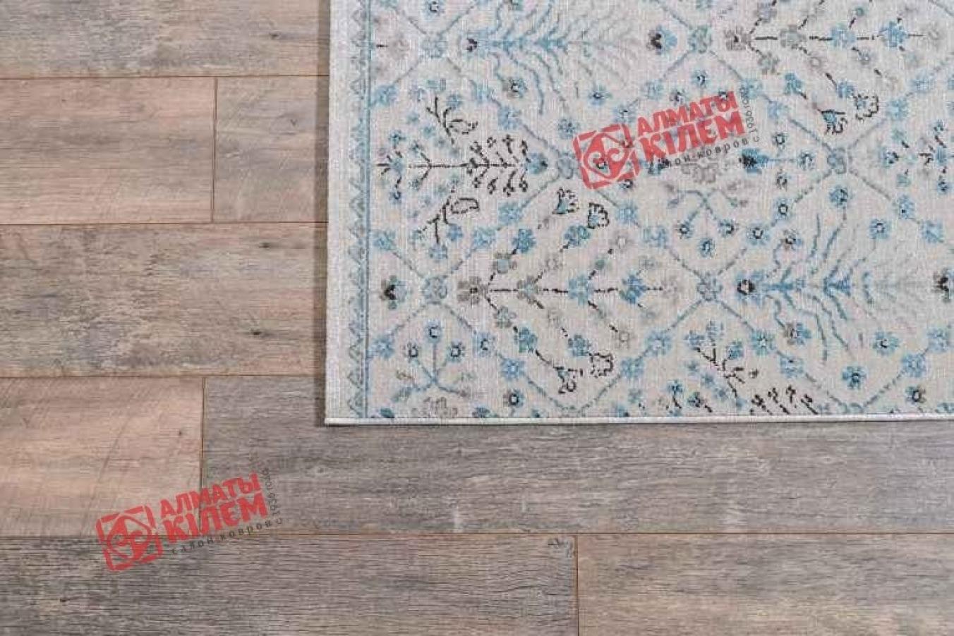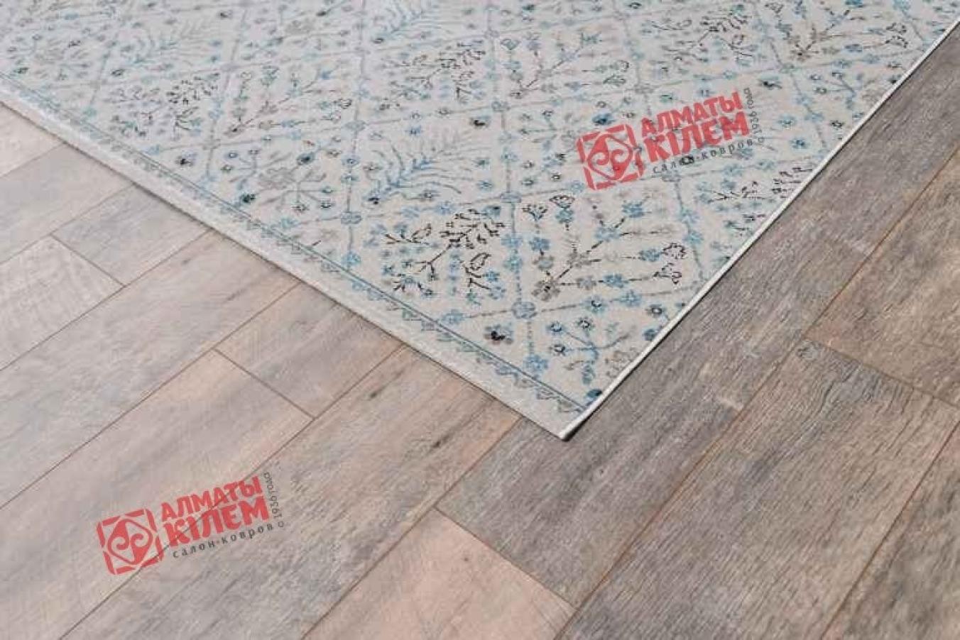 Дизайн этого ковра поражает с первого взгляда. Напольное покрытие из коллекции «Antique» с оригинальным геометрическим узоров в современном стиле идеально подходит для домашних и офисных интерьеров. Ковер станет прекрасным дополнением не только меблированных комнат, но и прекрасно будет смотреться в прихожке или холле, поскольку уже сам по себе достаточно красив и самодостаточен. На благородном светло-серого оттенка фоне изображен флористический мотив, образующий замысловатые ромбы. Каждый такой отдельный элемент декорирован елочкой. Рисунок имеет голубоватый оттенок. Такая цветовая палитра смотрится благородно и красиво, придавая обстановке соответствующую атмосферу.