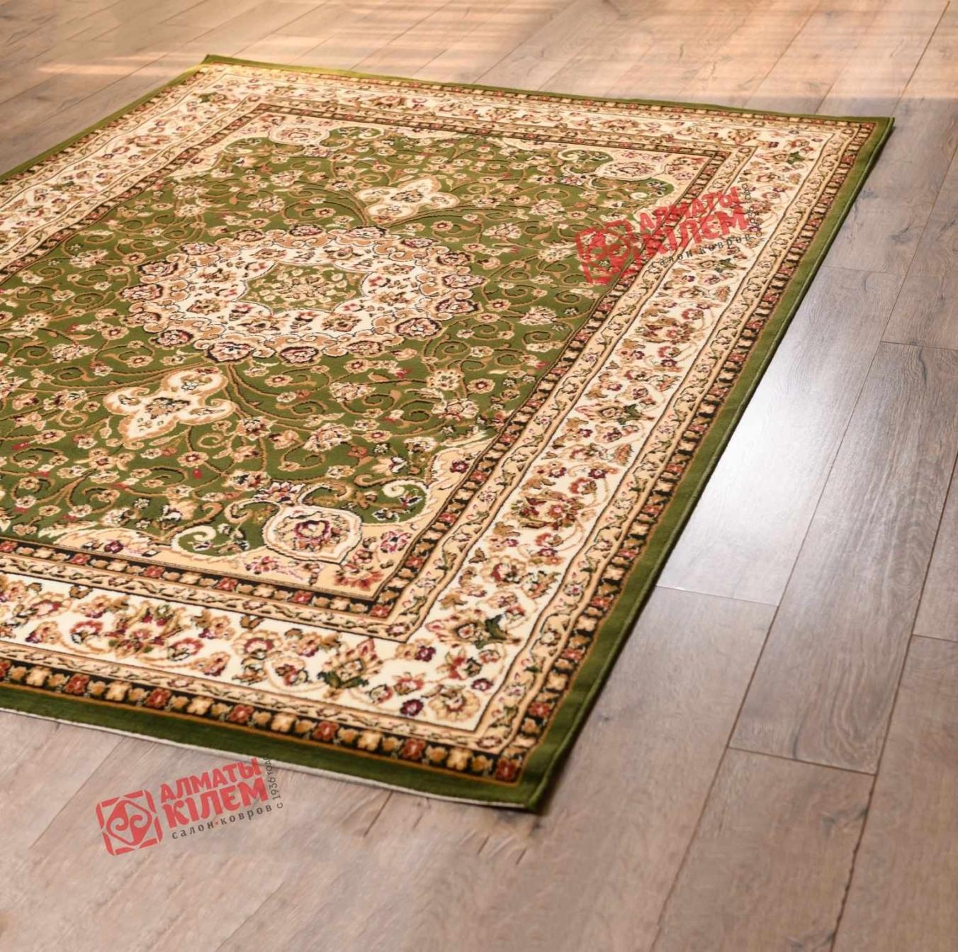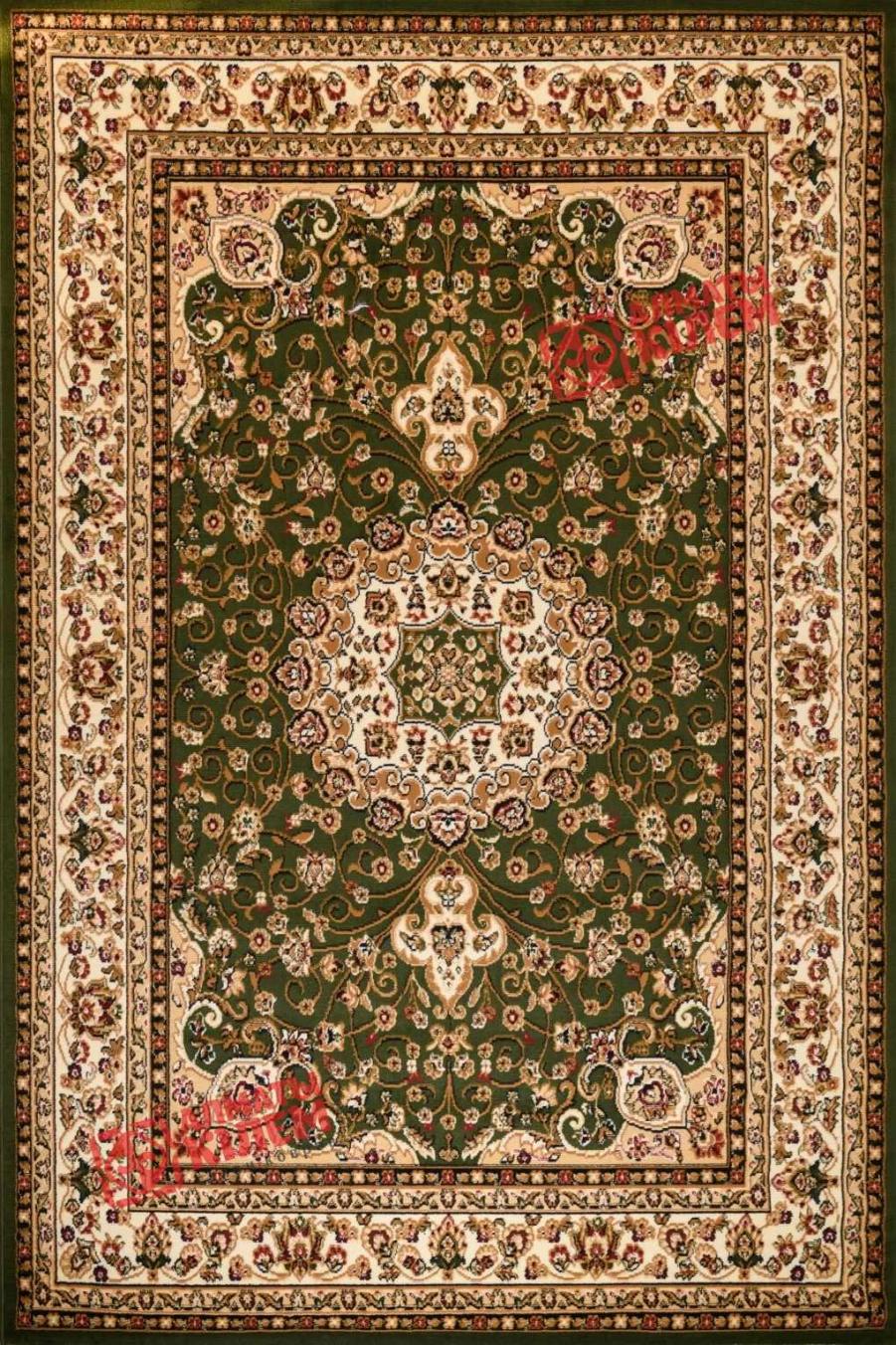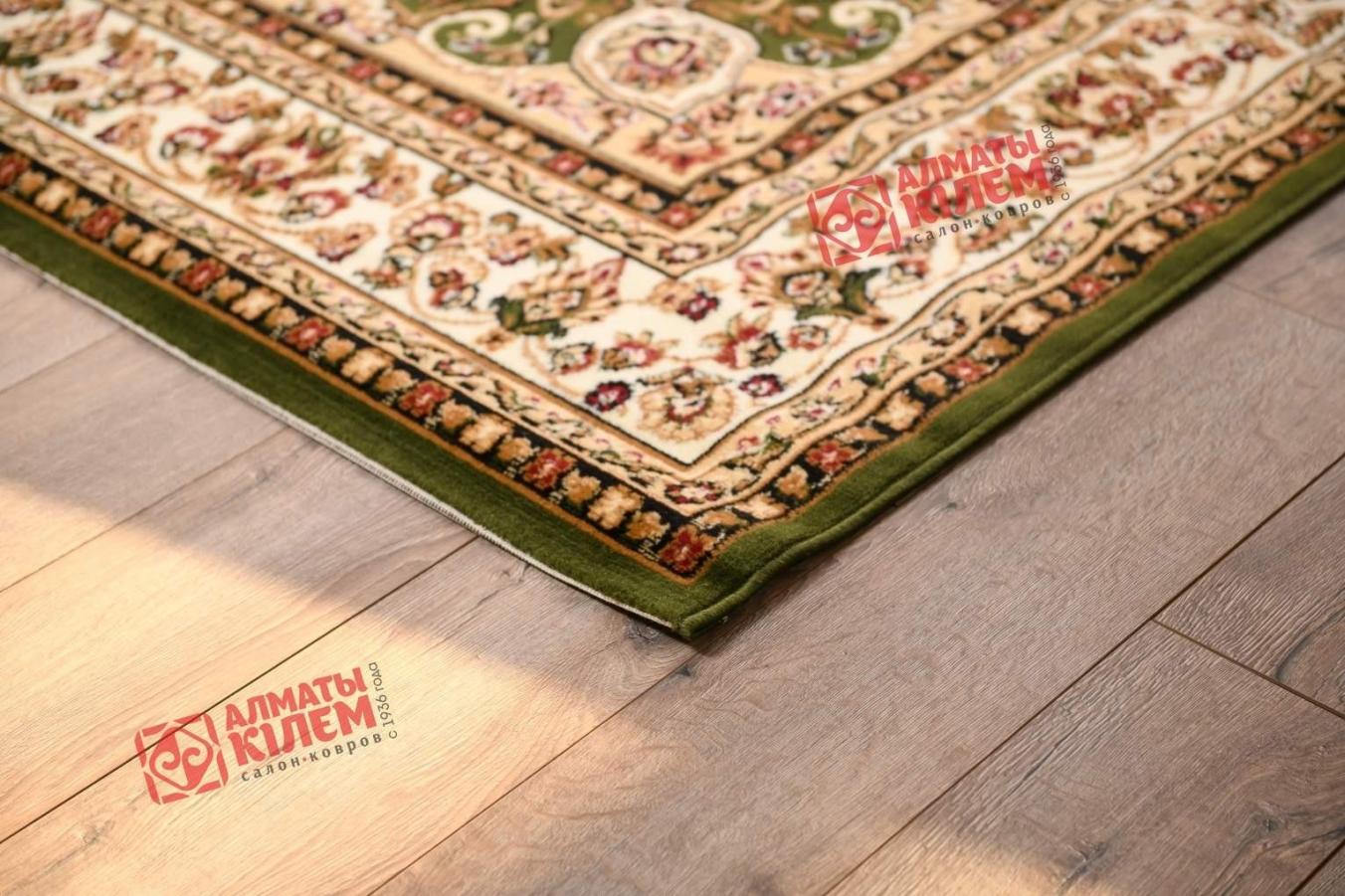 Роскошный ковер отечественного производства в классическом стиле станет не просто завершающим штрихом при создании уютного и комфортного интерьера гостиных, спален, кухонь, столовых, прихожих, офисов и кабинетов, но и украшением, завершающим общую концепцию всей обстановки. Высокий ворс подчеркивает богатство фактуры и придает покрытию невероятную красоту. Ходить по нему как в обуви, так и босиком — это настоящее удовольствие. Он способствует расслаблению, а также создает комфортную температуру даже тогда, когда полы в комнате холодные. Традиционный для классического дизайна медальон и обрамление в виде бордюра разбавлено зеленым основным оттенком.