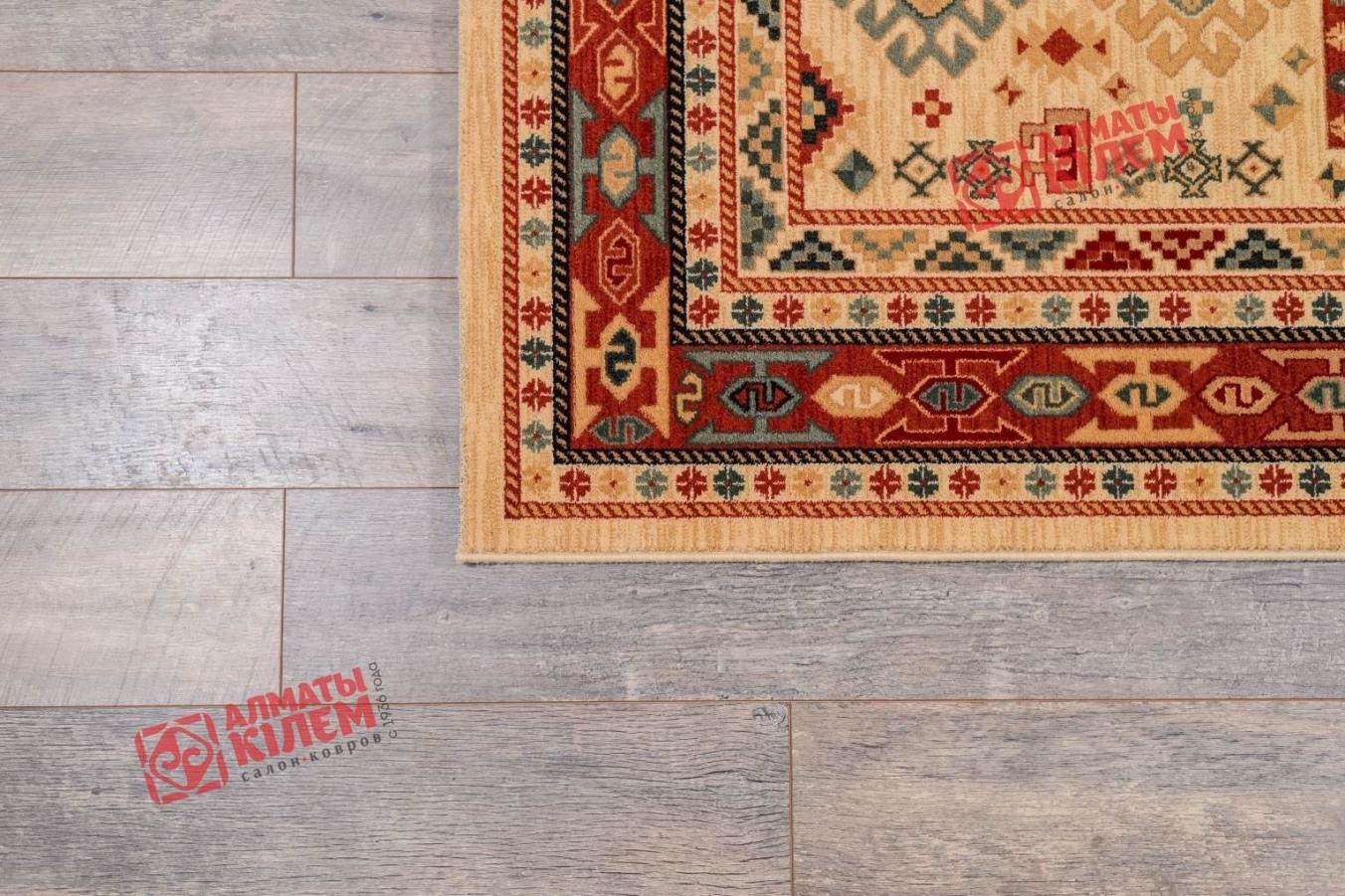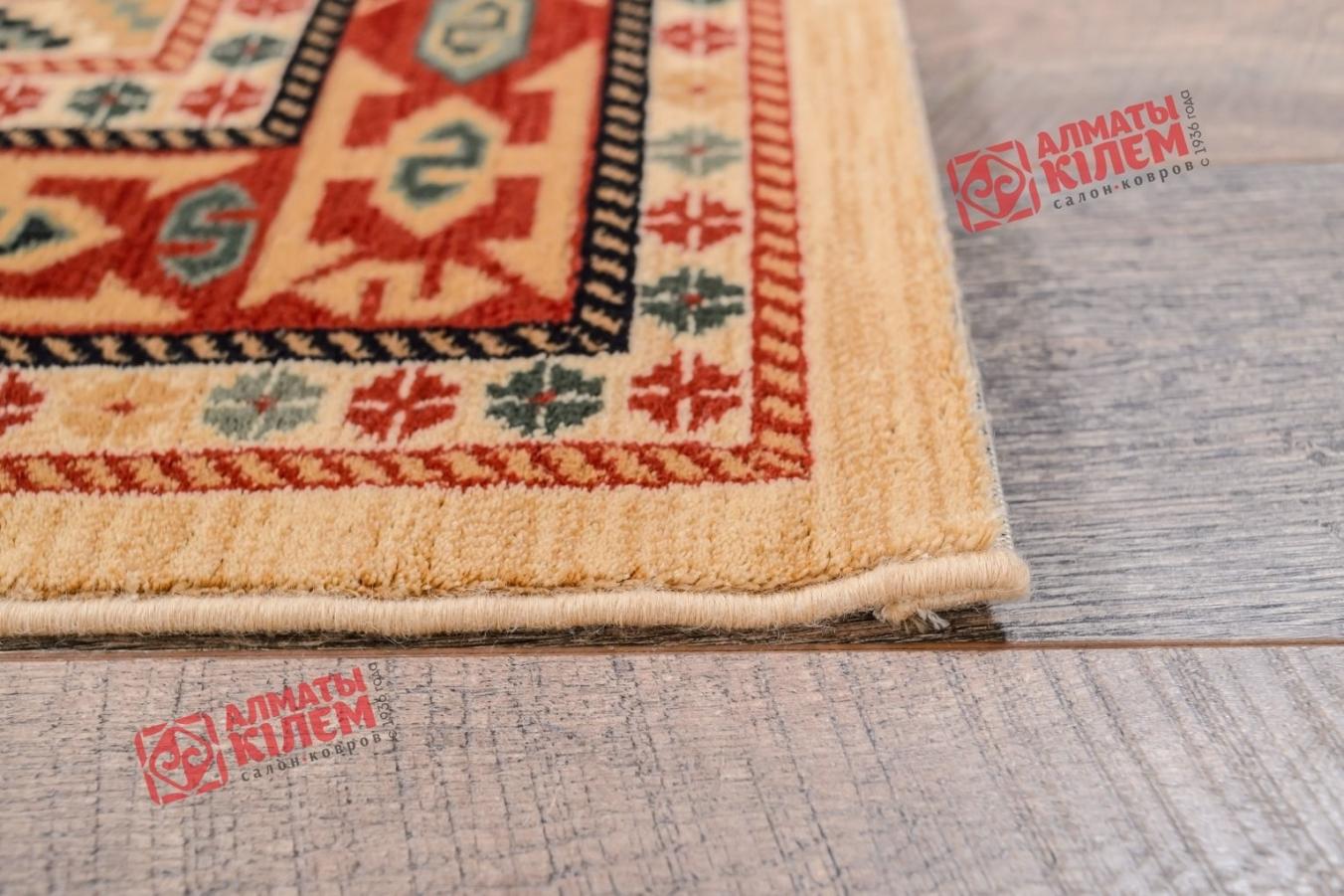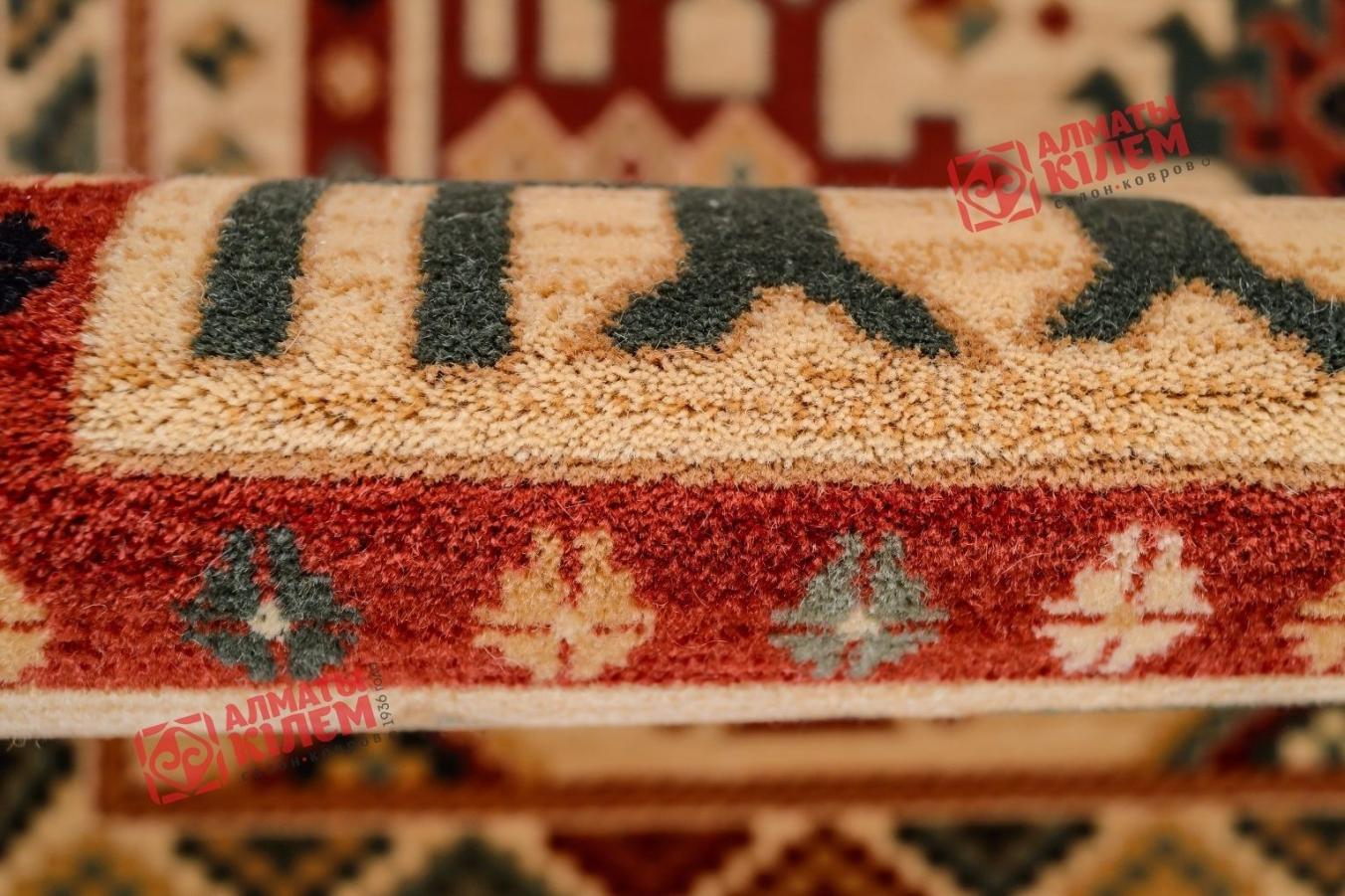 Великолепный напольный ковер из натуральной шерсти станет прекрасным дополнением богато обставленных интерьеров гостиных комнат, спален, столовых, кухонь, прихожих, офисов и кабинетов. Роскошная фактура кремового полотна не только смотрится красиво, но и оставляет после себя исключительно приятные тактильные ощущения. Ворс средней высоты поддерживает комфортную температуру пола и способствует снятию усталости после тяжелого дня. Ходить по нему одинаково комфортна и в обуви, и босиком. Кремовое полотно с изысканным геометрическим цветным орнаментом обрамлено бордюром красного цвета, сочетающегося с основным рисунком, завершающим дизайн ковра.