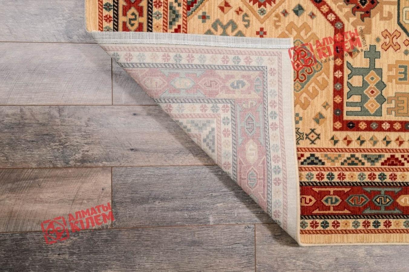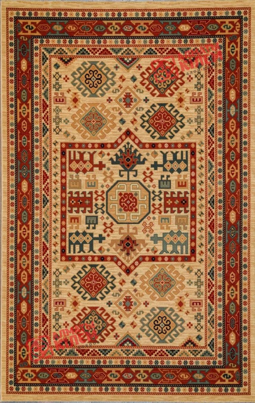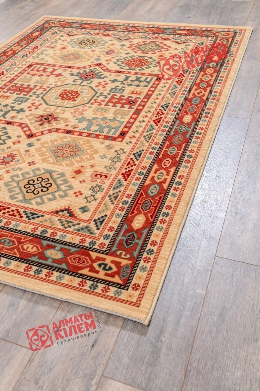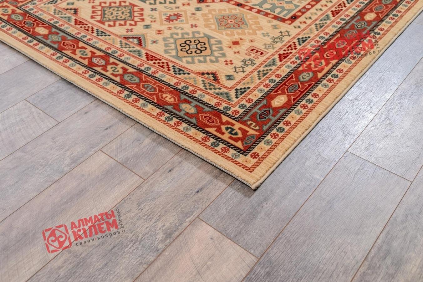 Великолепный напольный ковер из натуральной шерсти станет прекрасным дополнением богато обставленных интерьеров гостиных комнат, спален, столовых, кухонь, прихожих, офисов и кабинетов. Роскошная фактура кремового полотна не только смотрится красиво, но и оставляет после себя исключительно приятные тактильные ощущения. Ворс средней высоты поддерживает комфортную температуру пола и способствует снятию усталости после тяжелого дня. Ходить по нему одинаково комфортна и в обуви, и босиком. Кремовое полотно с изысканным геометрическим цветным орнаментом обрамлено бордюром красного цвета, сочетающегося с основным рисунком, завершающим дизайн ковра.