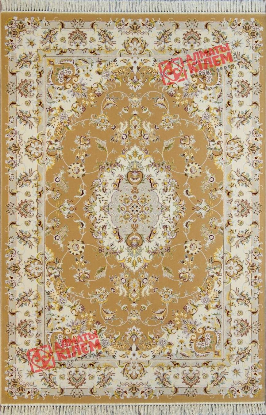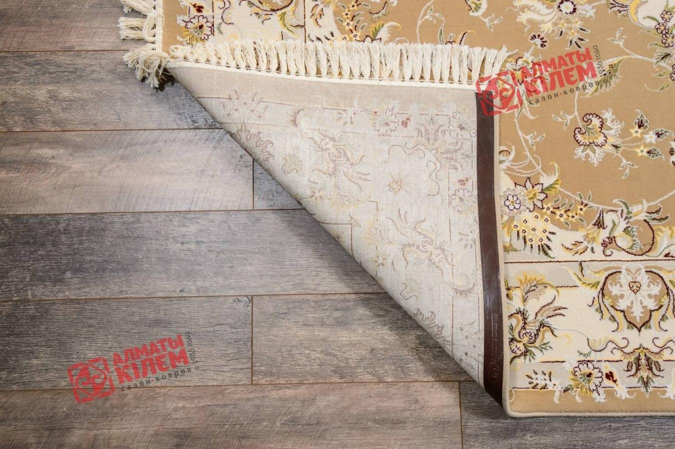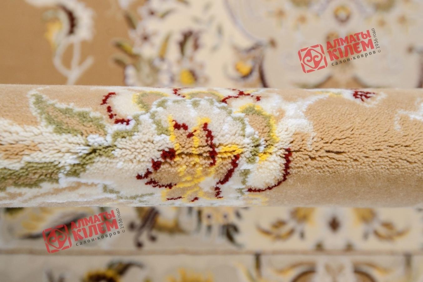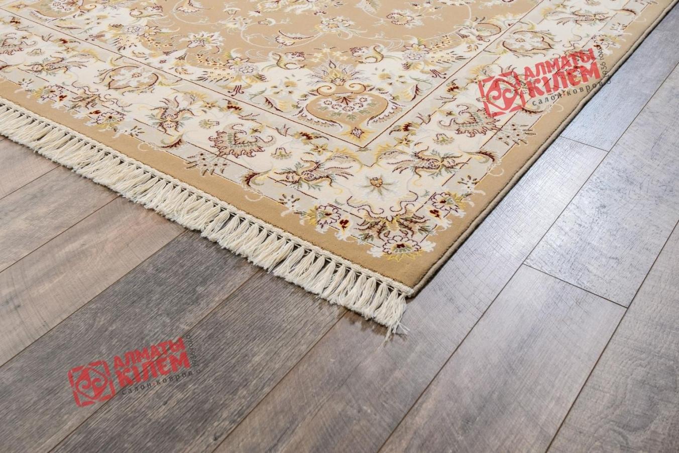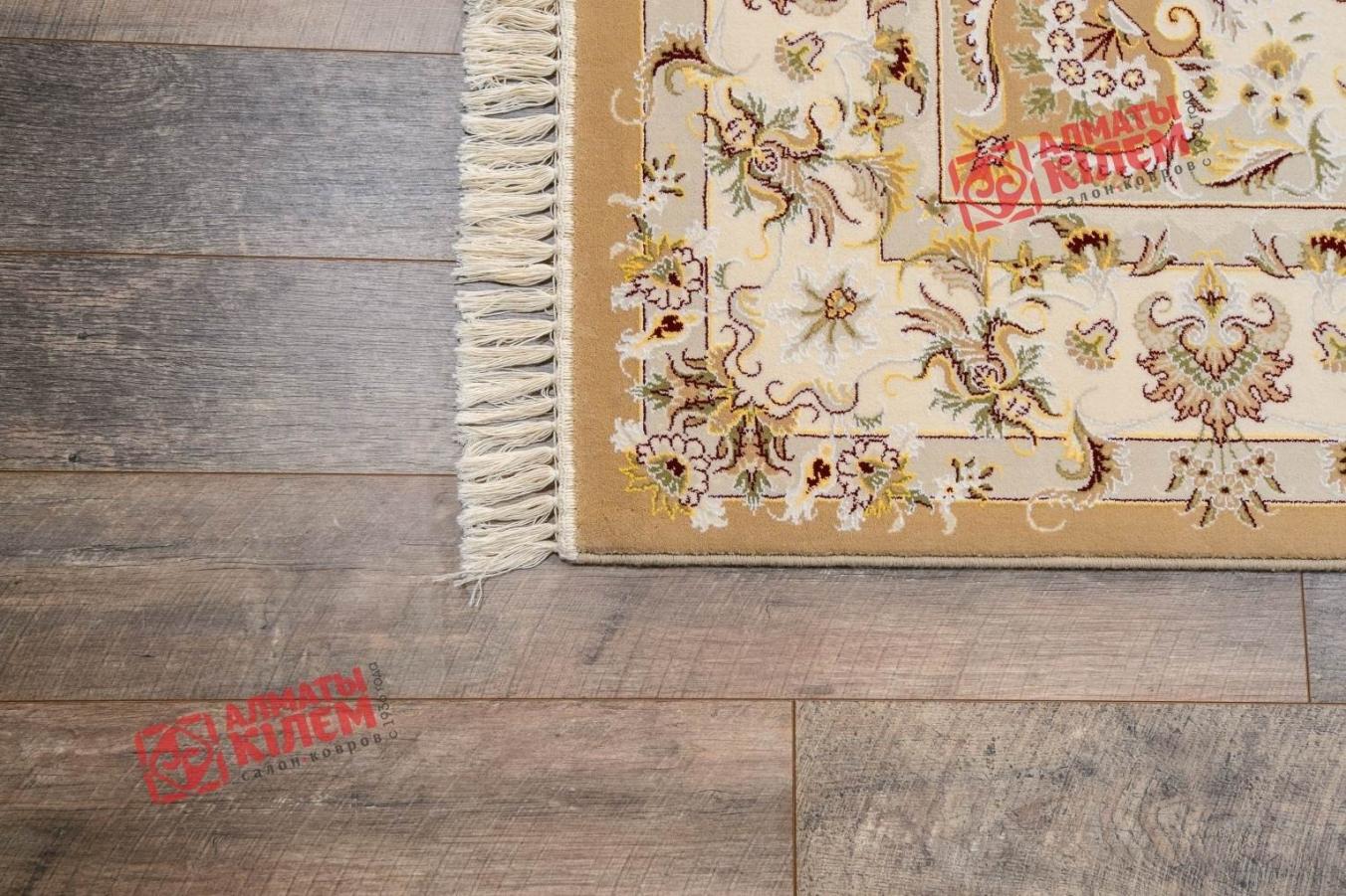 Бежевый персидский ковер из натуральной шерсти и вискозы с эффектным блеском, прекрасно поддерживает комфортную температуру пола и становится прекрасным украшением домашних и офисных интерьеров. Благодаря сдержанной палитре и неброскому рисунку, он вписывается в обстановку с восточными элементами и без. Неотъемлемым атрибутом классического стиля является медальон с центральной розеткой и множеством цветочков и витиеватых стеблей.