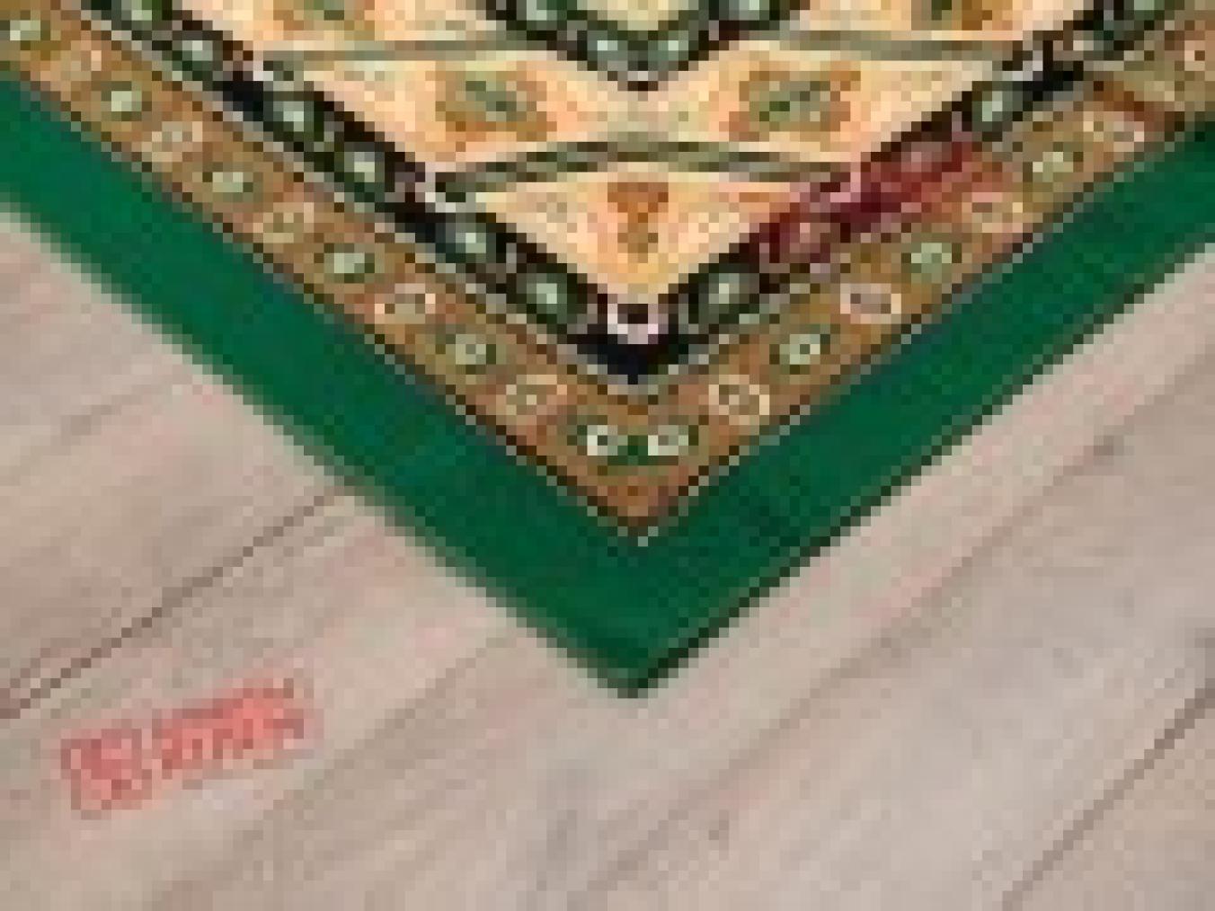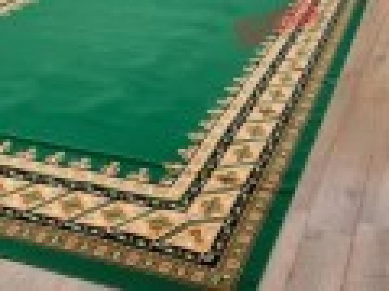 Невероятно изысканный ковер монгольского производства из коллекции «Чингис ковер». Основа полотна выполнена из смеси полиэстера, хлопка, джута. Ворс изготовлен из шерсти с добавлением полиамида. Плотность полотна составляет 340 тысяч узелков на квадратный метр. Длина ворса равна 8-9 мм. Ковер зеленого цвета с роскошным золотым обрамлением выполнен в классическом и административном стиле. Полотно идеально подходит для кабинетов руководителей, приемных, а также просторных прихожих.