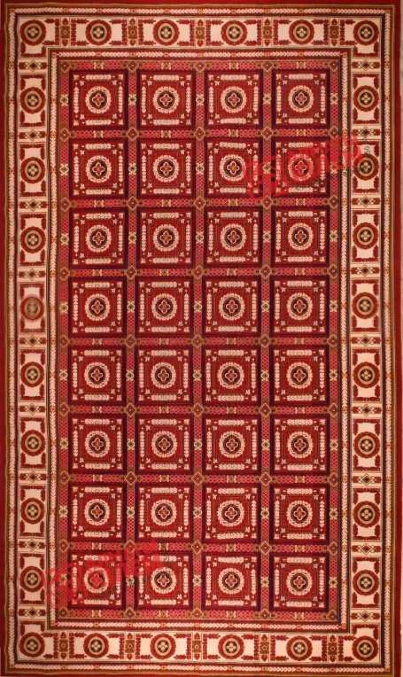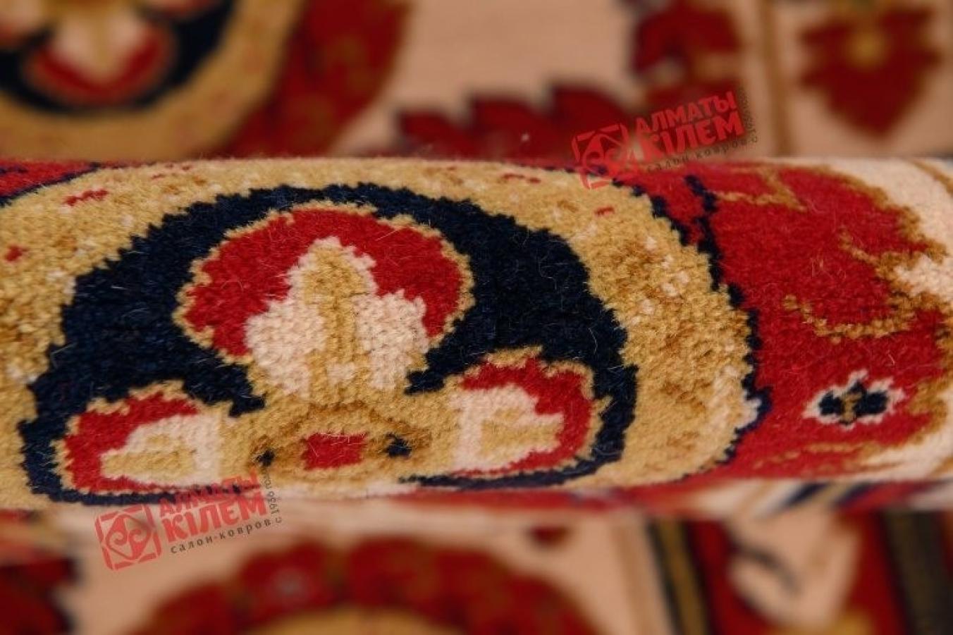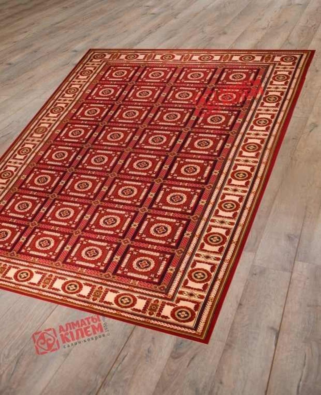 Роскошный ковер из стопроцентной натуральной шерсти с изысканным классическим дизайном — это богатая и изысканная фактура, оригинальность и подчеркнутая строгость. Напольное покрытие создано для помещений с дорогой обстановкой, декором, отделкой. Оно просто идеально впишется в кабинет руководителя, приемную или офис, Ковер прекрасно смотрится и в домашнем интерьере квартир, загородных домов, и в офисном. Традиционный для персидских шерстяных ковров ручной работы узор хашти в виде одинаковых прямоугольников одинаковой формы с орнаментом внутри на рубиновом фоне обрамлен роскошным бордюром. Последний повторяет рисунок центрального декора, но уже на кремовом фоне.