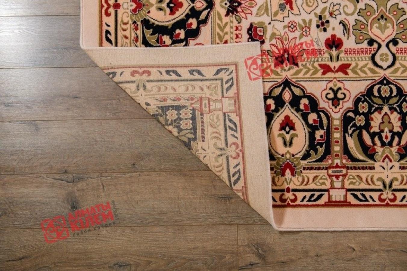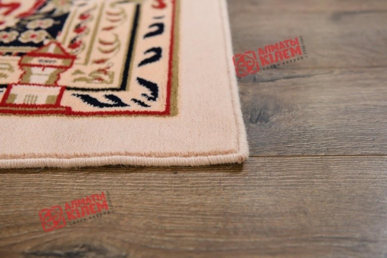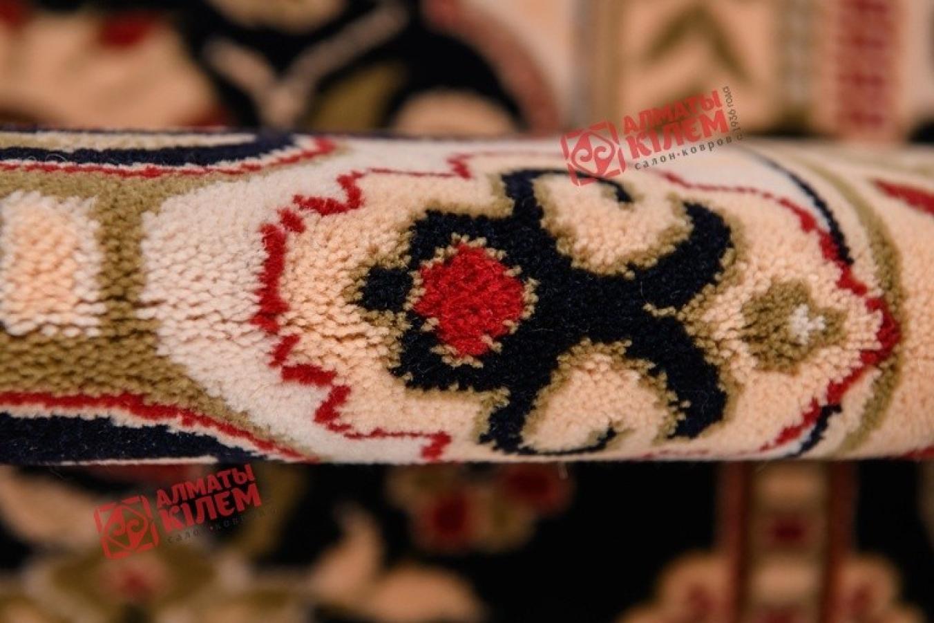 Изысканный классический ковер, выполненный из натуральной шерсти, станет главным украшением богато обставленных домашних, офисных и административных интерьеров. Выполненный в лучших традициях коврового дела, он займет собой центральное место абсолютно в любом помещении. Бежево-кремовое полотно со средним шерстяным ворсом не только оставляет после себя приятные тактильные ощущения, но и смотрится невероятно роскошно и изыскано. Оно украшено медальоном с флористическим узором, обрамляющим ажурную розетку. Ковер декорирован оригинальным бордюром, отличающимся от привычного багетного типа, а представляет собой темное кружево, повторяющее форму павлиньих хвостов.