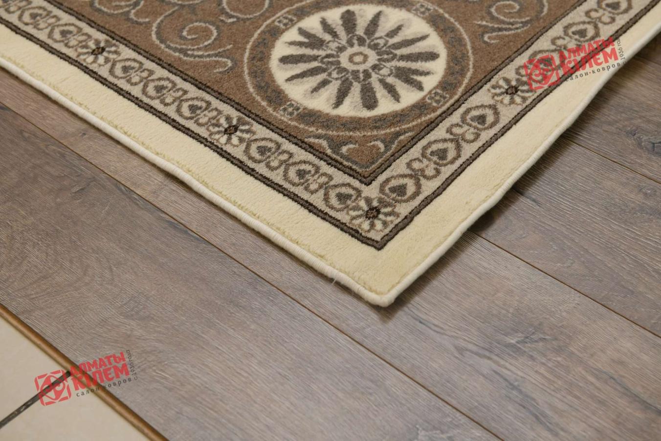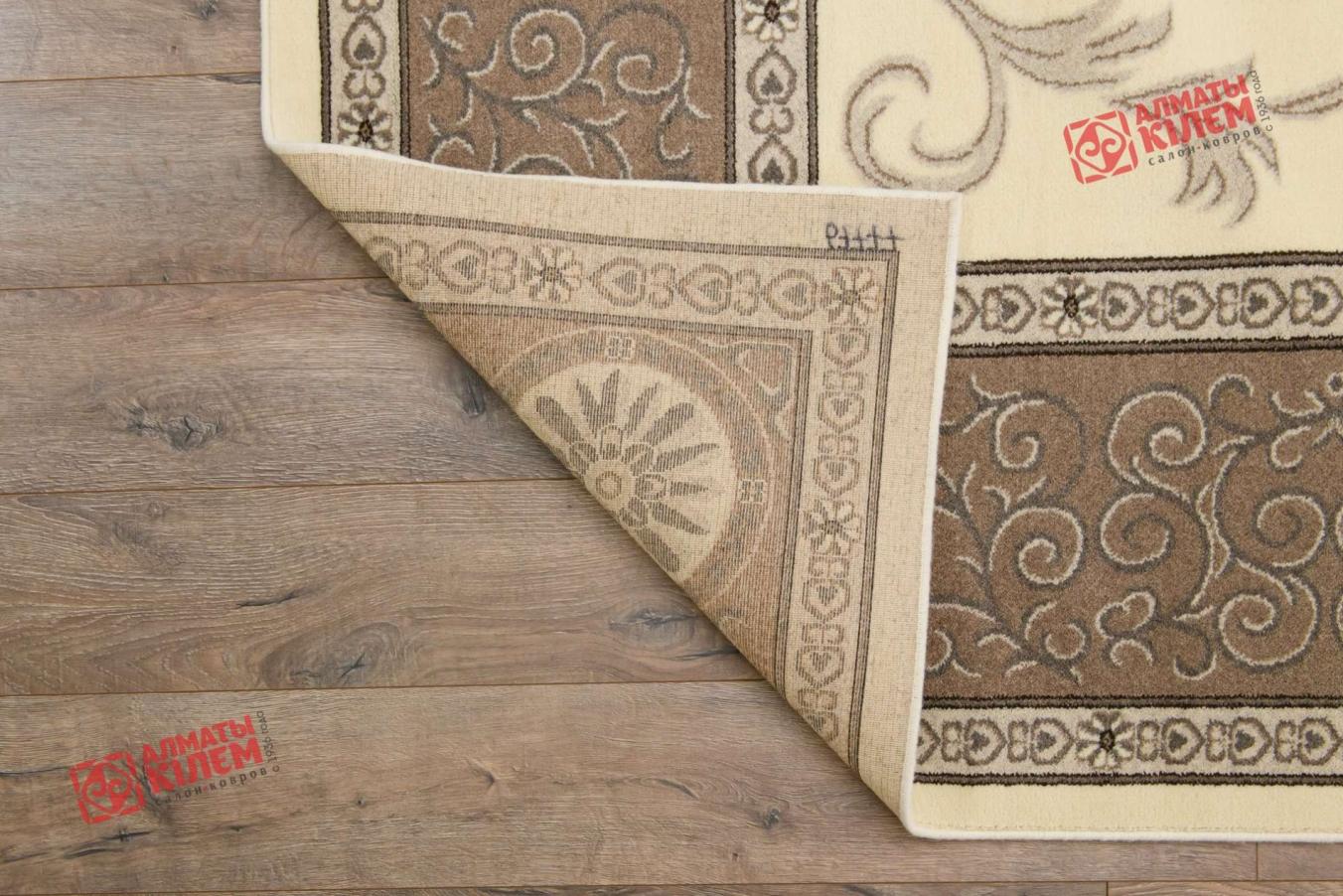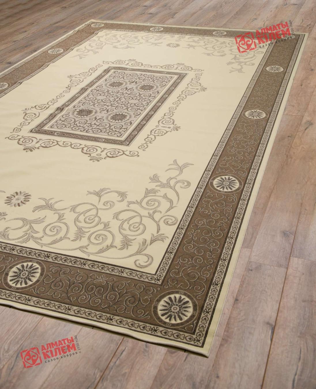 Классический ковер из стопроцентно натуральной шерсти станет великолепным украшением для богато обставленных домашних, офисных, административных интерьеров. Модель из коллекции «Чингис ковер» сразу же приковывает к себе внимание, но смотрится утонченно и изысканно. Традиционный дизайн приобретает совершенно иное звучание, напоминающее собой восточный стиль. Центральную часть украшает роскошная розетка в виде прямоугольника с ажурным узором внутри и снаружи. Полотно декорировано флористическим мотивом. Орнамент выполнен в темно-бежевом исполнении. Модель завершает бордюр, который повторяет собой основной узор, но рисунок в контраст медальону светлый, а фон темный.