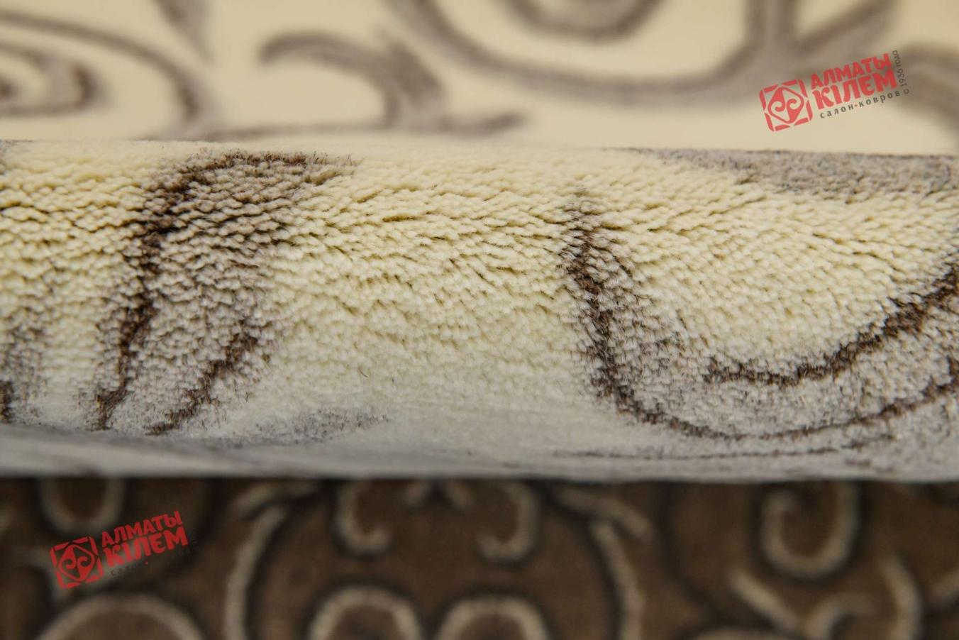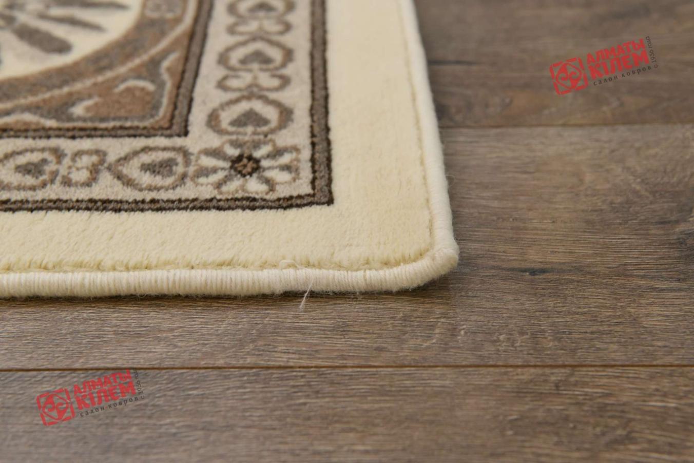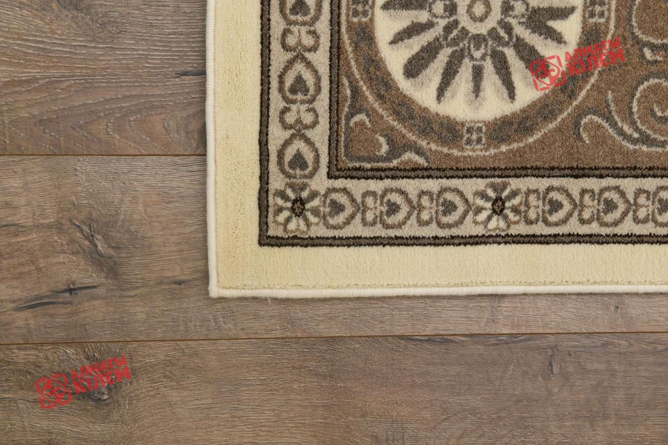 Классический ковер из стопроцентно натуральной шерсти станет великолепным украшением для богато обставленных домашних, офисных, административных интерьеров. Модель из коллекции «Чингис ковер» сразу же приковывает к себе внимание, но смотрится утонченно и изысканно. Традиционный дизайн приобретает совершенно иное звучание, напоминающее собой восточный стиль. Центральную часть украшает роскошная розетка в виде прямоугольника с ажурным узором внутри и снаружи. Полотно декорировано флористическим мотивом. Орнамент выполнен в темно-бежевом исполнении. Модель завершает бордюр, который повторяет собой основной узор, но рисунок в контраст медальону светлый, а фон темный.
