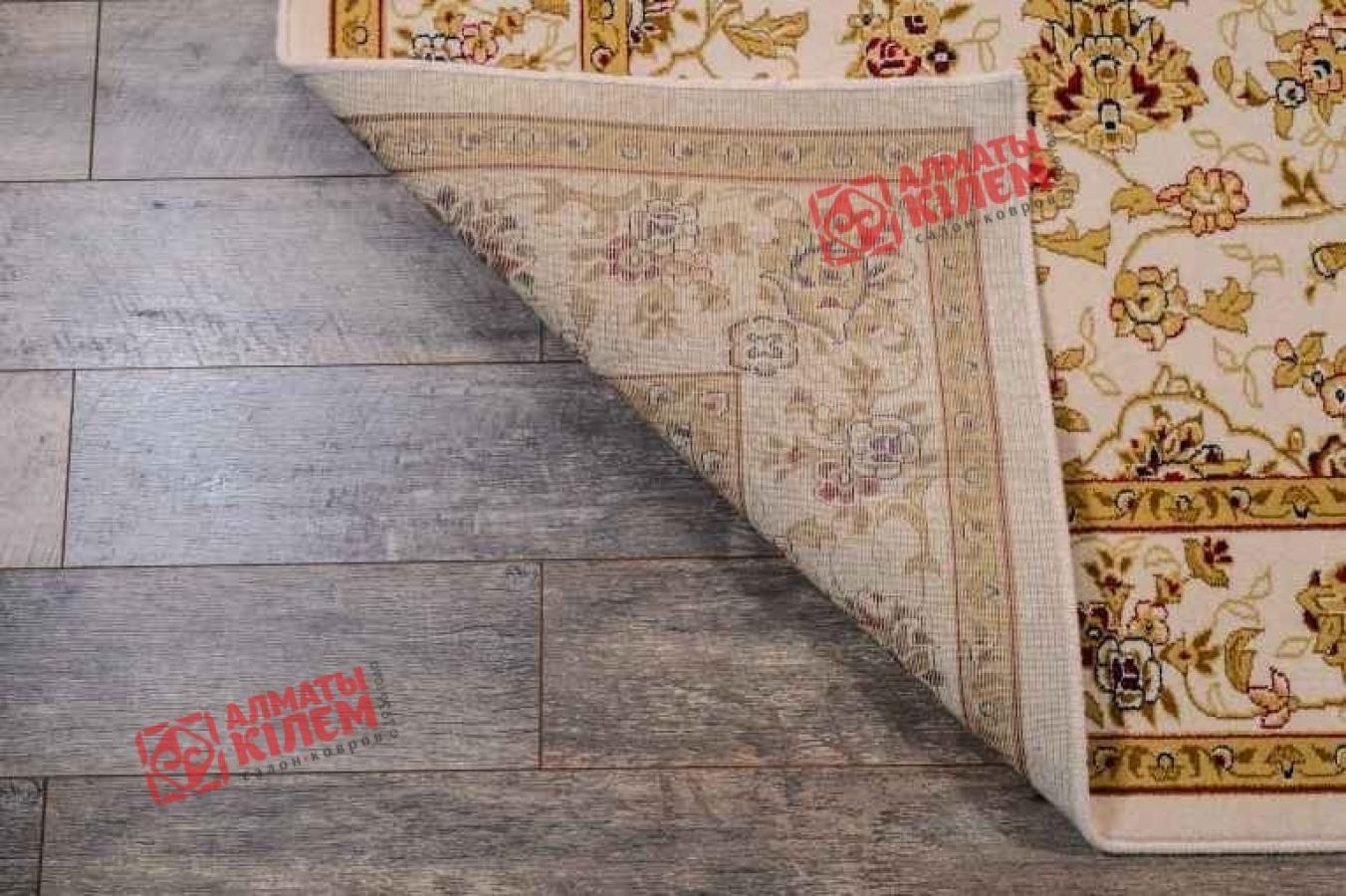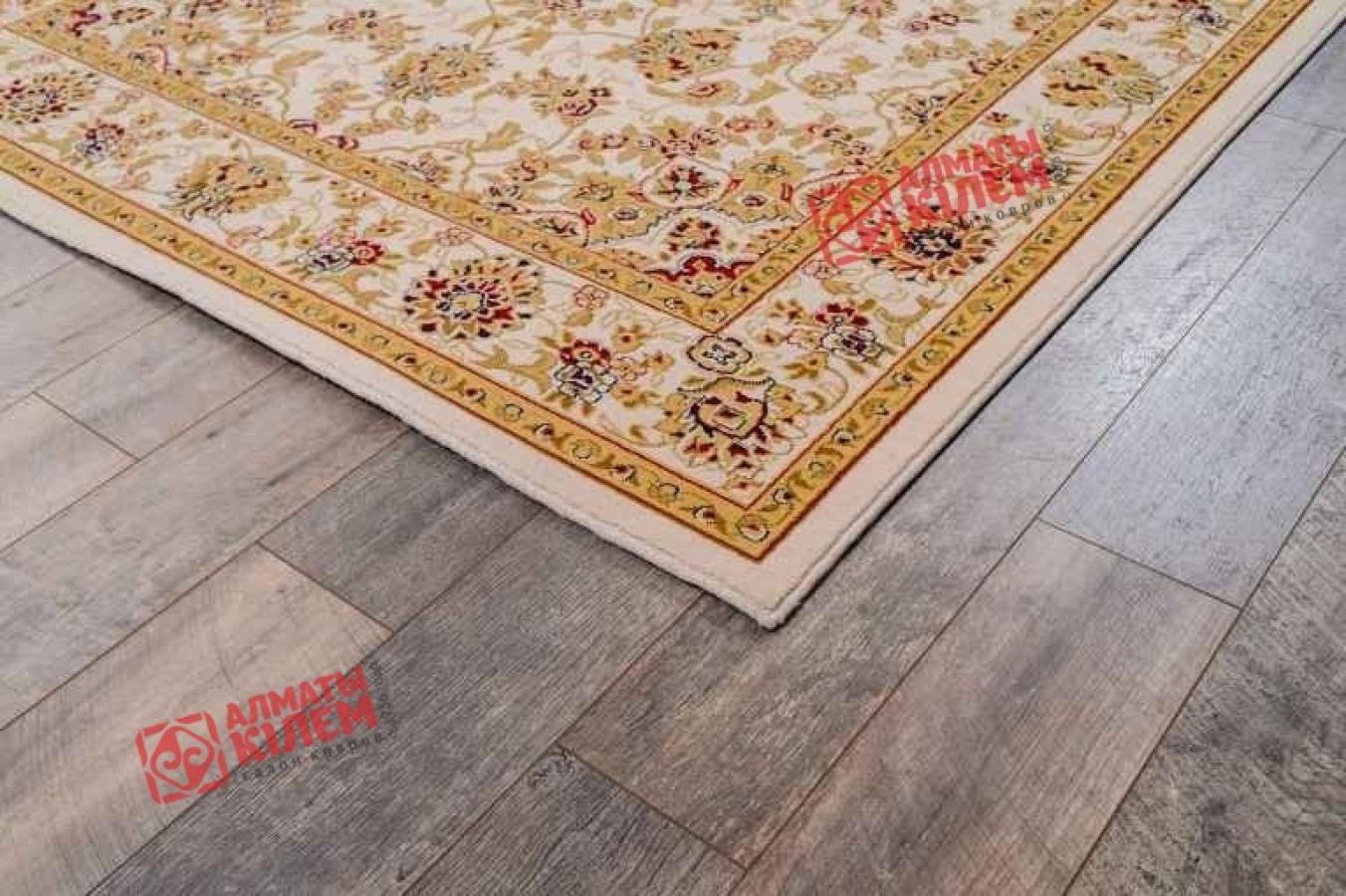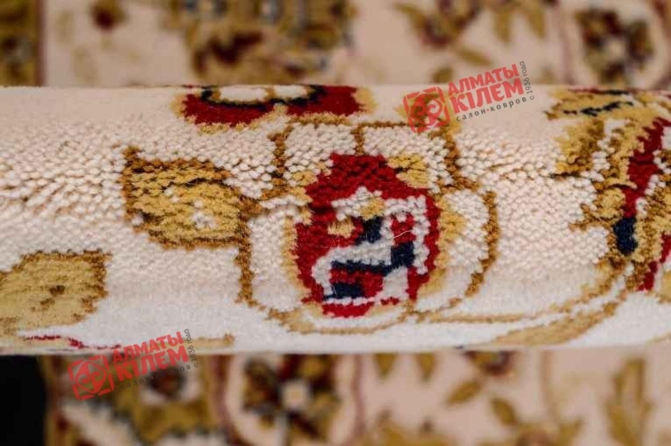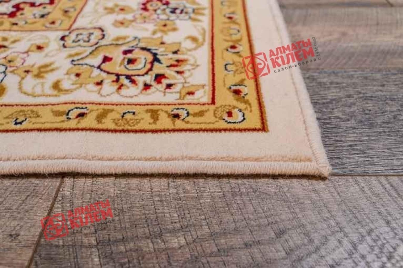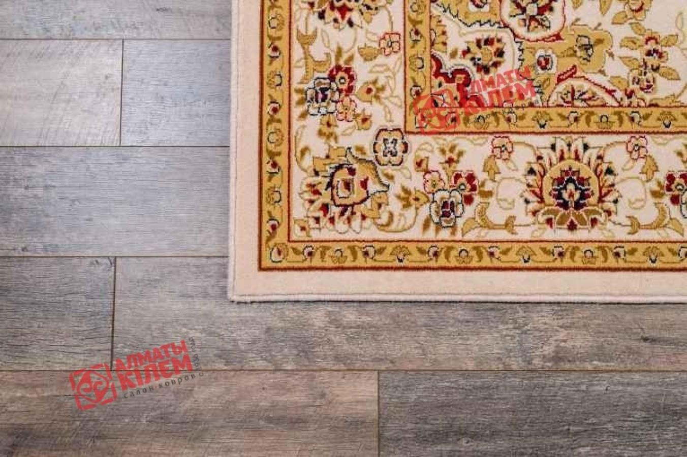 Великолепный ковер, выполненный из стопроцентной натуральной шерсти, поражает роскошью своей фактуры и красивым дизайном. Он невероятно приятен на ощупь и оставляет после себя приятные тактильные ощущения. Изысканный медальон с флористическим бежевым узором и ажурной розеткой по центру на бежевом фоне смотрится красиво и изысканно. Центральный рисунок обрамлен широким бордюром с широкой каймой. Он тоже украшен цветочным мотивом, который крупнее основного. Особую изюминку покрытию придают вкрапления бордового и золотистого, который будто покрывает весь орнамент. Цветочный ковер прекрасно впишется в классические домашние и офисные интерьеры.