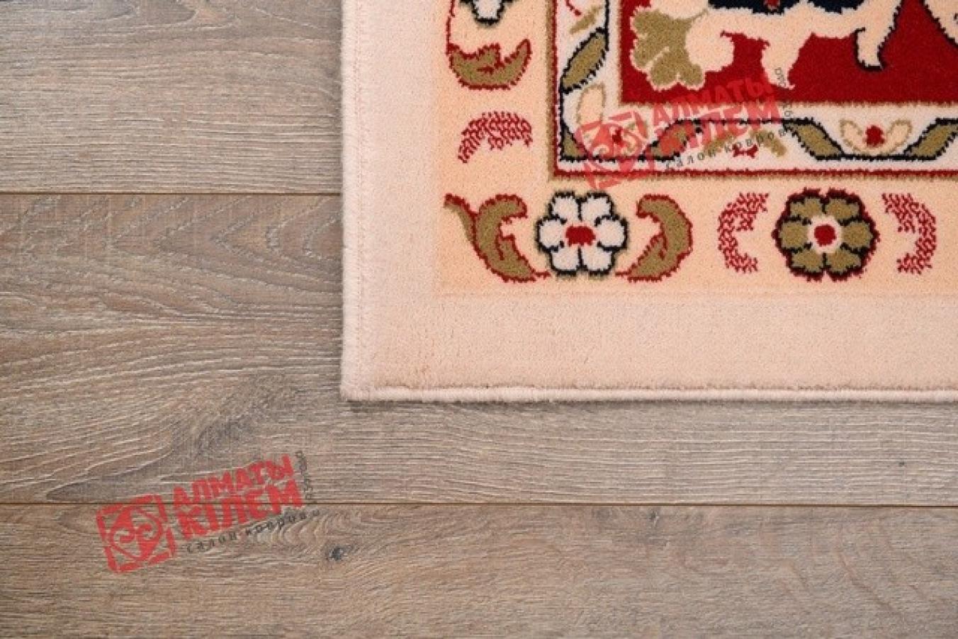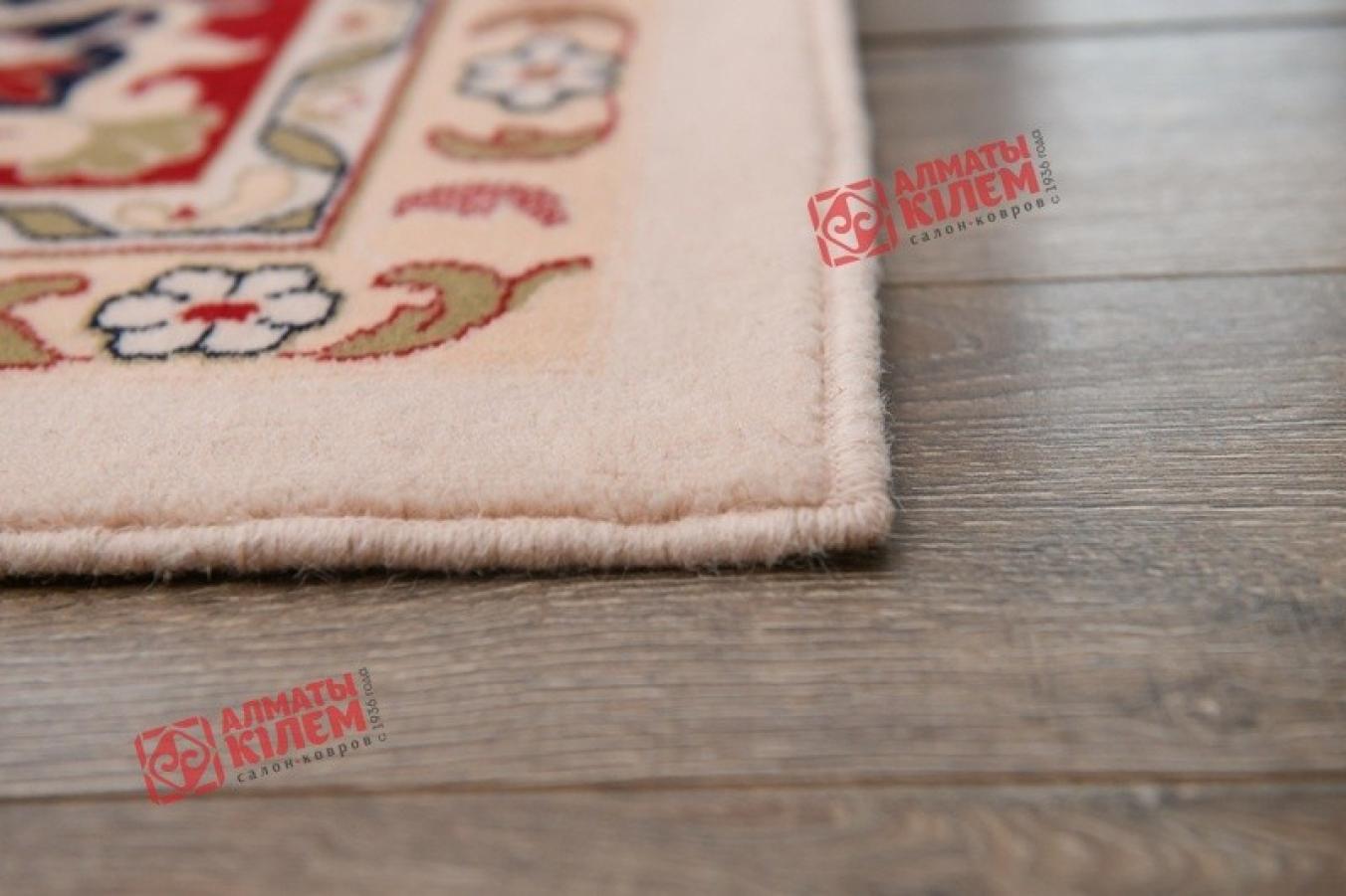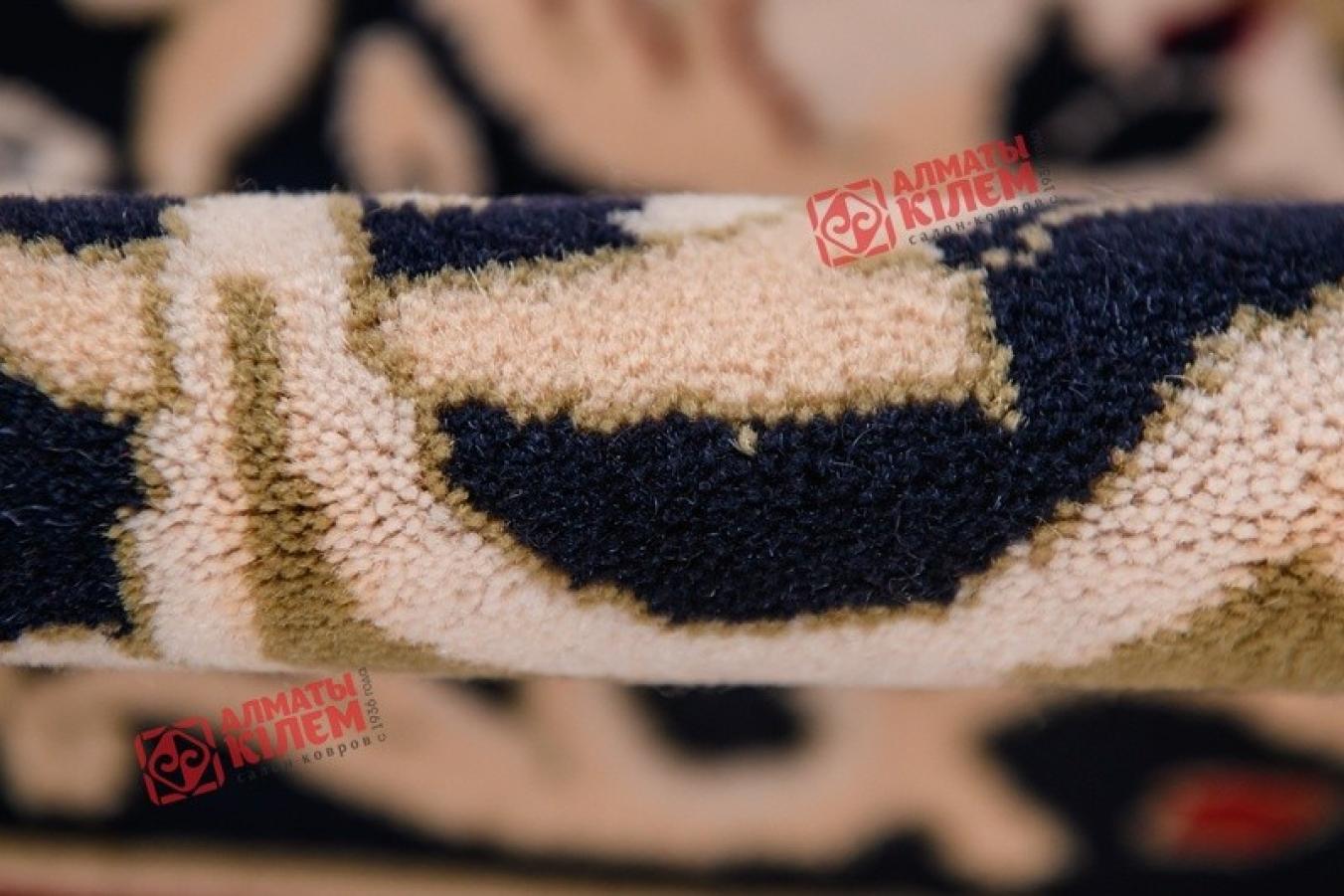 Великолепный ковер из натуральной шерсти с ворсом средней высоты создает не просто комфортную и уютную обстановку, но и придает интерьерам подчеркнутую дороговизну и богатство убранства. Он прекрасно вписывается в домашние и административные интерьеры. Модель из коллекции «Чингис ковер» универсальна. Она отлично смотрится в любой комнате, офисе и кабинете. Классический дизайн позволяет использовать ковровое покрытие в помещениях с минимальным количеством мебели и декоративных предметов. Бежевый фон винтажного ковра украшает роскошный медальон с ажурной розеткой в красно-золотистом оттенке с синим, обрамленным красивым бордюром с узором, переркликающимся с основным рисунком.