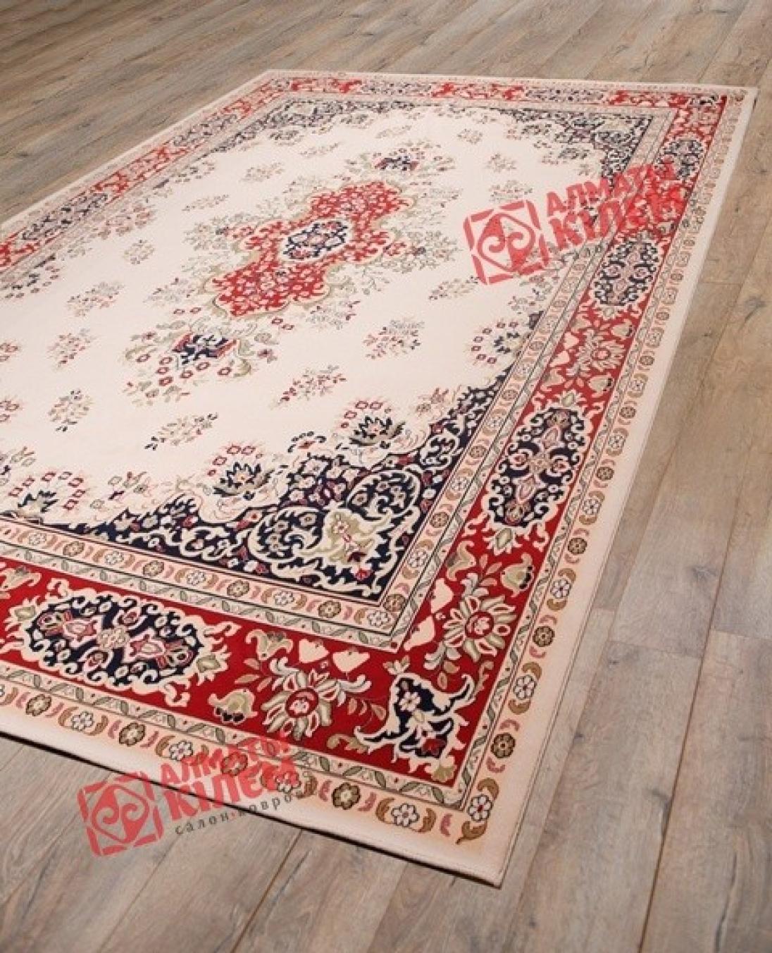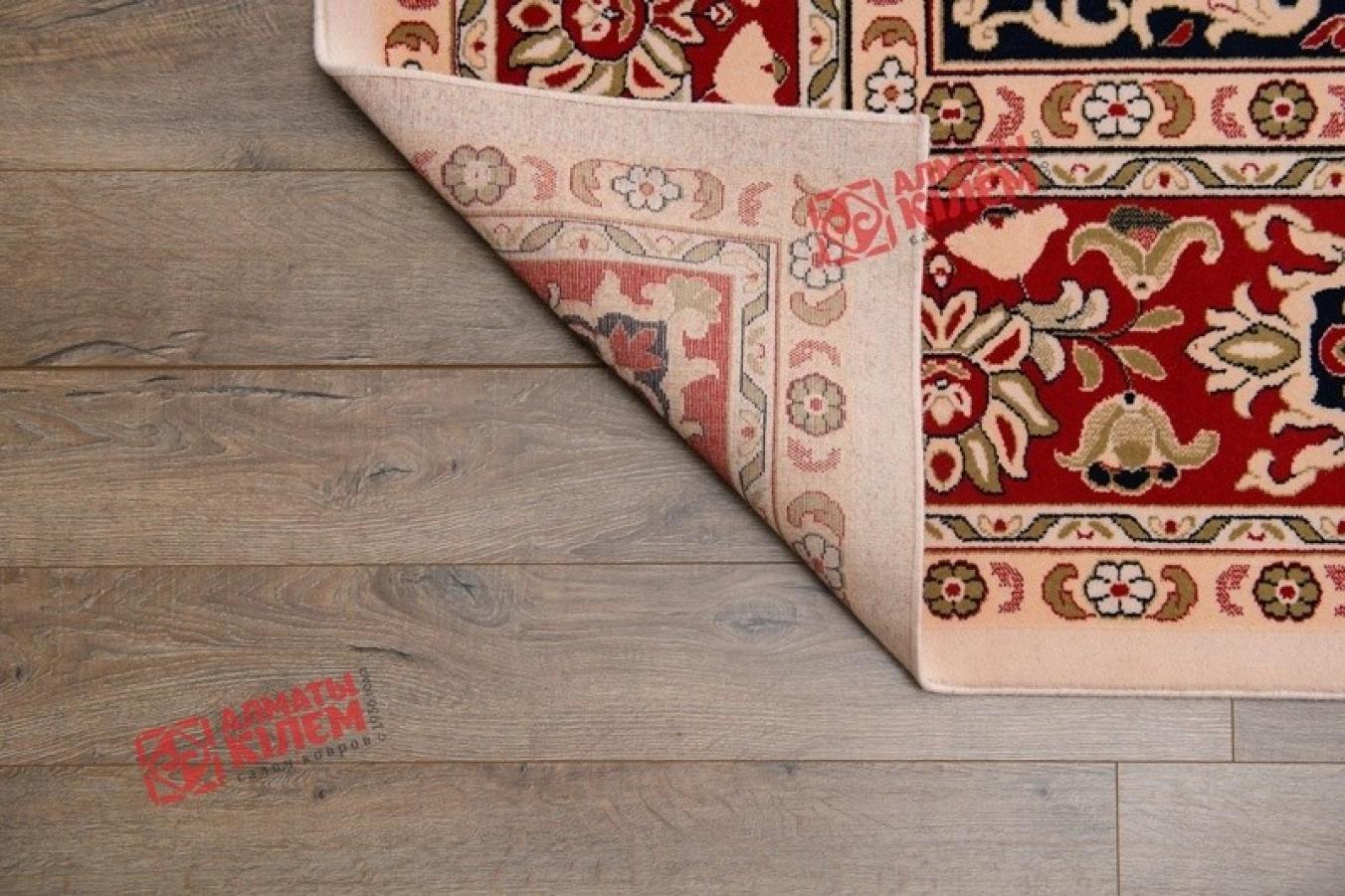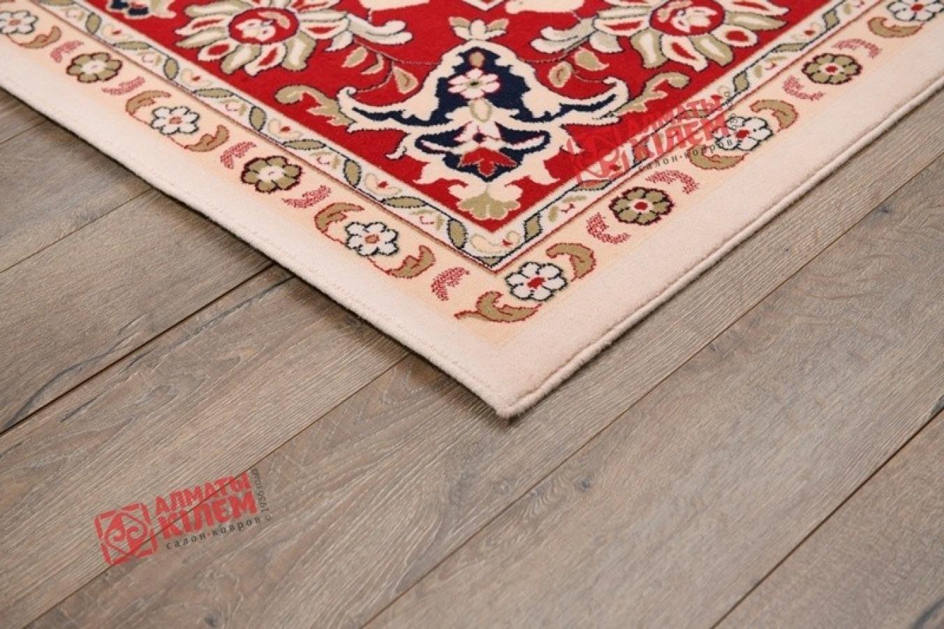 Великолепный ковер из натуральной шерсти с ворсом средней высоты создает не просто комфортную и уютную обстановку, но и придает интерьерам подчеркнутую дороговизну и богатство убранства. Он прекрасно вписывается в домашние и административные интерьеры. Модель из коллекции «Чингис ковер» универсальна. Она отлично смотрится в любой комнате, офисе и кабинете. Классический дизайн позволяет использовать ковровое покрытие в помещениях с минимальным количеством мебели и декоративных предметов. Бежевый фон винтажного ковра украшает роскошный медальон с ажурной розеткой в красно-золотистом оттенке с синим, обрамленным красивым бордюром с узором, переркликающимся с основным рисунком.