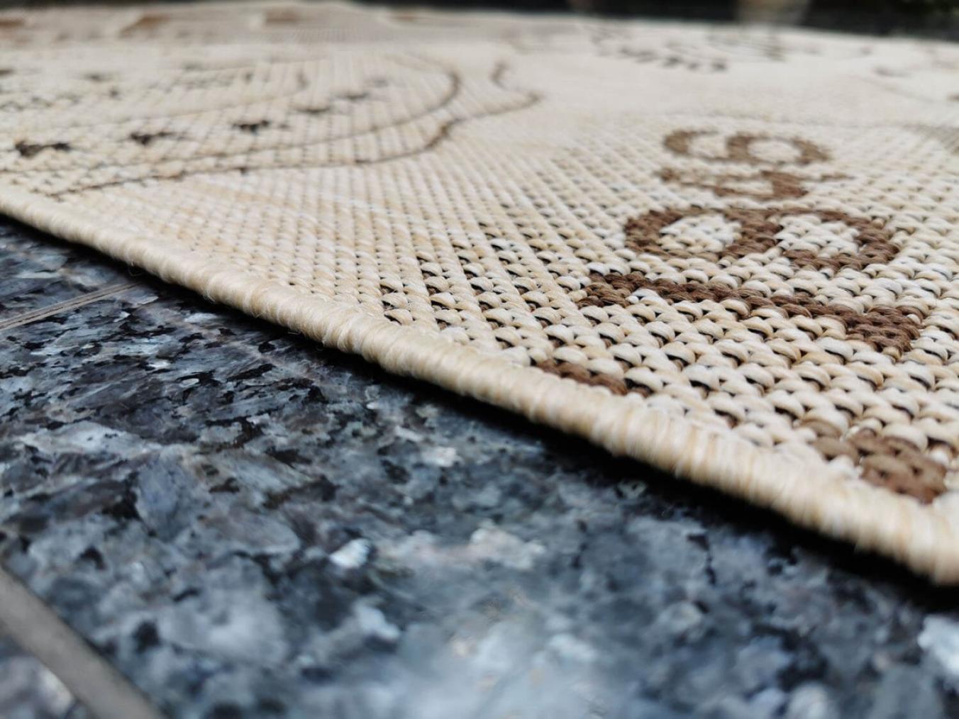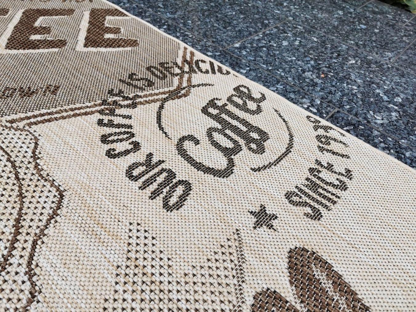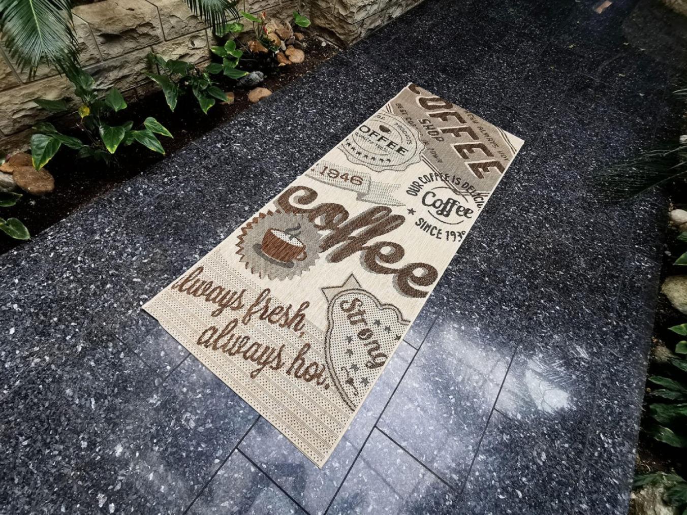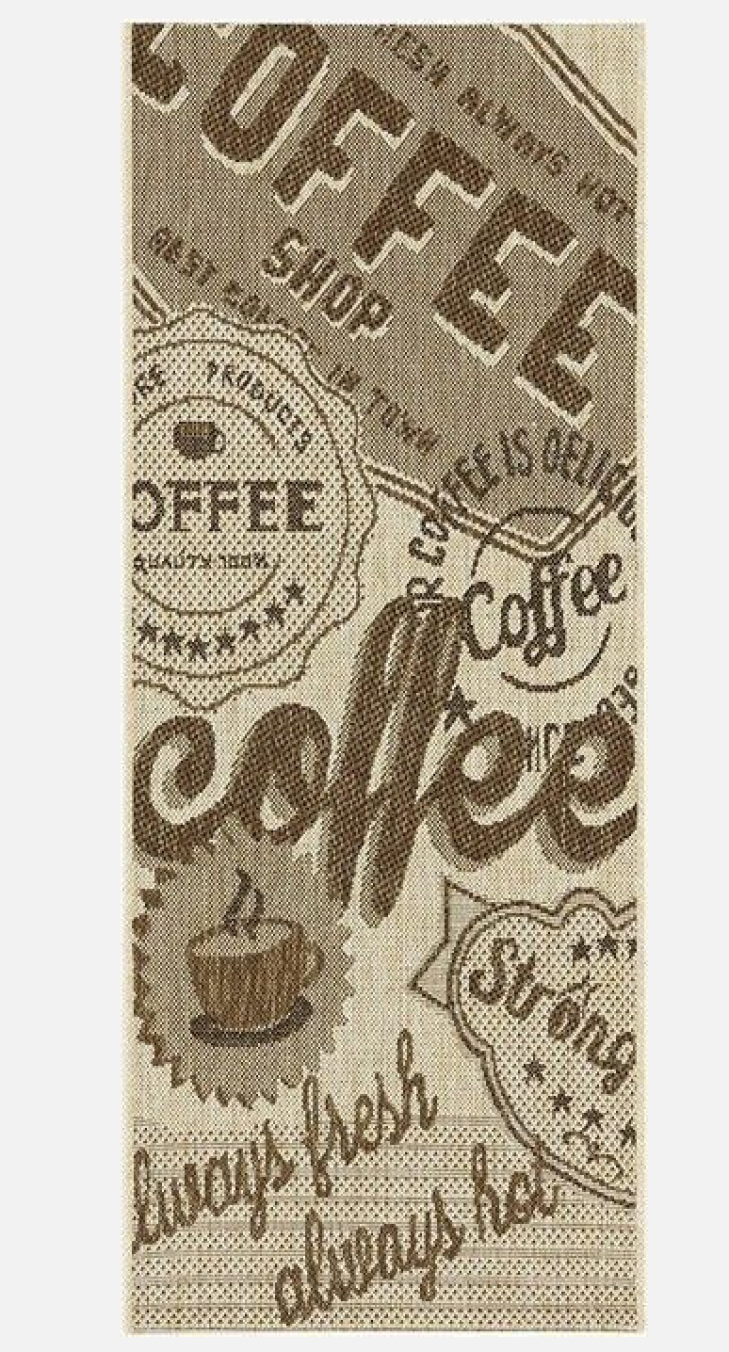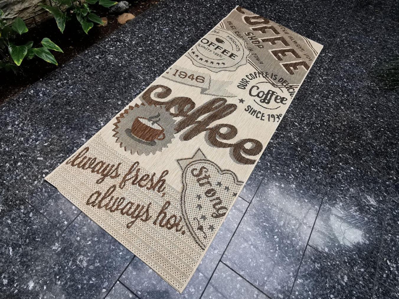 Европейское качество и оригинальный тематический современный дизайн циновки в бежевой и коричневой палитре делают дорожку идеальным выбором не только для кухни и столовой, но и для кофейни. Безворсовый ковер бельгийского производства из полипропилена с добавлением джута в основание выполнен в тематике «кофе». Полипропилен отличается устойчивостью к воздействию перепадов температуры и влажности, а отсутствие ворсинок максимально облегчает уход за полотном.