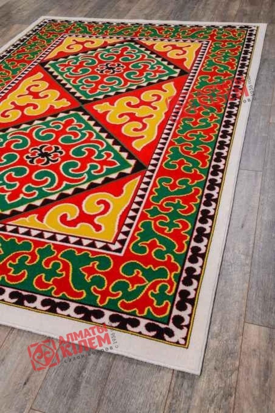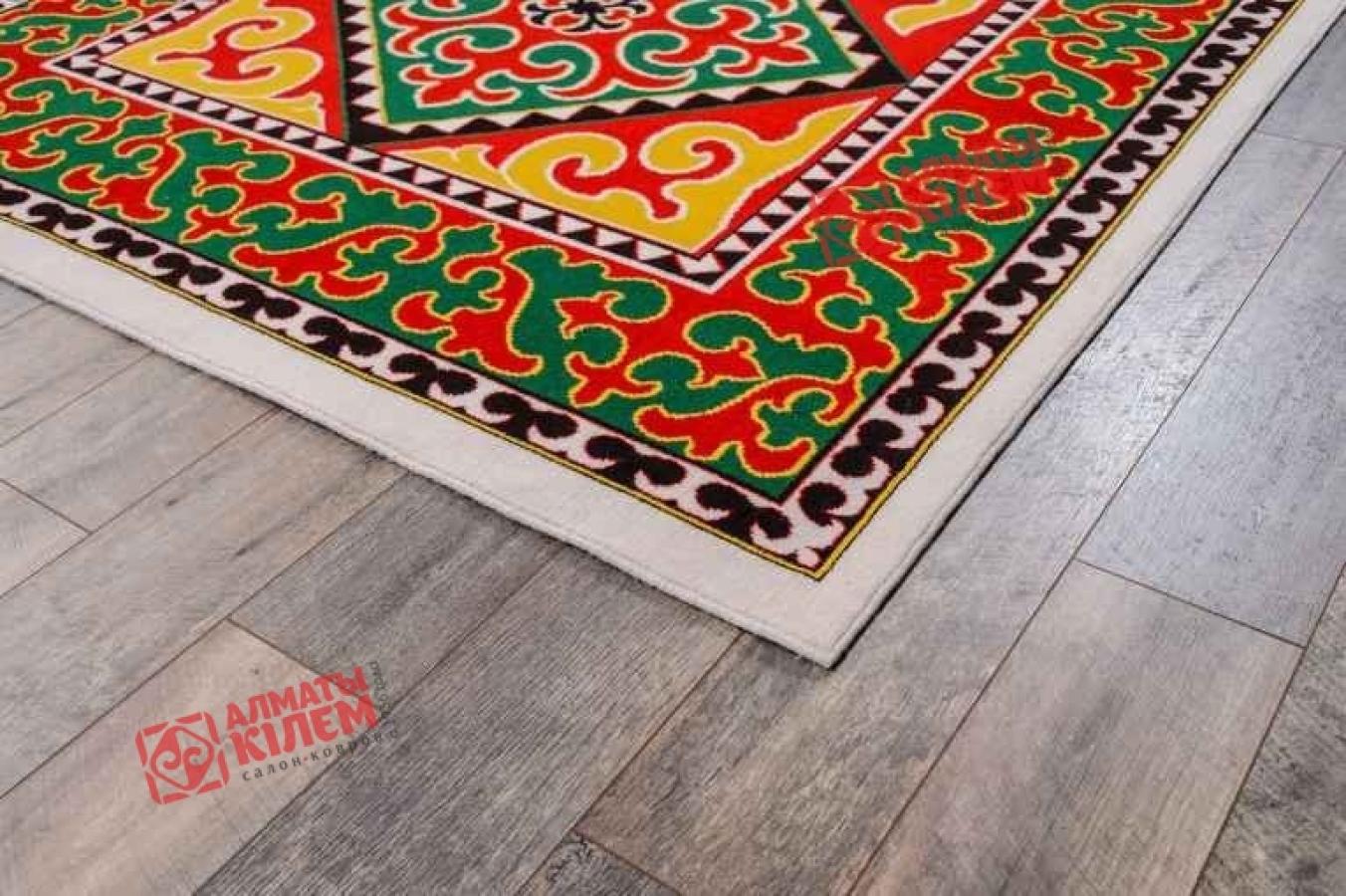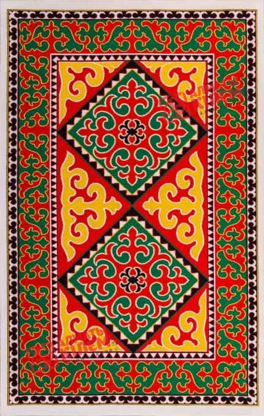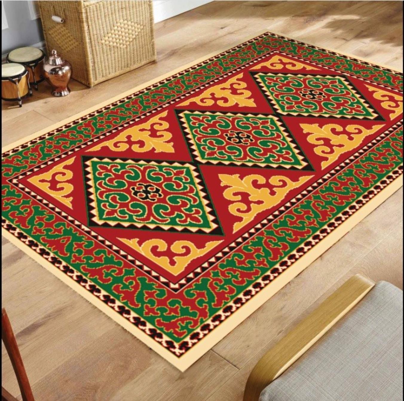 Неповторимый дизайн восточного ковра станет идеальным выбором для традиционных интерьеров с этническим мотивом. Он одинаково великолепно и роскошно будет смотреться в квартирах, домах, офисах и кабинетах, становясь главным акцентным элементов. В центральной части геометрического ковра два ромба с казахско-монгольским узором, напоминающим серьги молодой красавицы. Красный орнамент на зеленом фоне с синей сердцевиной и рамкой перекликается с основным оттенком и бордюром.