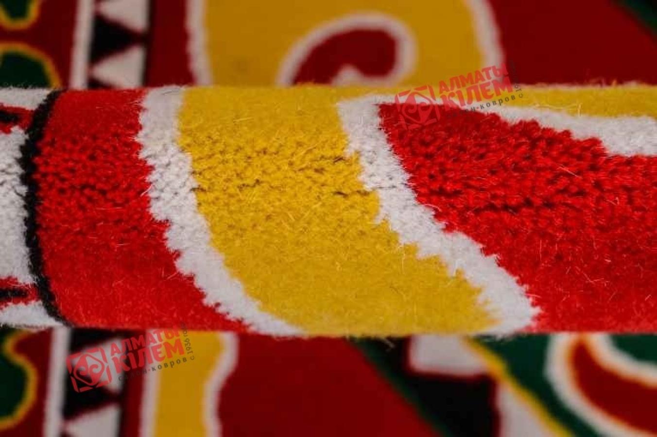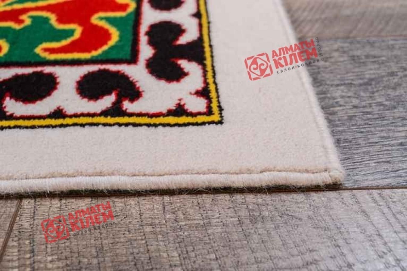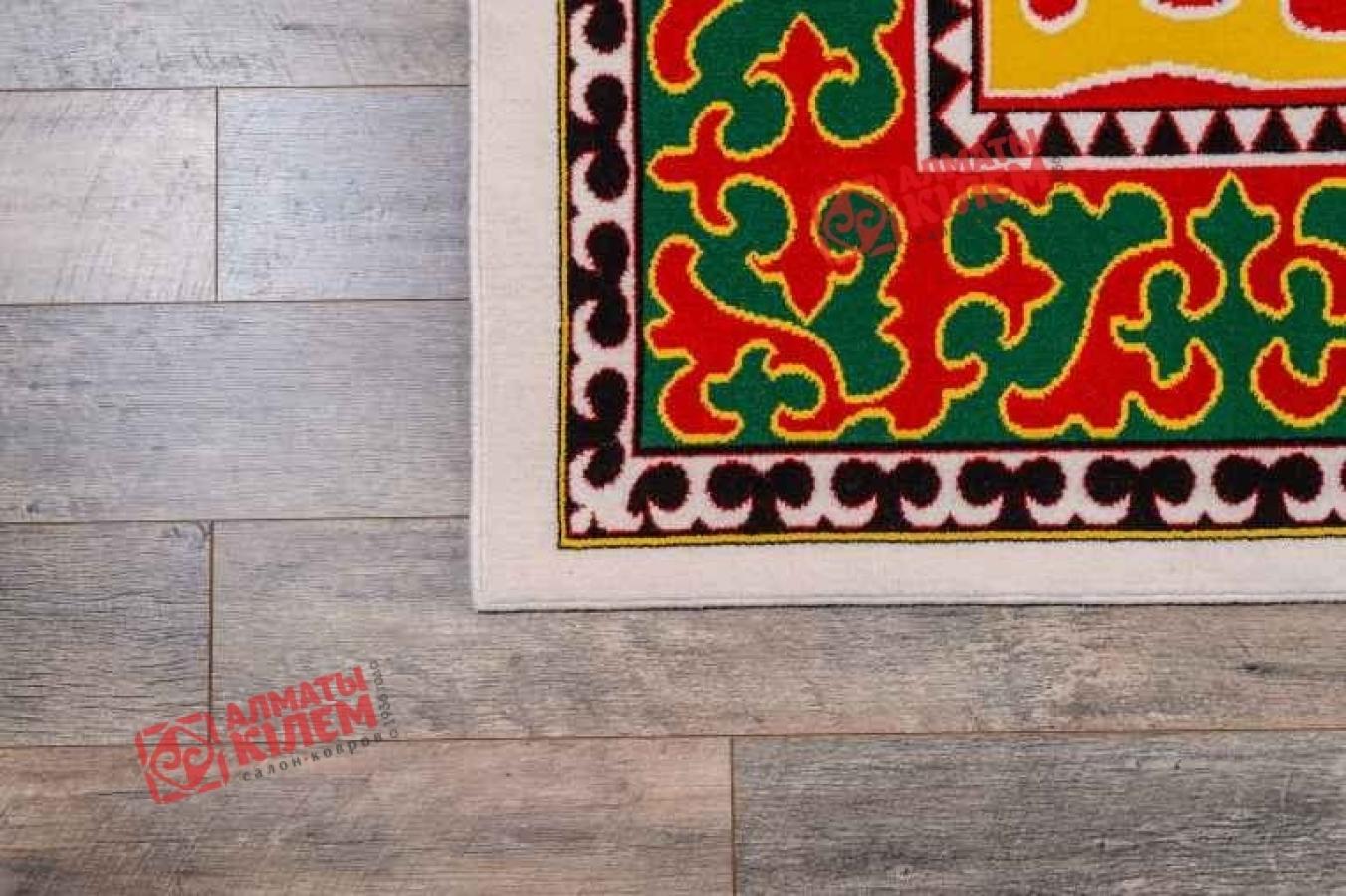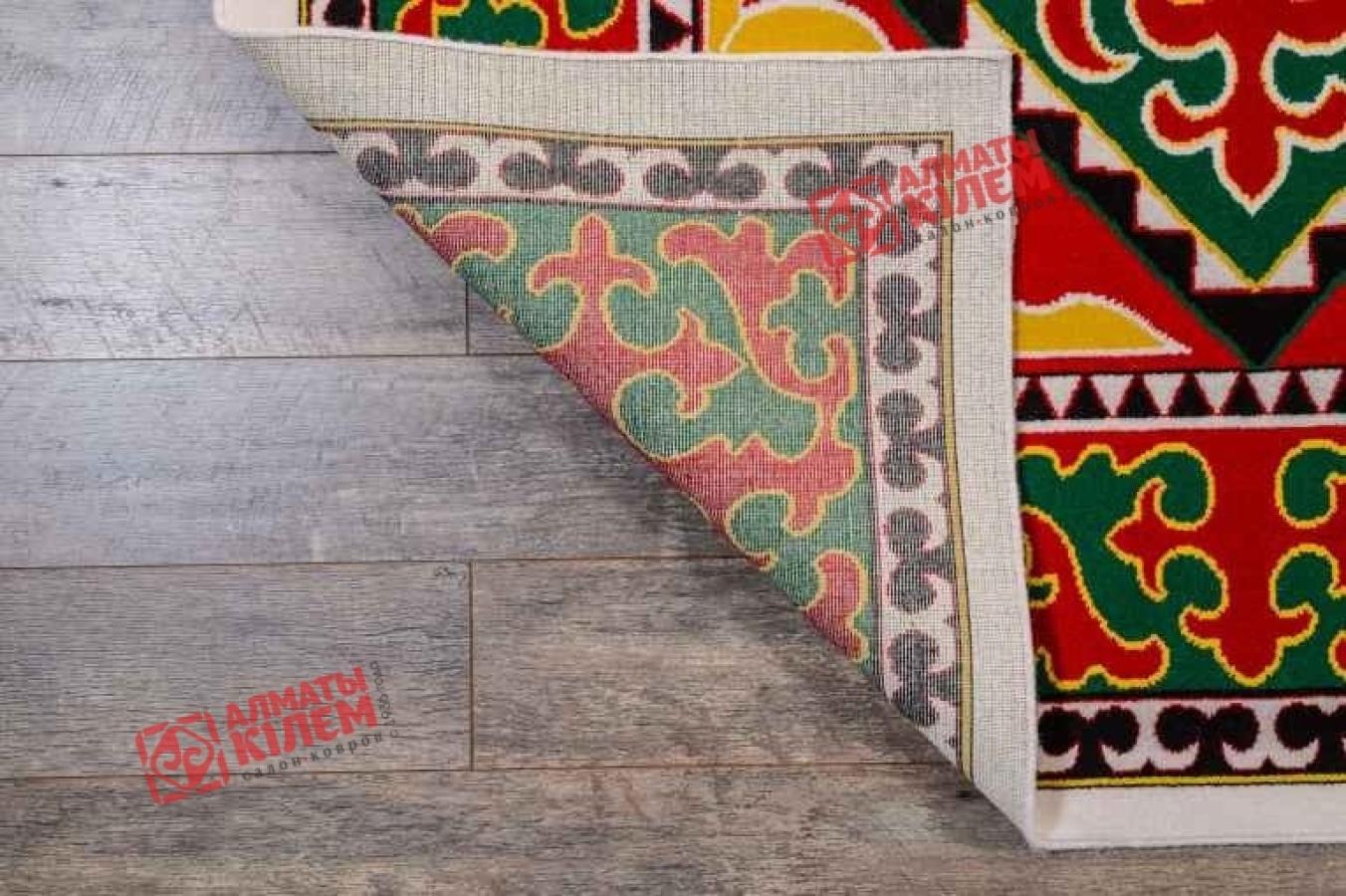 Неповторимый дизайн восточного ковра станет идеальным выбором для традиционных интерьеров с этническим мотивом. Он одинаково великолепно и роскошно будет смотреться в квартирах, домах, офисах и кабинетах, становясь главным акцентным элементов. В центральной части геометрического ковра два ромба с казахско-монгольским узором, напоминающим серьги молодой красавицы. Красный орнамент на зеленом фоне с синей сердцевиной и рамкой перекликается с основным оттенком и бордюром.