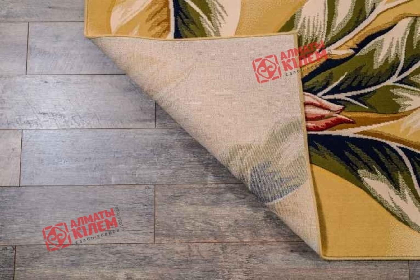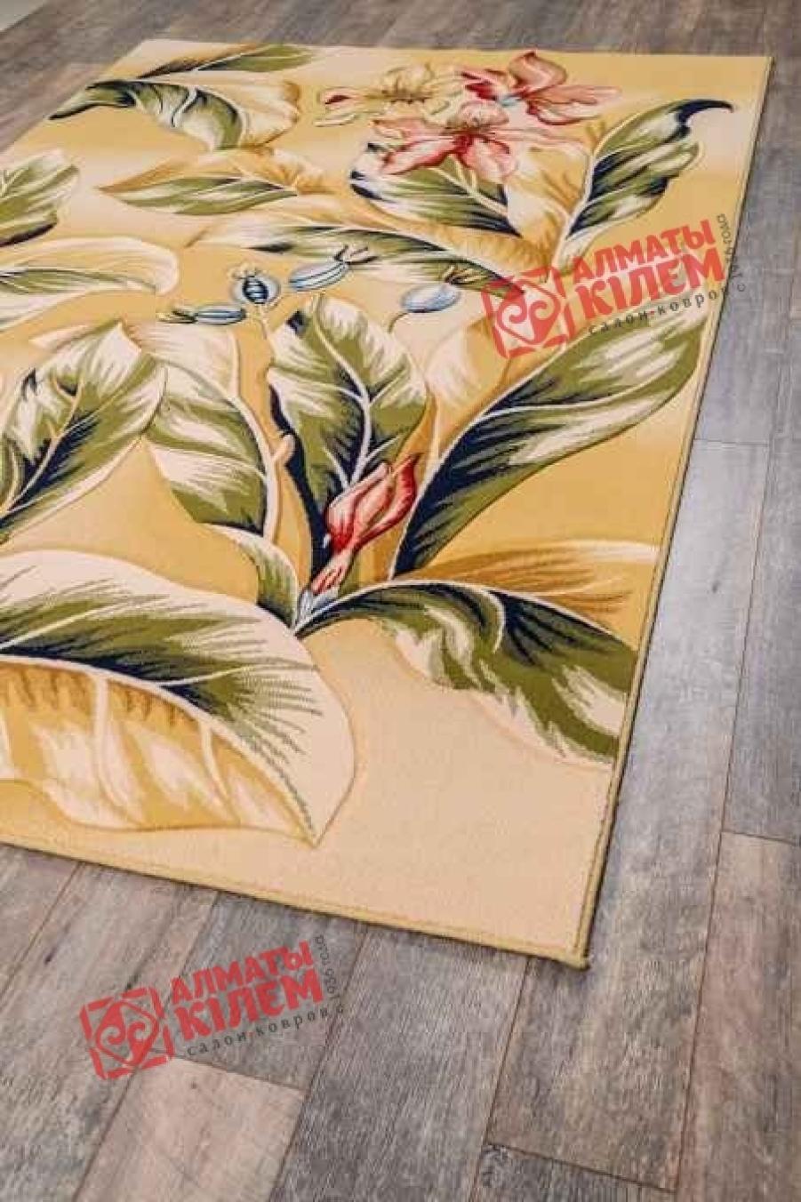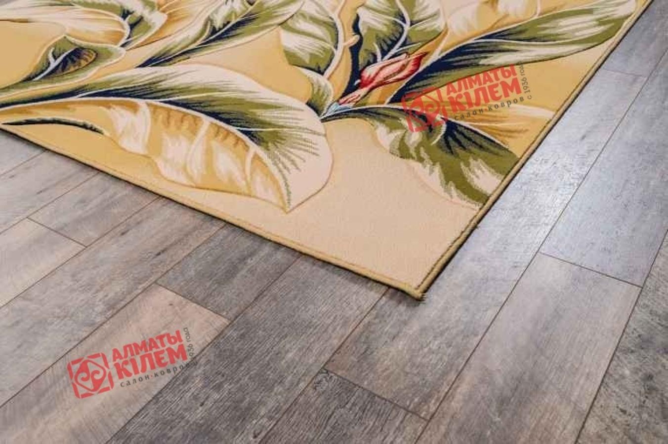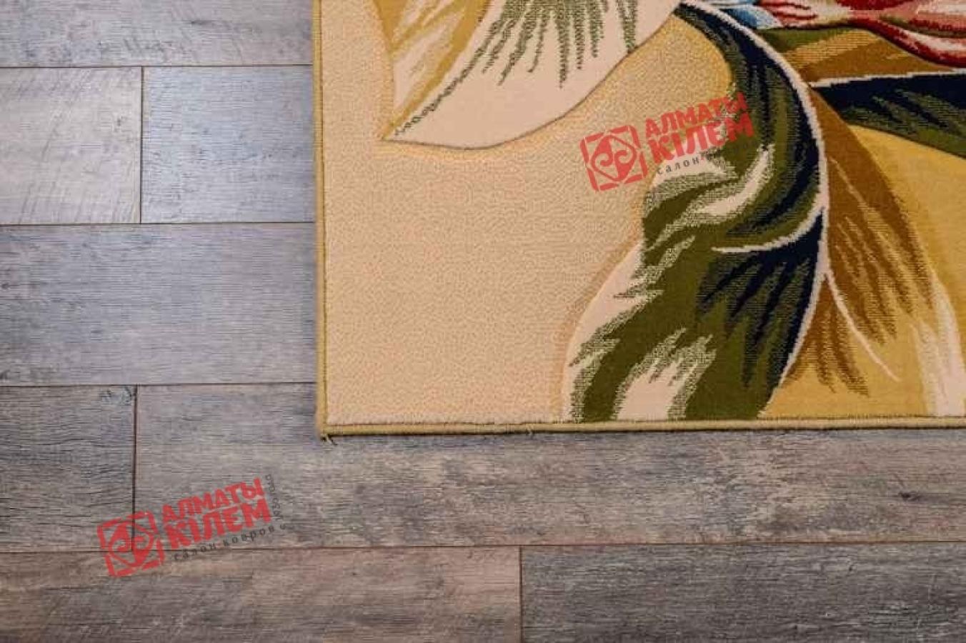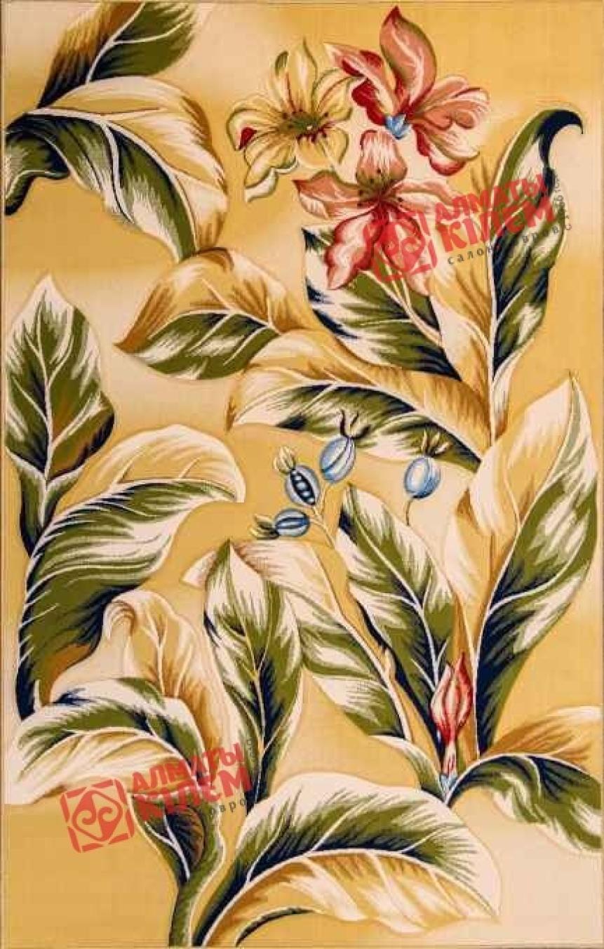Напольный цветочный ковер из натуральной шерсти с полиамидом, который придает изделию износоустойчивость и эластичность, смотрится роскошно и изысканно. Покрытие придает обстановке современных интерьеров квартир, домов, офисов и кабинетов особую атмосферу уюта и позитивного настроения. На песочно-бежевом полотне словно на холсте изображены роскошные цветы. Великолепные «букетики» с крупными изогнутыми листьями золотисто-зеленого оттенка с голубоватыми бутонами и бордово-красными крупными цветками. Ковер выглядит будто картина, нарисованная художником. Грамотно подобранная гамма позволяет сочетать покрытие с монохромными, пастельными, яркими интерьерами.