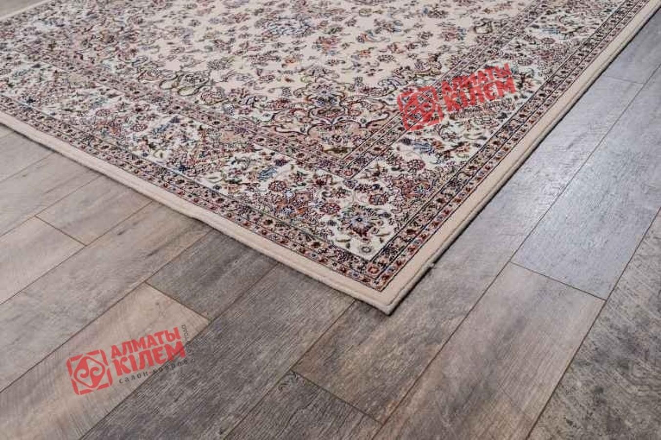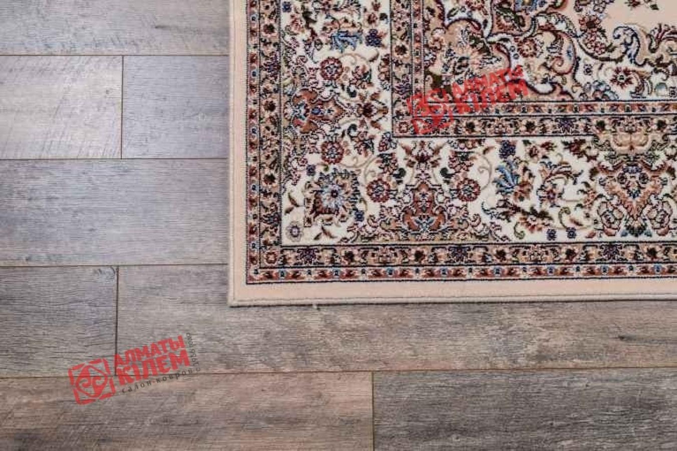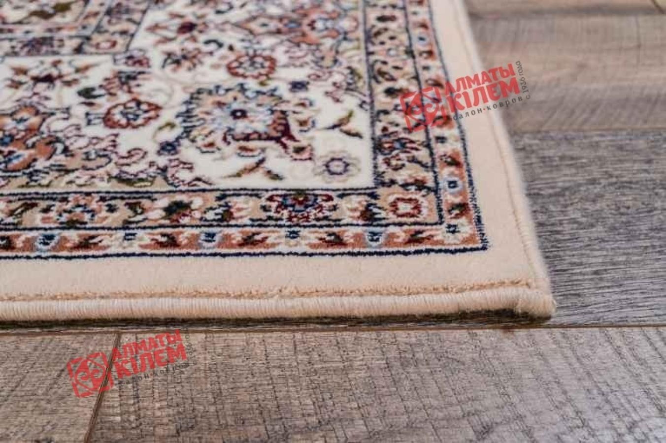 Роскошный классический ковер в бежево-кремовой палитре из коллекции «Хунну» прекрасно сочетается с аналогичного дизайна интерьерами. Он великолепно дополняет собой богатые обстановки гостиных, спален, столовых, прихожих, офисов и кабинетов. Примесь полиамида представляет собой добавку, которая повышает эксплуатационные свойства коврового покрытия. Полотно декорировано медальоном и бордюром. Оно украшено флористическим узором и листочками с витиеватыми изгибами. Средний ворс надежно сидит в подложке из хлопка, полиэстера, джута и имеет плотность 680 000 на квадратный метр, оставляя после себя исключительно приятные тактильные ощущения.