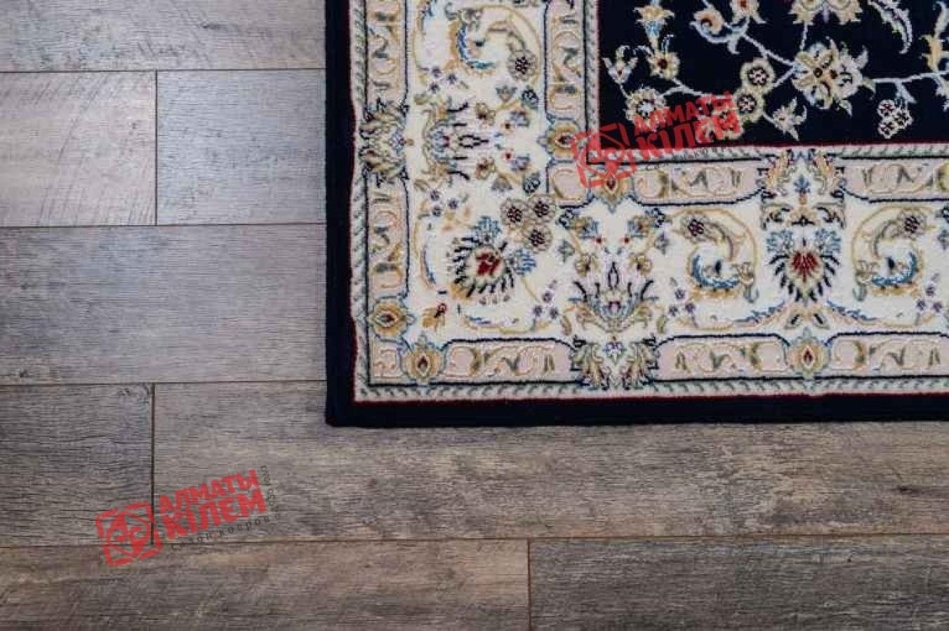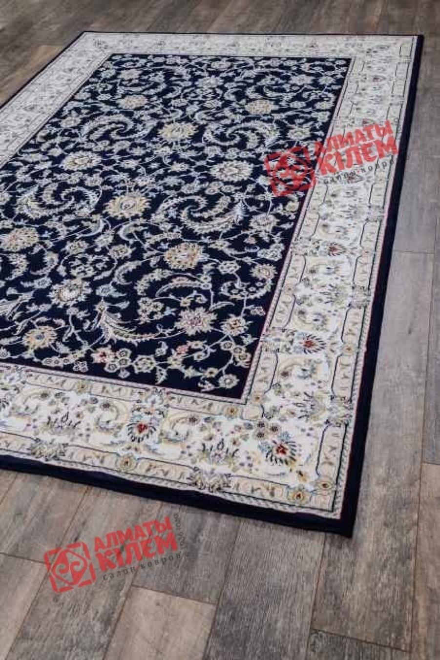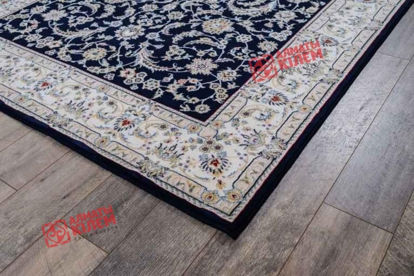 Шикарный классический ковер из коллекции «Хунну» с бежево-кремовым флористическим узором на темно-синем фоне идеально вписывается в интерьере богато обставленных квартир, домов, особняков, офисов и кабинетов. Особую изысканность дизайну придают традиционные элементы, среди которых широкий светлый бордюр, обрамляющий прямоугольный медальон с цветами бежевого оттенка. Полотно имеет среднюю высоту, которое оставляет после себя исключительно приятные тактильные ощущения. Благодаря полиамиду, шерстяное изделие отличается не только внешней красотой и изысканным блеском, но и становится гораздо более устойчивым к потертостям и загрязнениям.