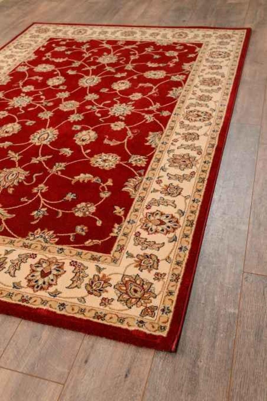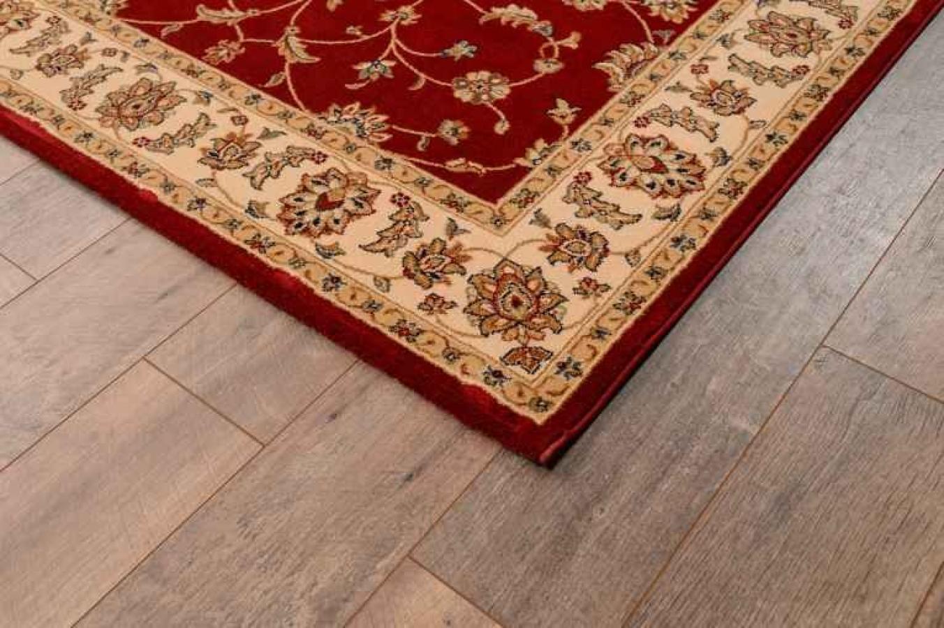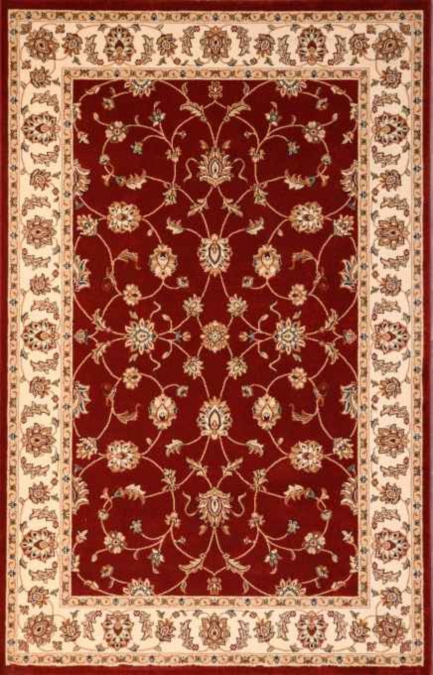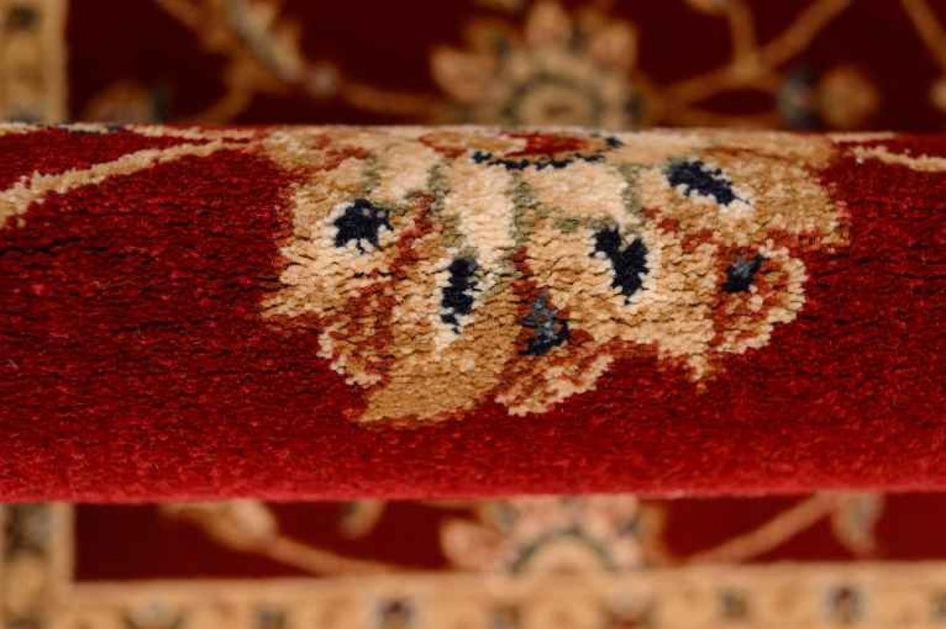 Шикарный напольный ковер в классическом стиле станет прекрасным украшением домашних, офисных и административных интерьеров. Ковер из натуральной шерсти смотрится красиво и роскошно. Оно «соткано» в лучших традициях создания персидских ковров ручной работы, декорировано центральным медальоном и бордюром. Сочетание красного центрального узора и бежевого обрамления образуют эффектный контраст. Завершает рисунок золотистый флористический мотив. Он представляет собой мелкие цветочки с витиеватыми стеблями и листочками, нанесенными на всю поверхность красной розетки в середине. Орнамент бежевого бордюра перекликается с центральным мотивом, но имеет более крупные размеры.