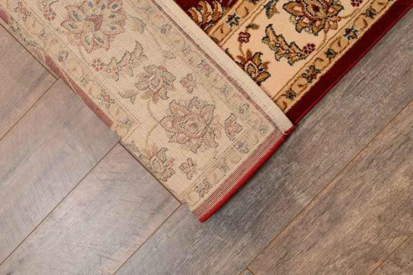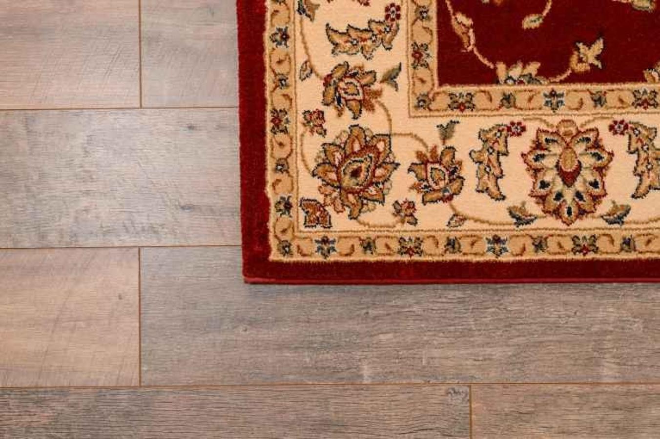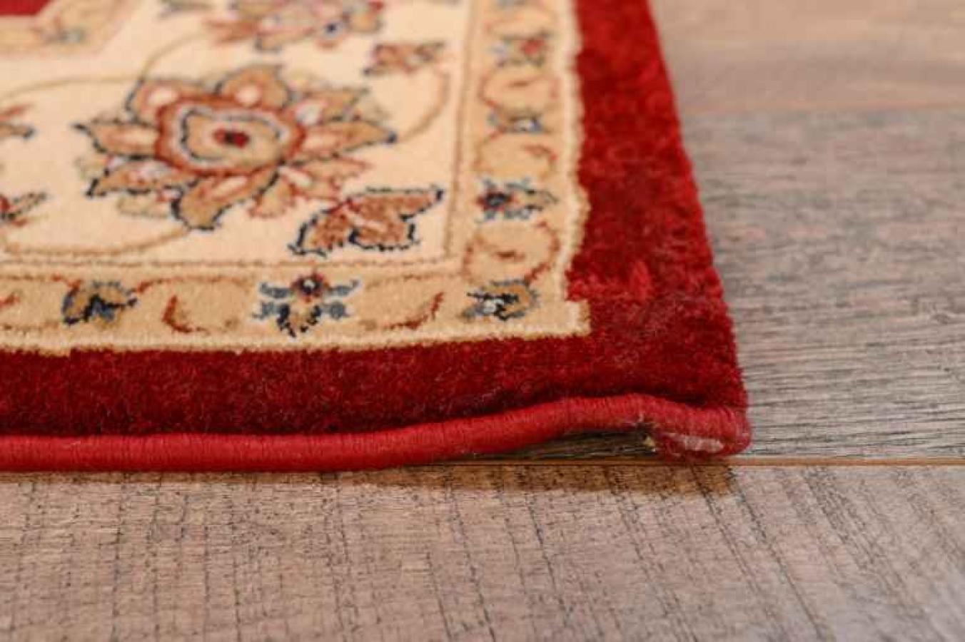 Шикарный напольный ковер в классическом стиле станет прекрасным украшением домашних, офисных и административных интерьеров. Ковер из натуральной шерсти смотрится красиво и роскошно. Оно «соткано» в лучших традициях создания персидских ковров ручной работы, декорировано центральным медальоном и бордюром. Сочетание красного центрального узора и бежевого обрамления образуют эффектный контраст. Завершает рисунок золотистый флористический мотив. Он представляет собой мелкие цветочки с витиеватыми стеблями и листочками, нанесенными на всю поверхность красной розетки в середине. Орнамент бежевого бордюра перекликается с центральным мотивом, но имеет более крупные размеры.