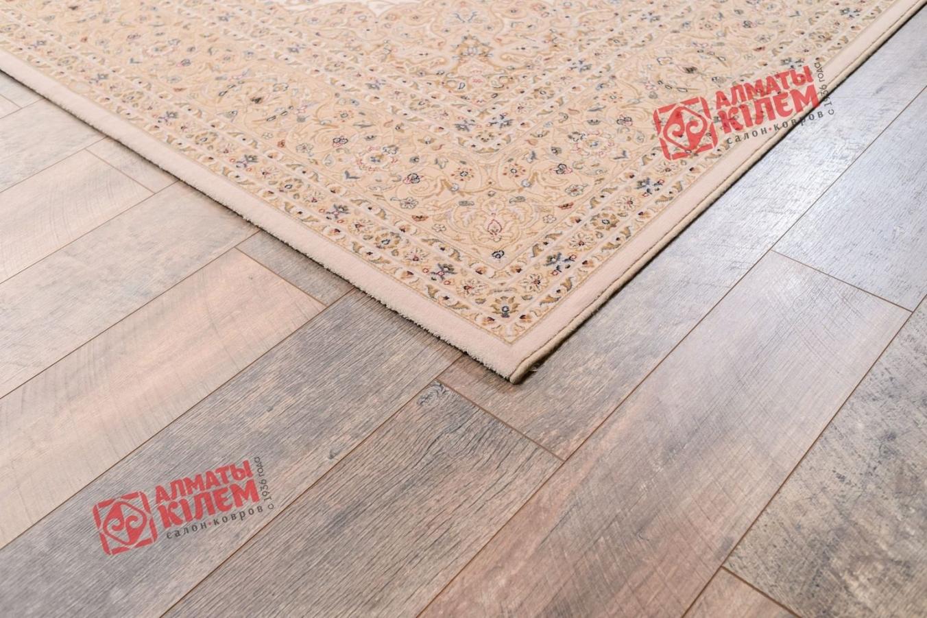 Великолепный ковер в классическом стиле бежевого цвета производства Бельгии. Купить изделие из стопроцентной шерсти с доставкой в Алматы-Кілем можно уже сейчас. Центральную часть полотна украшает розетка более светлого оттенка с подобием солнечного узора в середине. Флористический мотив основного узора плавно переходит в более мелкий. Особую изысканность изделию придает рамка, выделенная окантовкой по краям.