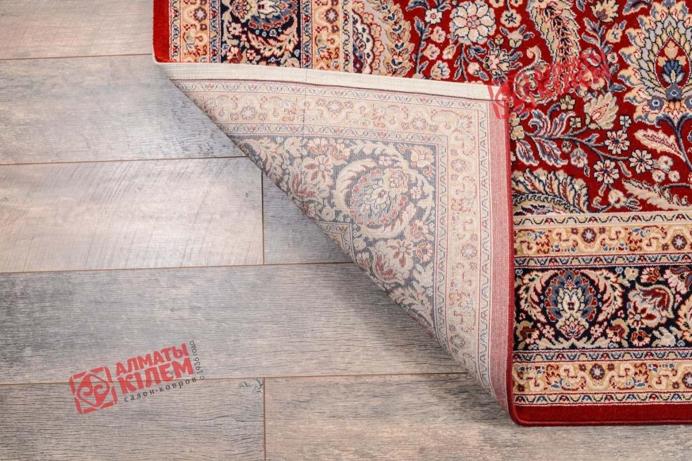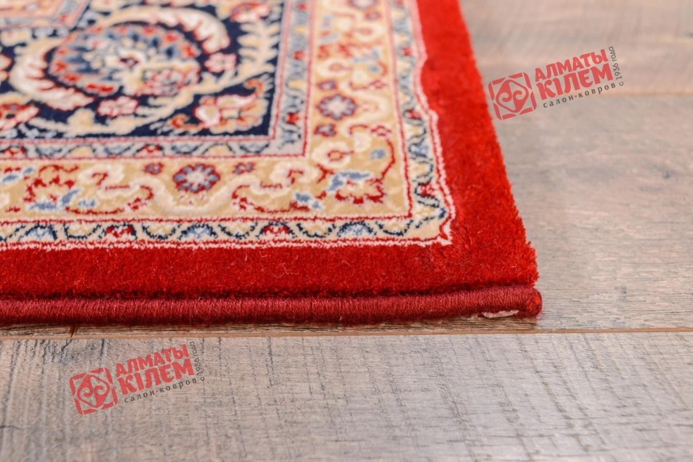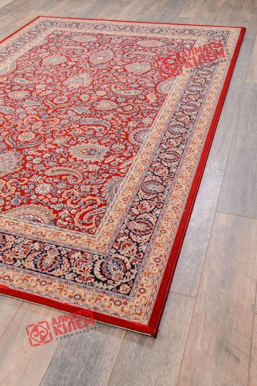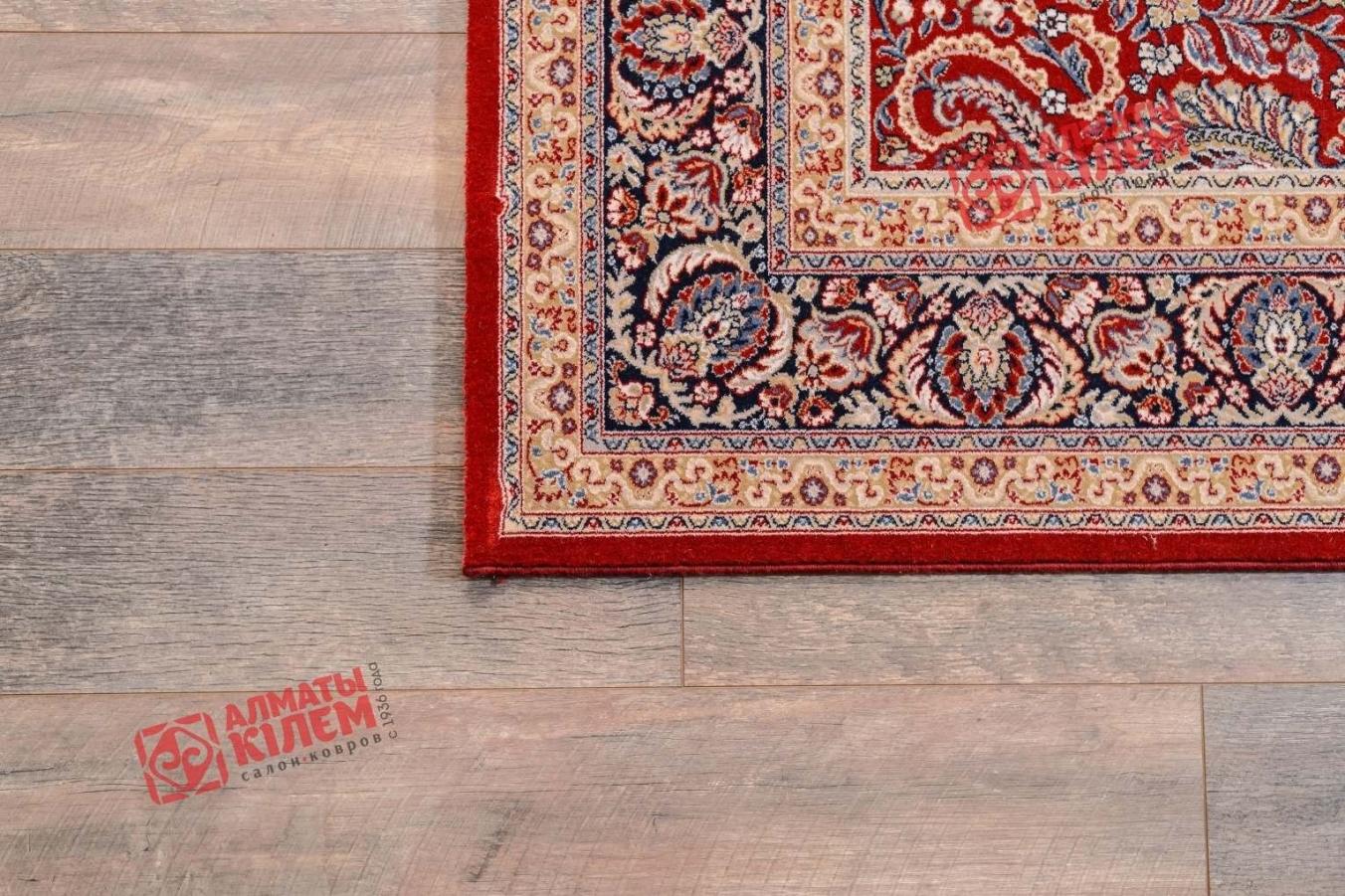 Купить изысканный напольный ковер из натуральной шерсти для интерьеров в классическом стиле — это привнести в обстановку уют и комфорт. Красное полотно, очерченное словно драгоценным обрамлением из парной широкой и узкой рамочки, украшено оригинальным фантазийным узором. Изображение сочетает флористические мотивы и подобие рисунка павлиньего хвоста. Смотрится ковер невероятно роскошно. Ворс средней высоты приятен на ощупь.