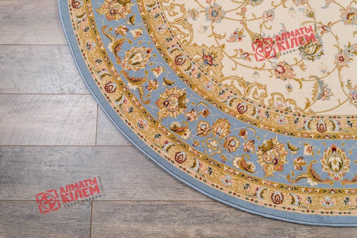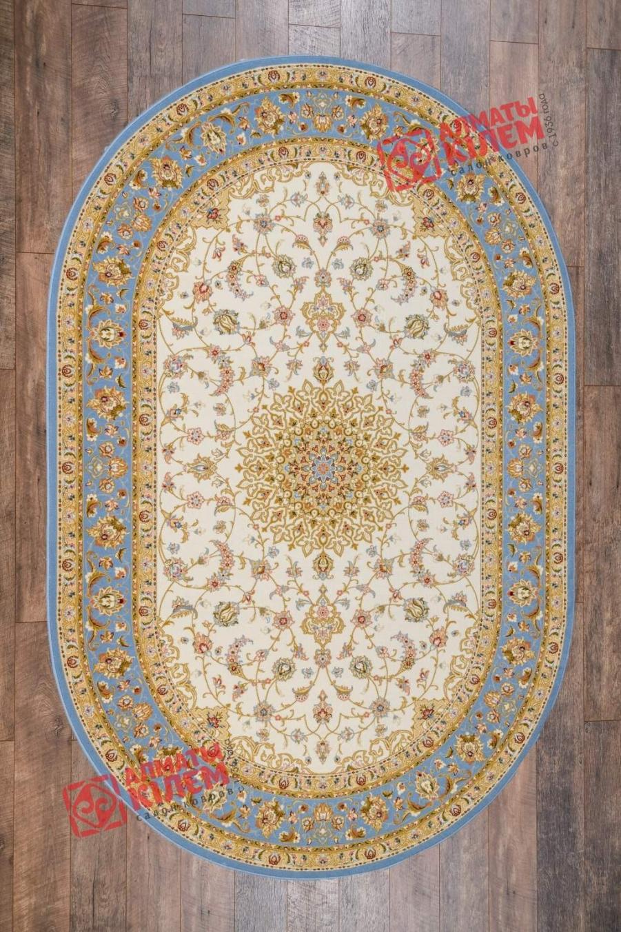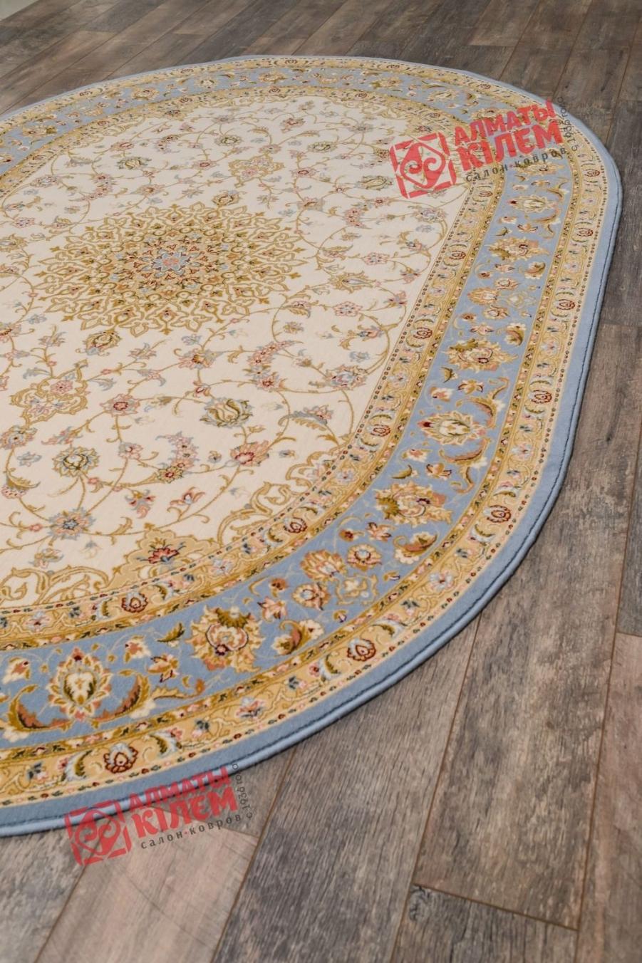 Овальный ковер из коллекции «Elegance» от молдавского бренда Moldabela одинаково великолепно вписывается в домашние и офисные интерьеры. Выполненный из натуральной шерсти, он имеет ворс средней высоты, который поддерживает температуру пола в оптимальном состоянии, оставляет после себя исключительно приятные тактильные ощущения, способствуя снятию усталости. Классический стиль напольного покрытия «смягчает» форма и цветовое решение. Бежевый центральный медальон, декорированный золотистой ажурной розеткой и кремовым флористическим узором, обрамлен голубым бордюром. Окружающая основной рисунок овальная рамочка тоже украшена цветочным узором.