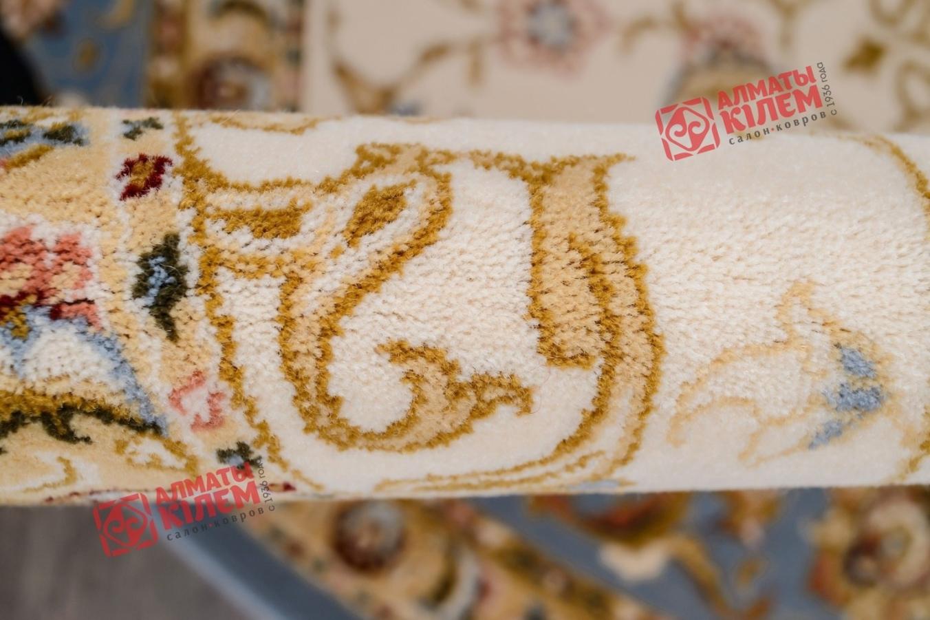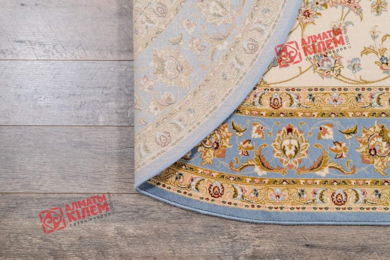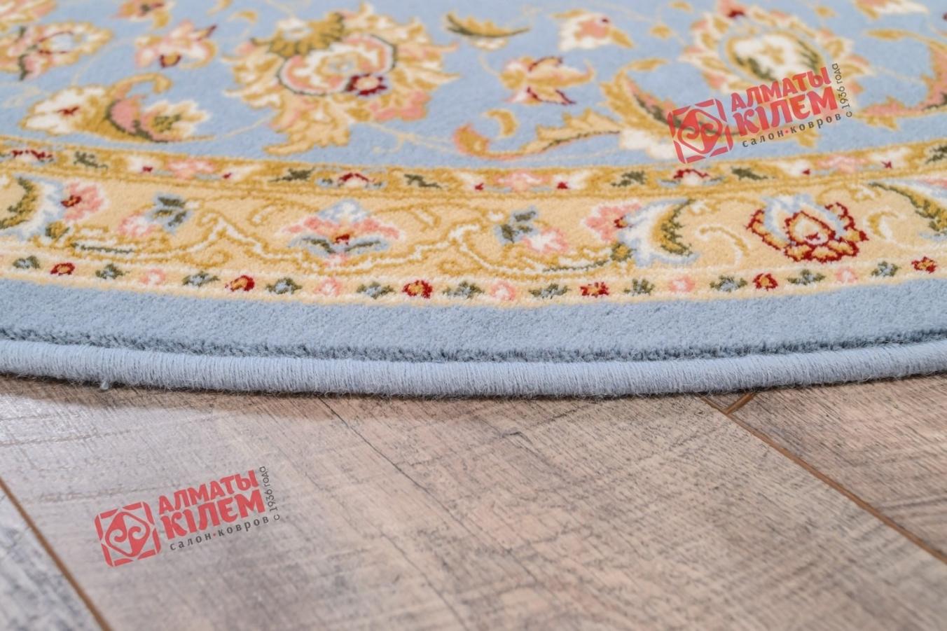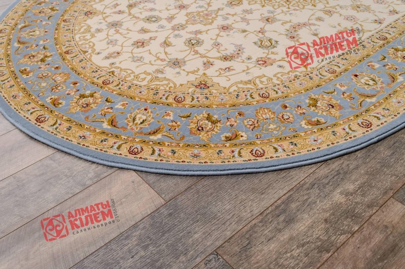 Овальный ковер из коллекции «Elegance» от молдавского бренда Moldabela одинаково великолепно вписывается в домашние и офисные интерьеры. Выполненный из натуральной шерсти, он имеет ворс средней высоты, который поддерживает температуру пола в оптимальном состоянии, оставляет после себя исключительно приятные тактильные ощущения, способствуя снятию усталости. Классический стиль напольного покрытия «смягчает» форма и цветовое решение. Бежевый центральный медальон, декорированный золотистой ажурной розеткой и кремовым флористическим узором, обрамлен голубым бордюром. Окружающая основной рисунок овальная рамочка тоже украшена цветочным узором.