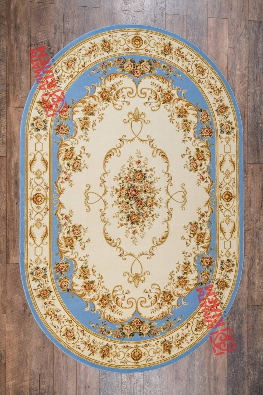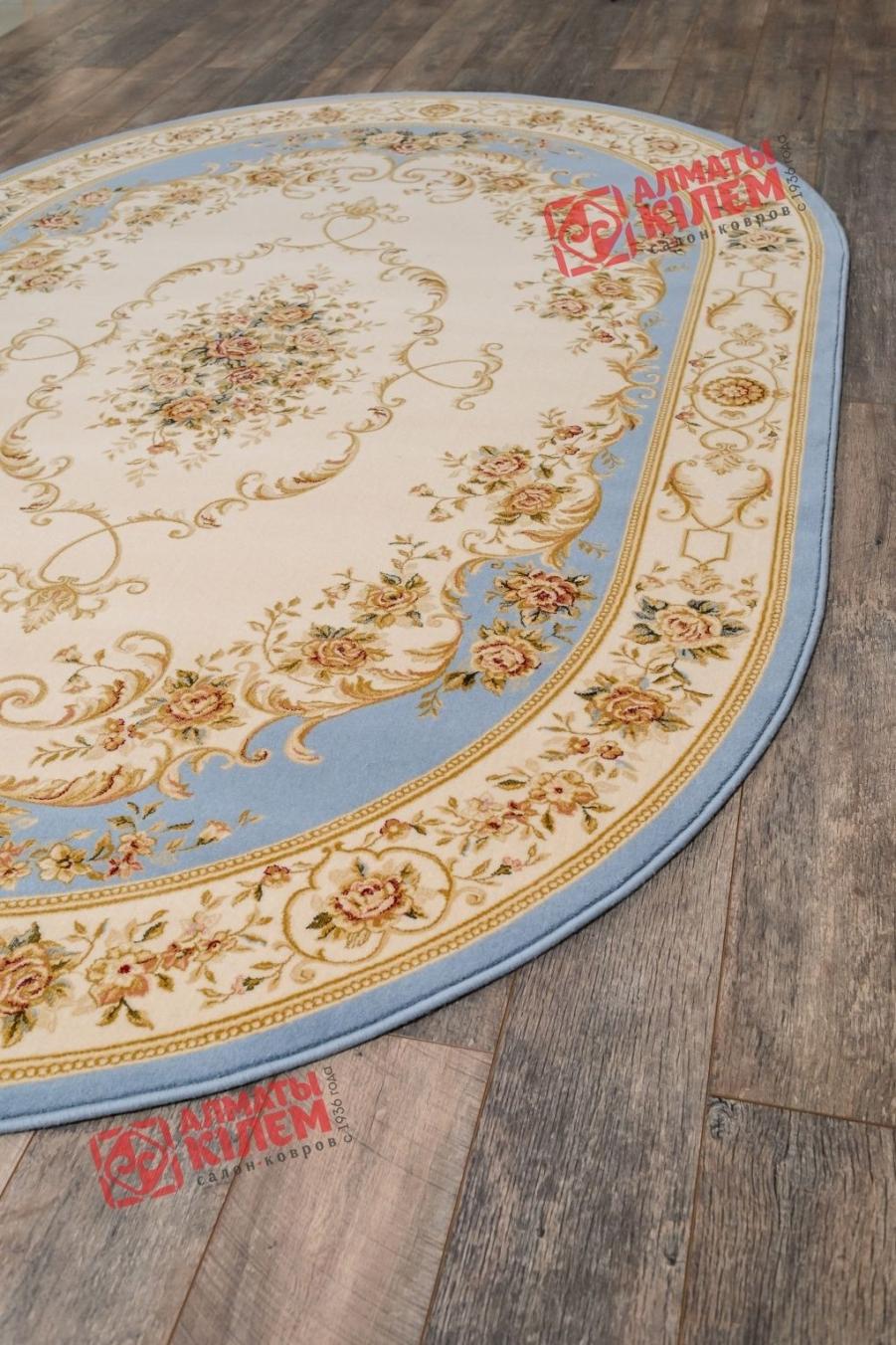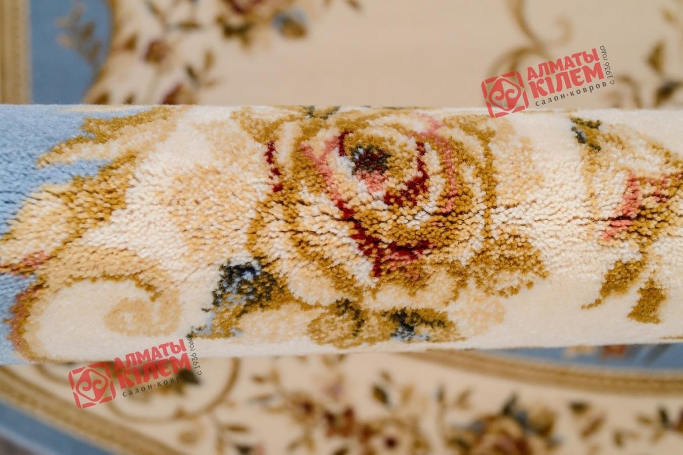 Великолепный напольный ковер из стопроцентно натуральной шерсти овальной формы в бежевых и голубых оттенках наполняет окружающую обстановку атмосферой уюта, комфорта и позитивного настроения. Он одинаково красиво смотрится в гостиных, спальнях, кухнях, столовых, прихожих, офисах и кабинетах. Покрытие прекрасно вписывается в интерьеры, оформленные как в сдержанной, так и в насыщенной яркой палитре. Центральный медальон бежевого оттенка украшен флористическим мотивом. Цветы создают изящную розетку из роз посередине, а также небольшие «букетики» по ажурным краям. Завершает концепцию покрытию светлый бордюр с рисунком. Свободное пространство «заполнено» небесно-голубым.