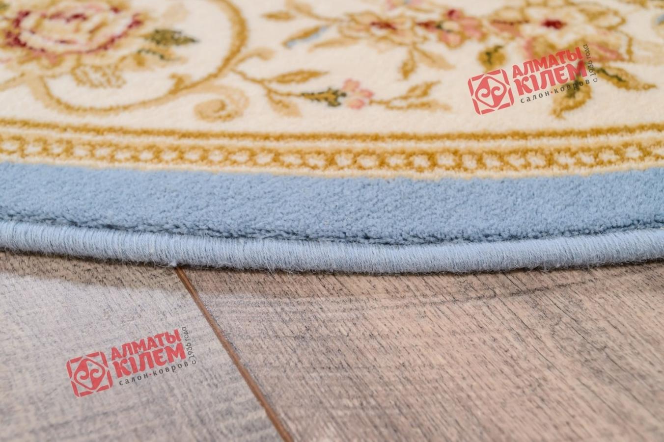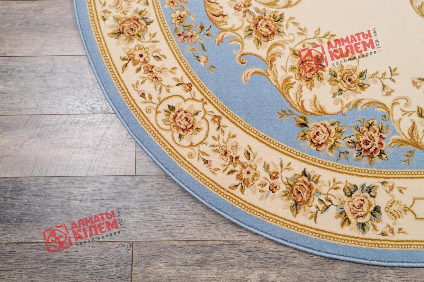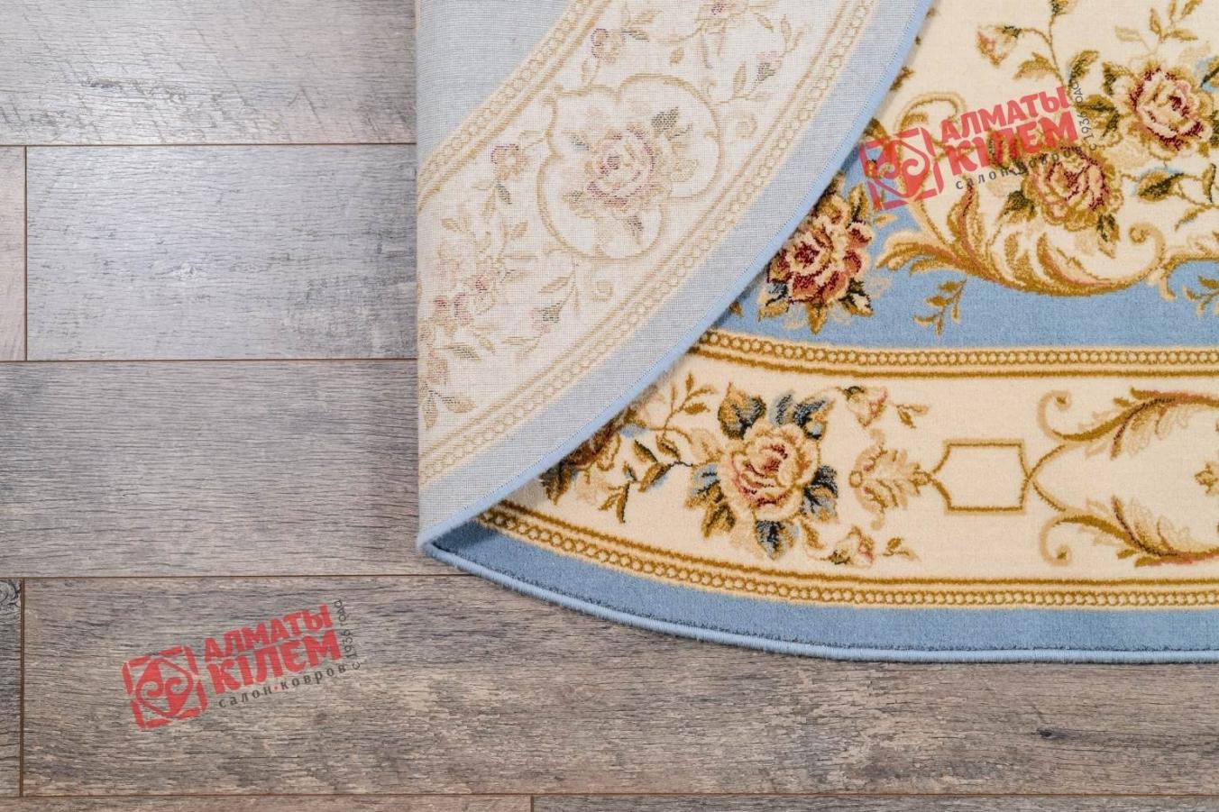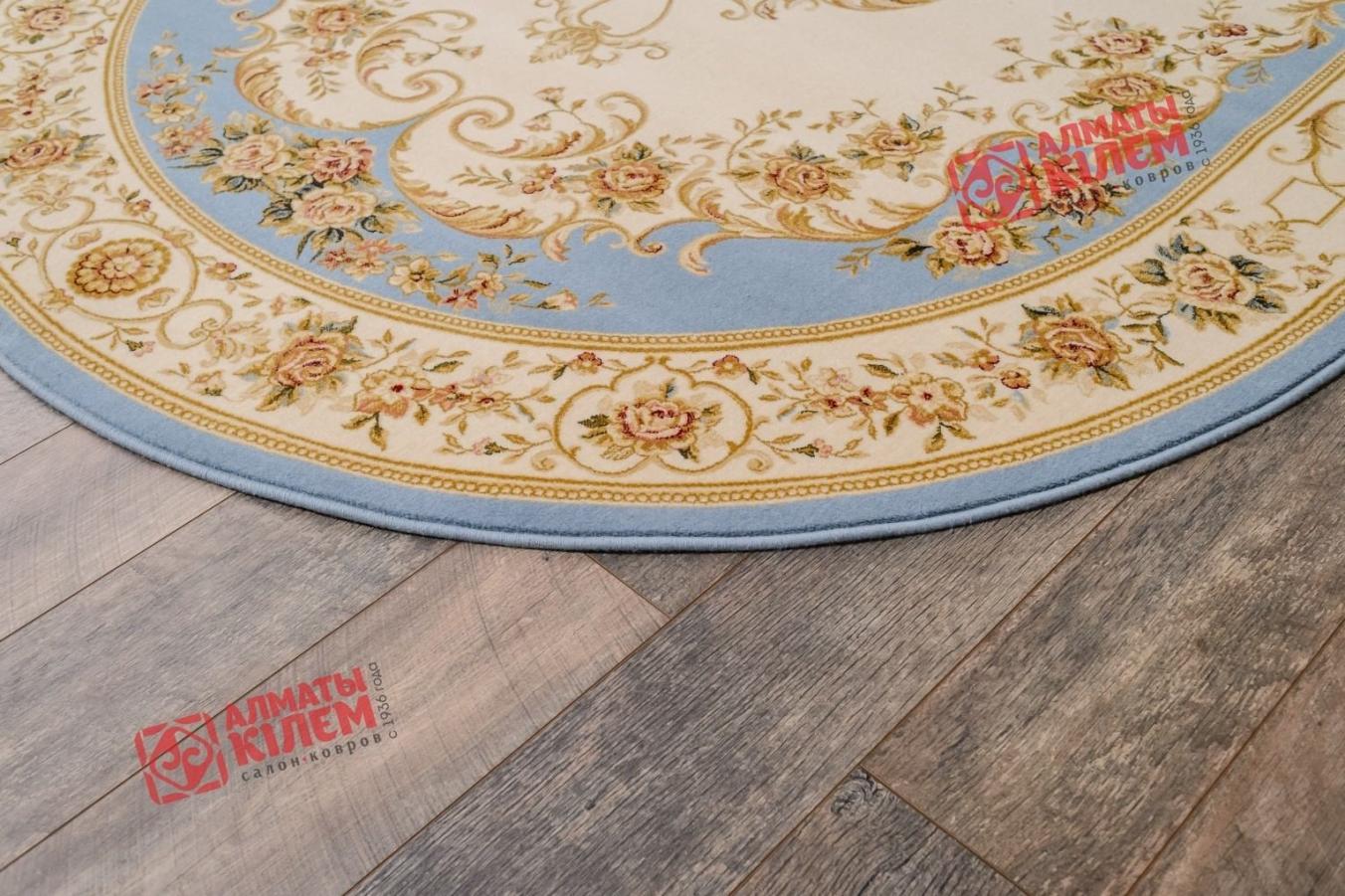 Великолепный напольный ковер из стопроцентно натуральной шерсти овальной формы в бежевых и голубых оттенках наполняет окружающую обстановку атмосферой уюта, комфорта и позитивного настроения. Он одинаково красиво смотрится в гостиных, спальнях, кухнях, столовых, прихожих, офисах и кабинетах. Покрытие прекрасно вписывается в интерьеры, оформленные как в сдержанной, так и в насыщенной яркой палитре. Центральный медальон бежевого оттенка украшен флористическим мотивом. Цветы создают изящную розетку из роз посередине, а также небольшие «букетики» по ажурным краям. Завершает концепцию покрытию светлый бордюр с рисунком. Свободное пространство «заполнено» небесно-голубым.