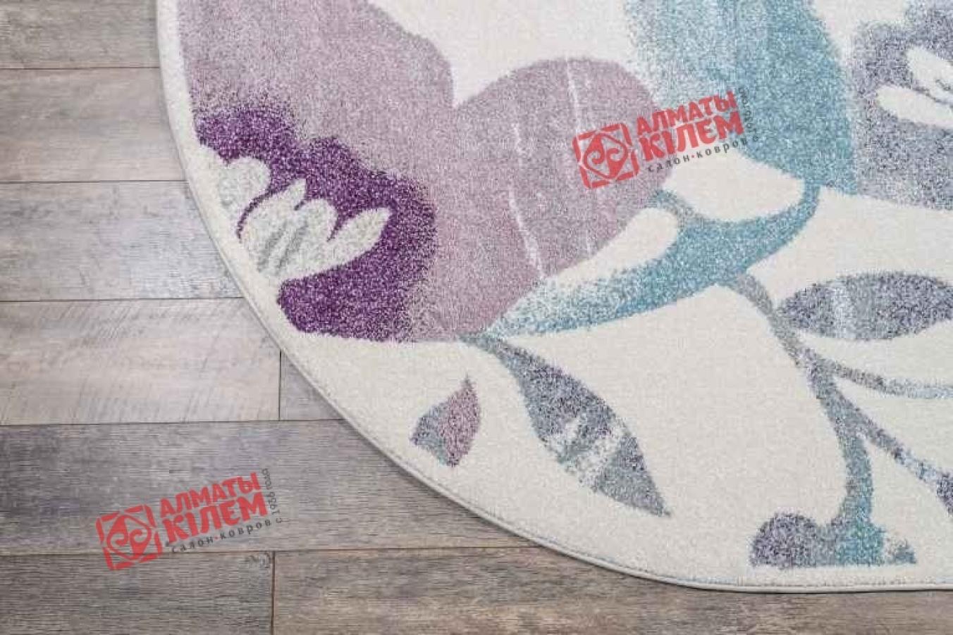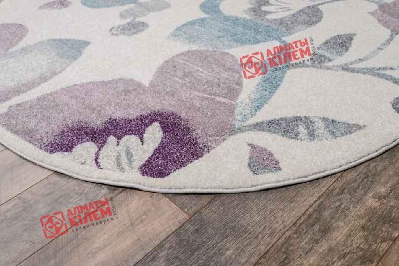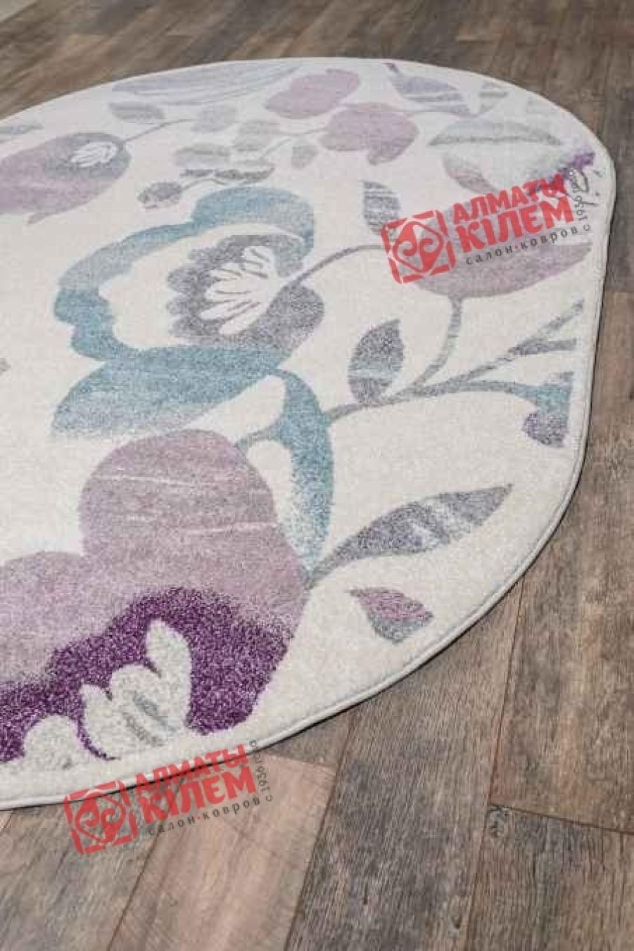 Главным украшением является флористический узор в фиолетовой, зеленой и серой палитре. Белая кайма, обрамляющая край, придает ковру завершенность и эффектно подчеркивает фактурность и красоту цветочного полотна.