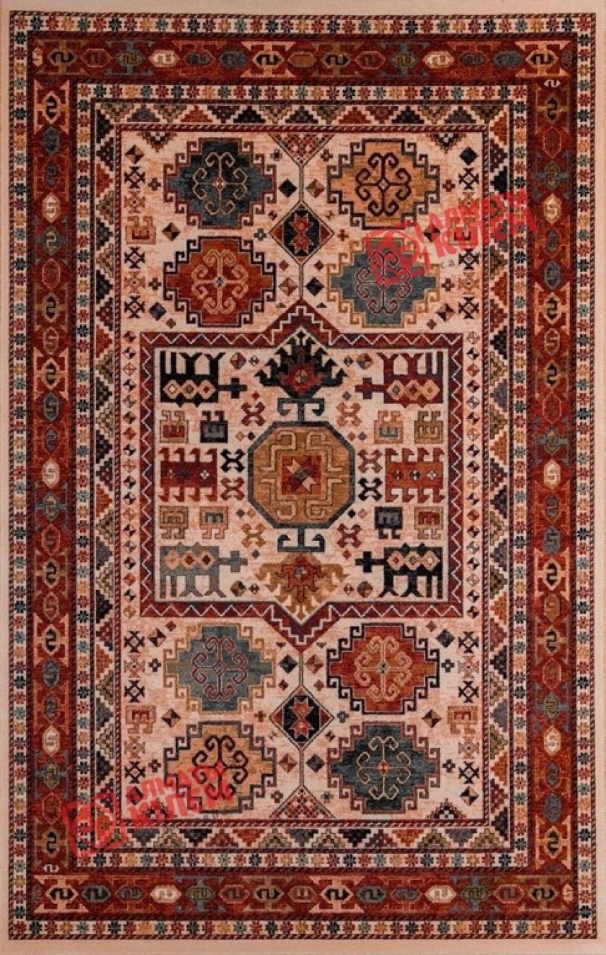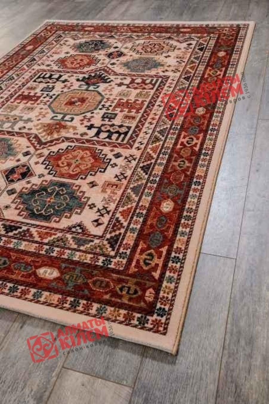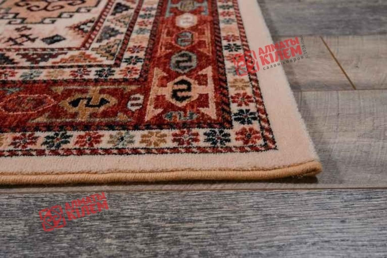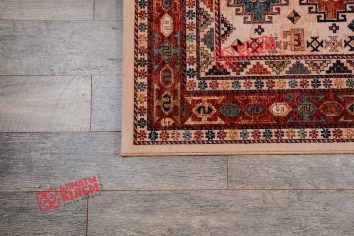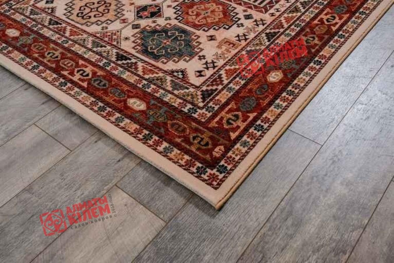 Этнические мотивы и классический дизайн — это идеальное сочетание абсолютно для любого интерьера. Ковер от бельгийского бренда призван создавать невероятно комфортную атмосферу и подчеркивать богатство убранства гостиных комнат, спален, столовых, кухонь, прихожих или холла. Он отлично смотрится в кабинетах руководителя, приемных, офисных помещениях для подчеркивания статуса и респектабельности компании либо учреждения. Основной оттенок геометрического ковра бежевый. Центральный рисунок представляет собой замысловатую абстракцию, в которой угадывается очертания животных. Он обыгран различными геометрическими узорами. Завершенность ковру придают четыре рамки.