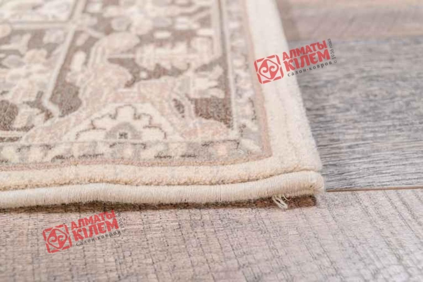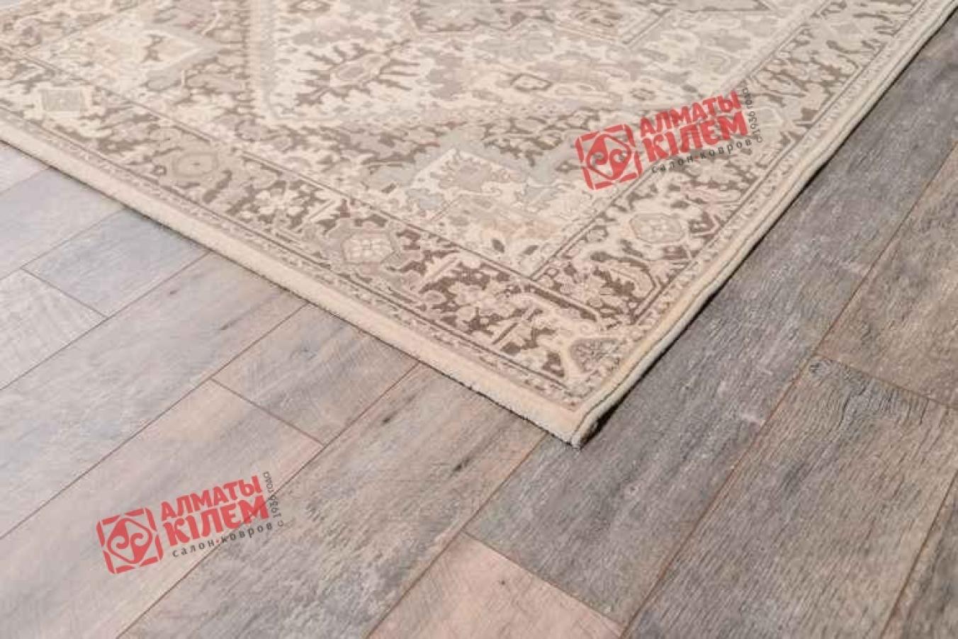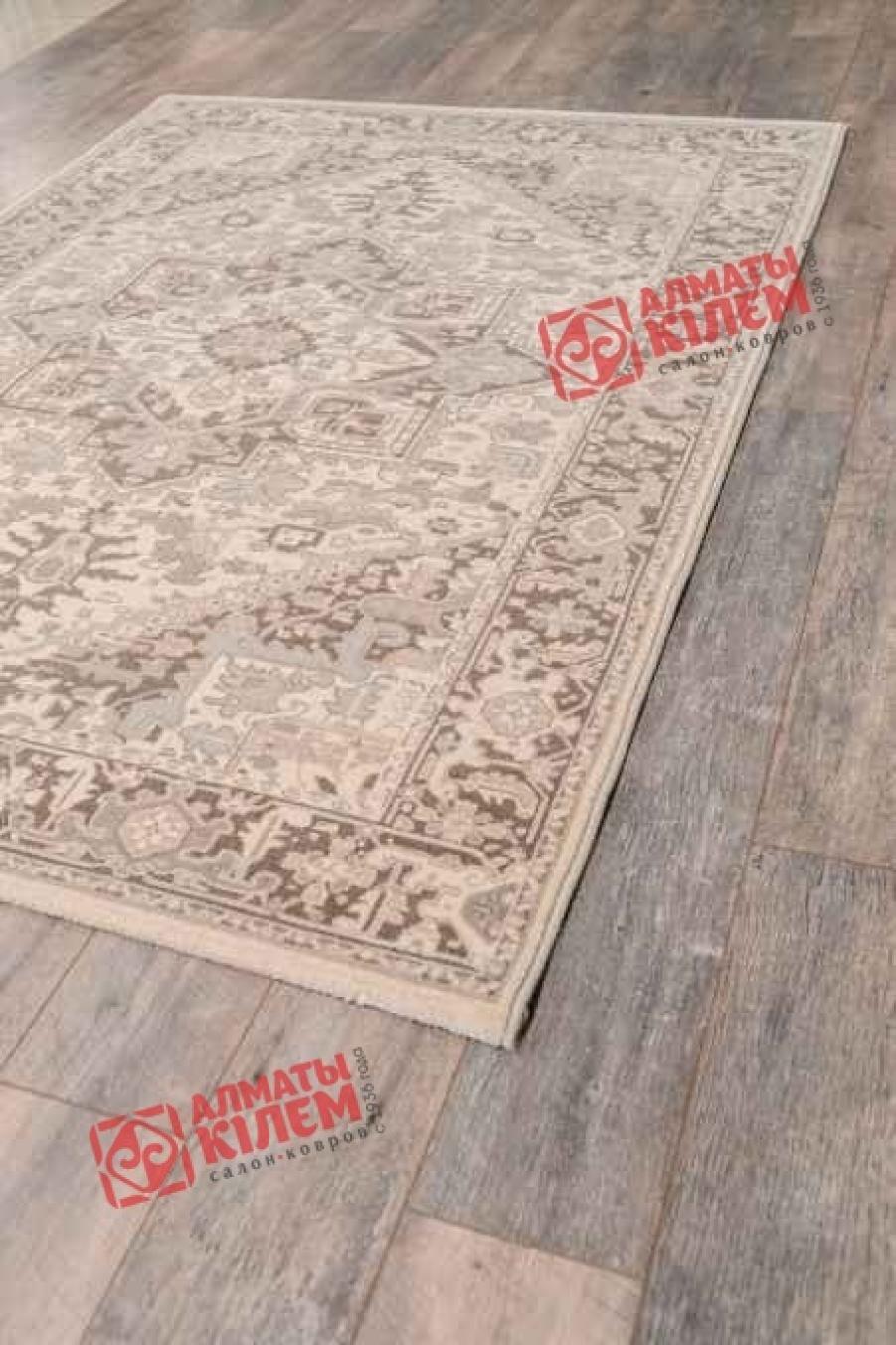 Невероятно оригинальный и роскошный ковер, выполненный из стопроцентно натуральной шерсти высочайшего качества, с дорогой и изысканной фактурой станет идеальным завершением респектабельных интерьеров кабинета руководителя, приемной, офиса, гостиных комнат, спален, кухонь, столовых, прихожих и холлов. Его бежево-серая палитра не смотрится тускло благодаря умелому сочетанию и переходу оттенков с тонами и полутонами. Особую изюминку покрытию придает узор. Центральная розетка представляет собой сочетание двух перекрещенных квадратов со светлой овальной сердцевиной, а медальон заострен сверху и снизу. Окружающее обрамление и бордюр имеют более темную расцветку.