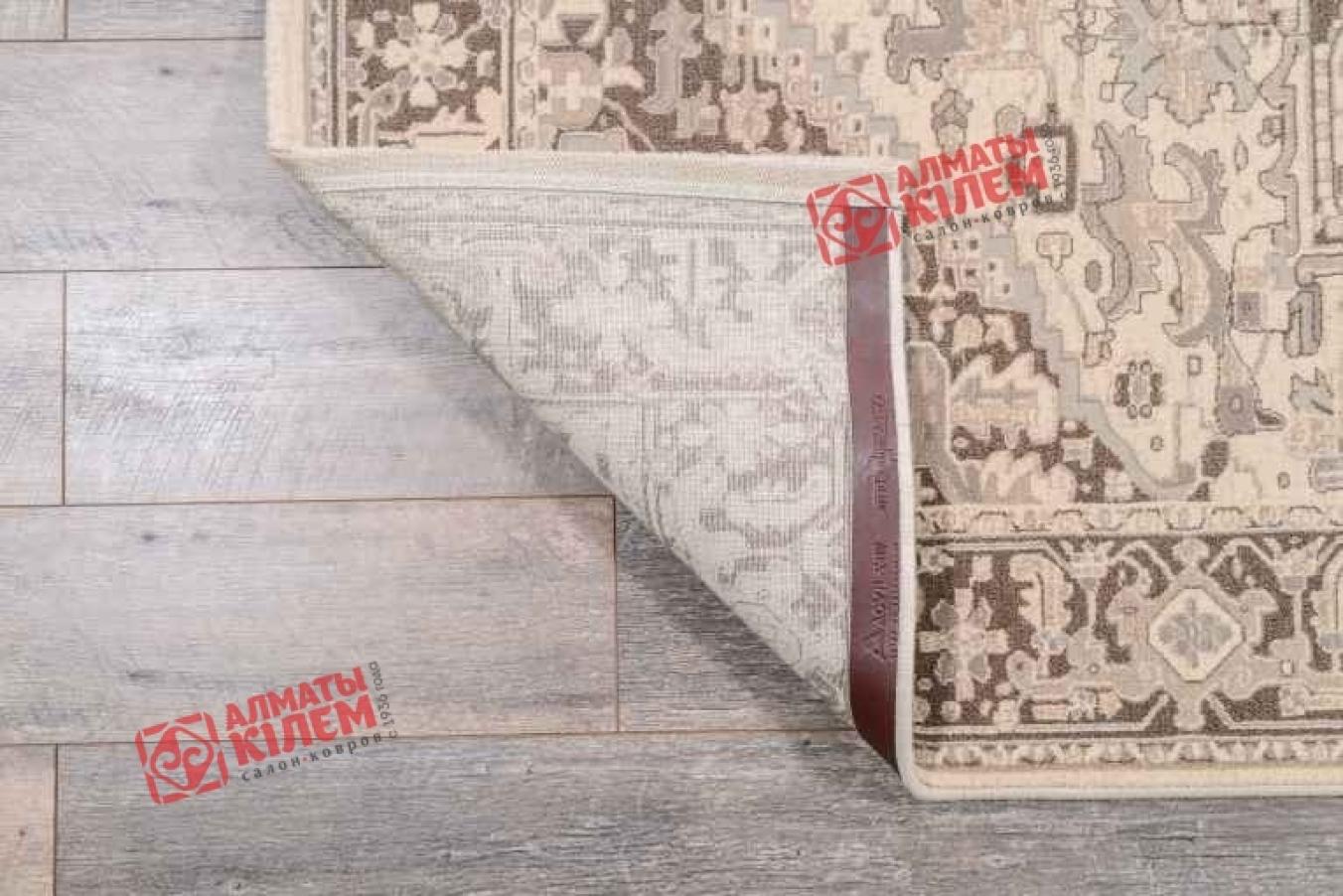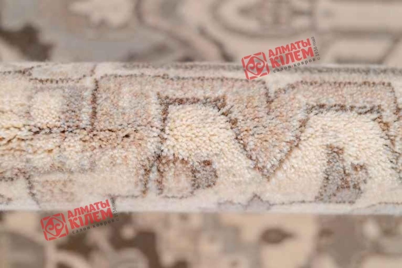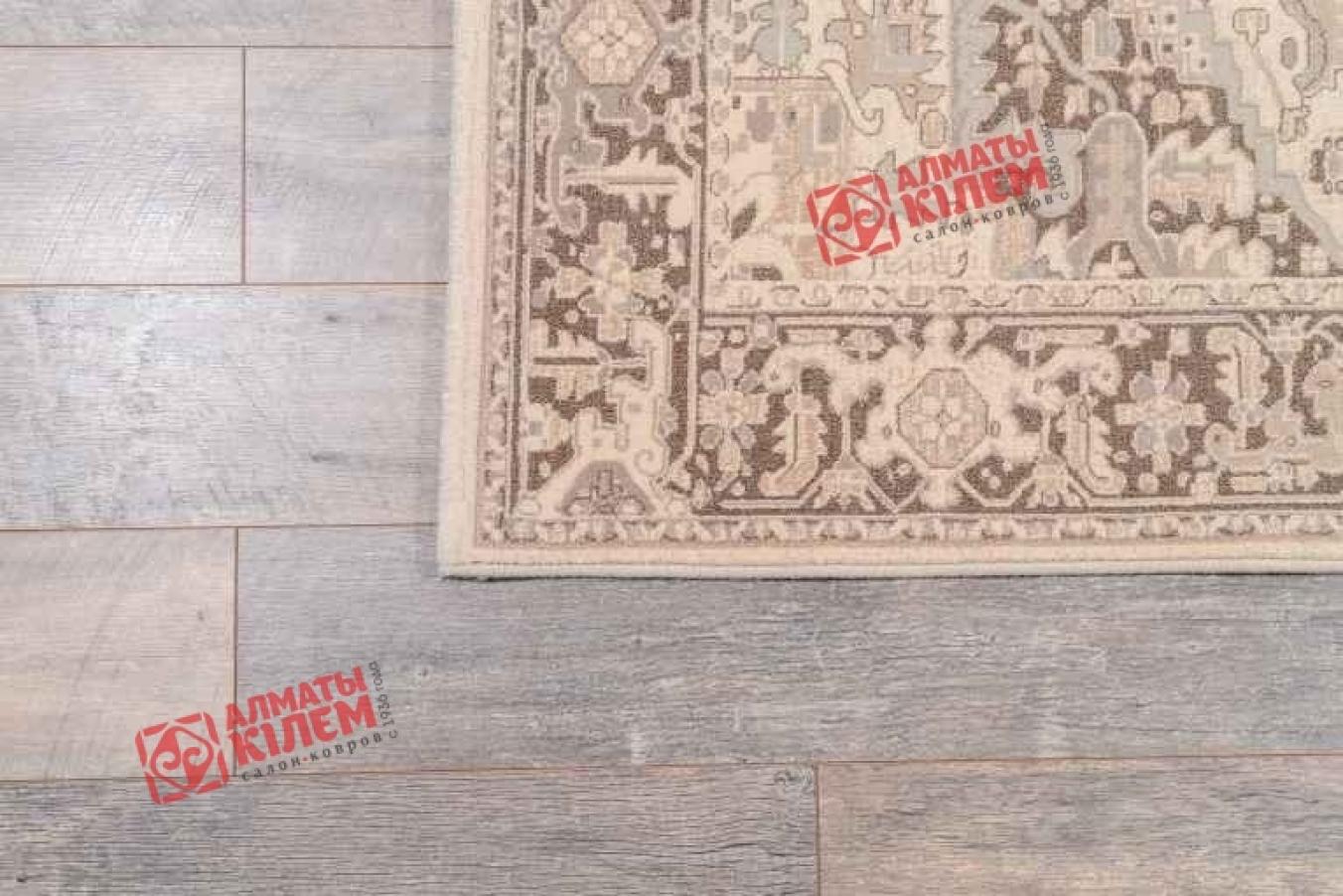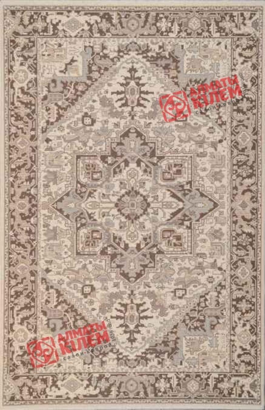 Невероятно оригинальный и роскошный ковер, выполненный из стопроцентно натуральной шерсти высочайшего качества, с дорогой и изысканной фактурой станет идеальным завершением респектабельных интерьеров кабинета руководителя, приемной, офиса, гостиных комнат, спален, кухонь, столовых, прихожих и холлов. Его бежево-серая палитра не смотрится тускло благодаря умелому сочетанию и переходу оттенков с тонами и полутонами. Особую изюминку покрытию придает узор. Центральная розетка представляет собой сочетание двух перекрещенных квадратов со светлой овальной сердцевиной, а медальон заострен сверху и снизу. Окружающее обрамление и бордюр имеют более темную расцветку.