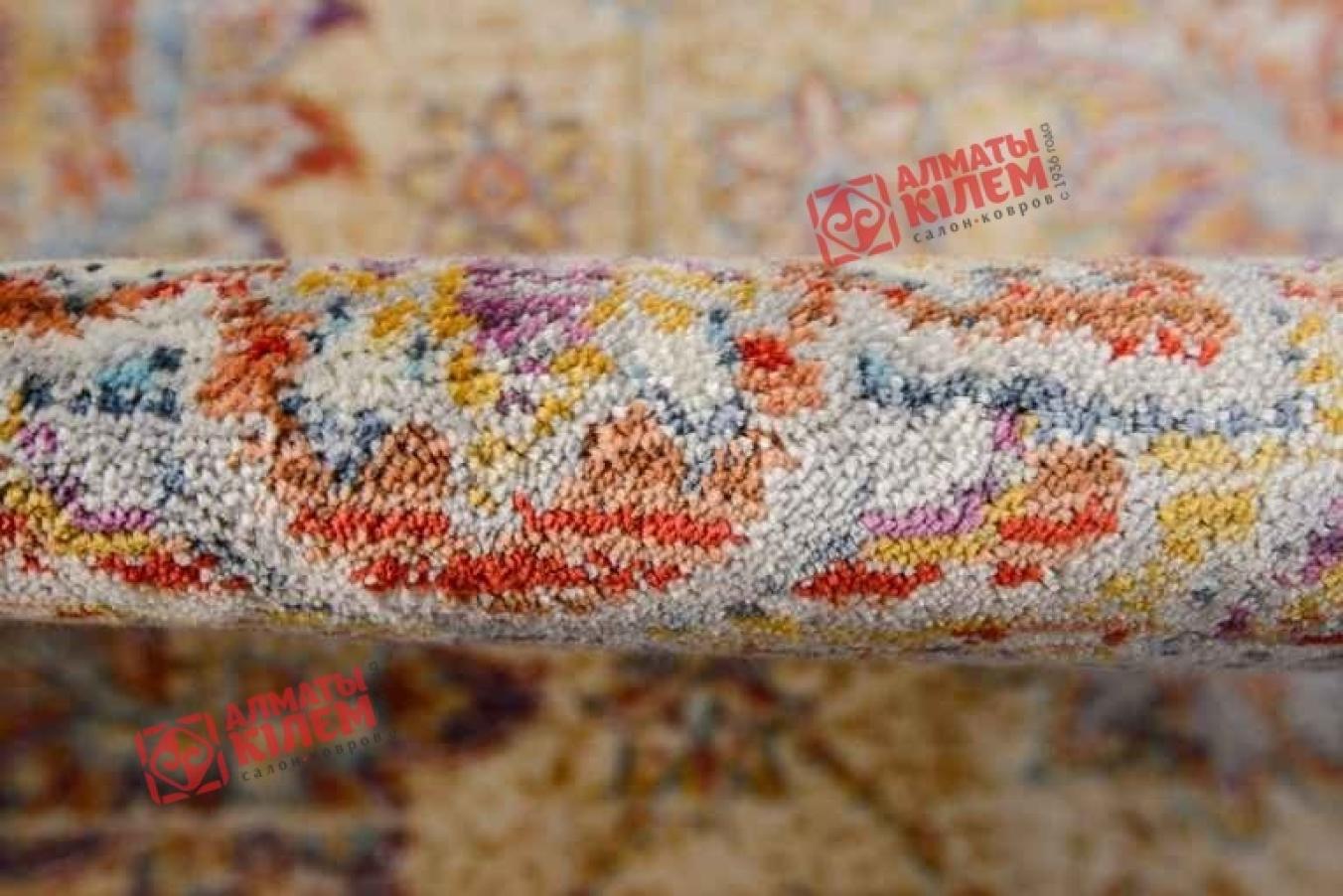 Нежно-кремовый ковер из вискозы привнесет в обстановку квартиры, дома или офиса неповторимую атмосферу уюта и свежести. По светлому полотну нанесен флористический узор. Крупные розетки образуют замысловатый рисунок, напоминающий собой роскошные шелковые обои ручной работы. Его дополняют мелкие и практически неразличимые вкрапления цветочков, напоминающих собой драгоценную россыпь камней. Яркие оттенки в сочетании с золотистым придают всей композиции неповторимый шарм и очарование. По краю ковер будто произведение великого художника обрамлен позолоченной рамкой. Модель в современном стиле прекрасно сочетается с классическими и неоклассическими интерьерами.
