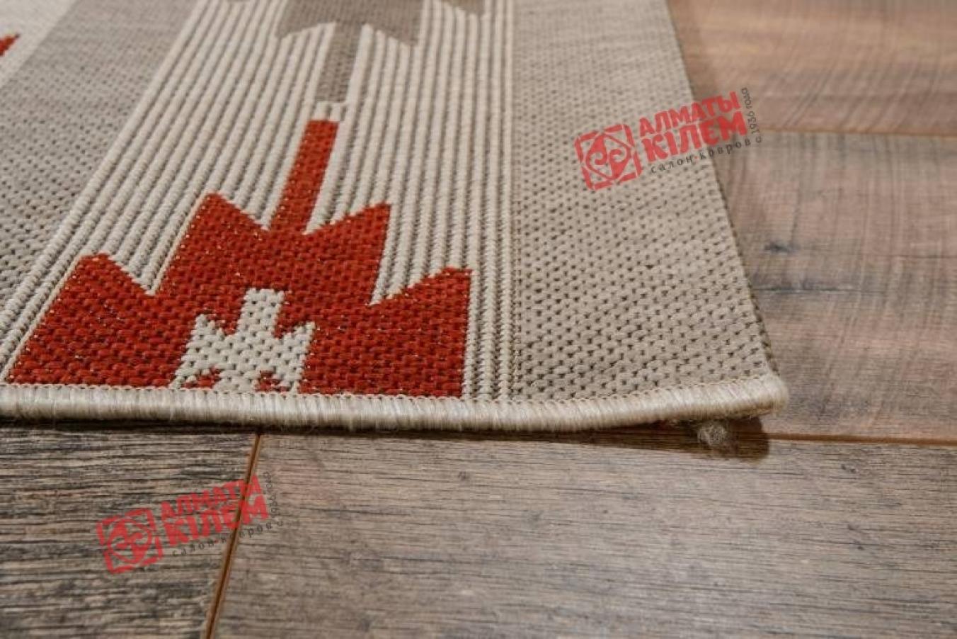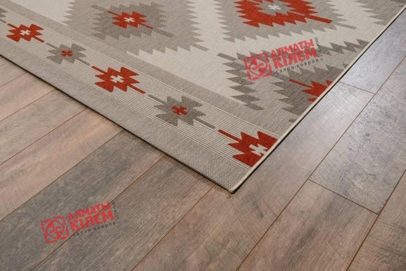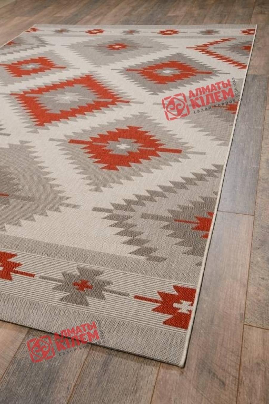 Великолепный безворсовый из устойчивого к влаге полипропилена ковер — это идеальное решение для украшения интерьеров кухонь, столовых, прихожих и ванных. Он наполнит интерьер атмосферой домашнего уюта и тепла. Циновка, выполненная из полипропилена, оставляет после себя исключительно приятные тактильные ощущения. Хождение по напольному покрытию и в носках, и босиком будет приносить только удовольствие, а, главное, согревать в холодные дни. Дизайн модели выполнен в современном стиле, а узор представлен геометрическим орнаментом из ромбов в серебристо-оранжевой гамме на светлом фоне и завершается серым бордюром с узором, цвета которого повторяют основной рисунок.