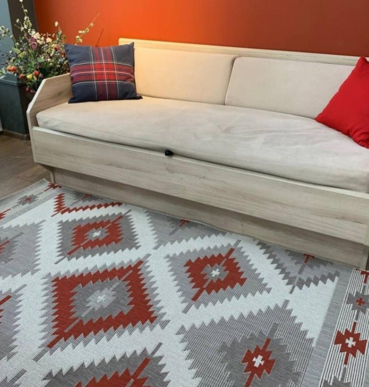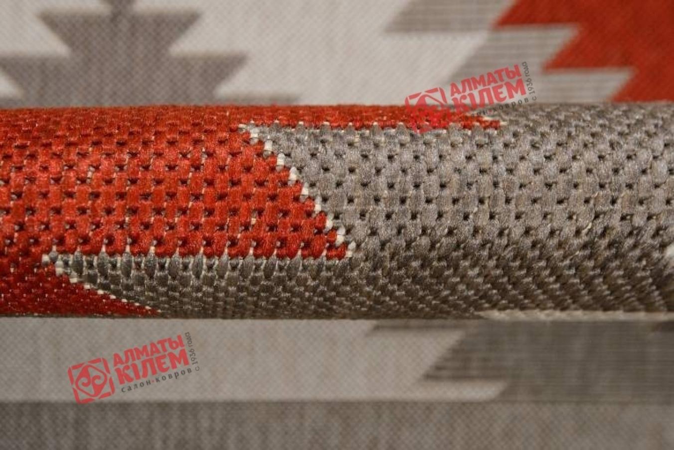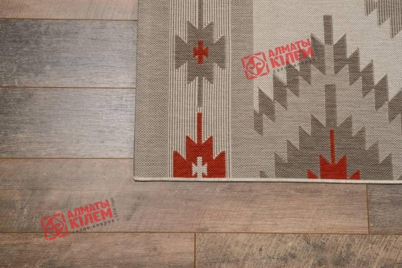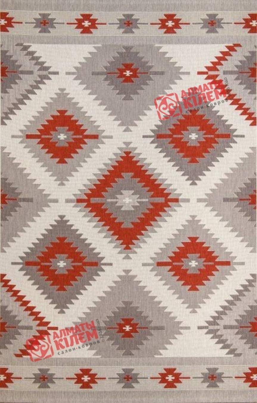 Великолепный безворсовый из устойчивого к влаге полипропилена ковер — это идеальное решение для украшения интерьеров кухонь, столовых, прихожих и ванных. Он наполнит интерьер атмосферой домашнего уюта и тепла. Циновка, выполненная из полипропилена, оставляет после себя исключительно приятные тактильные ощущения. Хождение по напольному покрытию и в носках, и босиком будет приносить только удовольствие, а, главное, согревать в холодные дни. Дизайн модели выполнен в современном стиле, а узор представлен геометрическим орнаментом из ромбов в серебристо-оранжевой гамме на светлом фоне и завершается серым бордюром с узором, цвета которого повторяют основной рисунок.