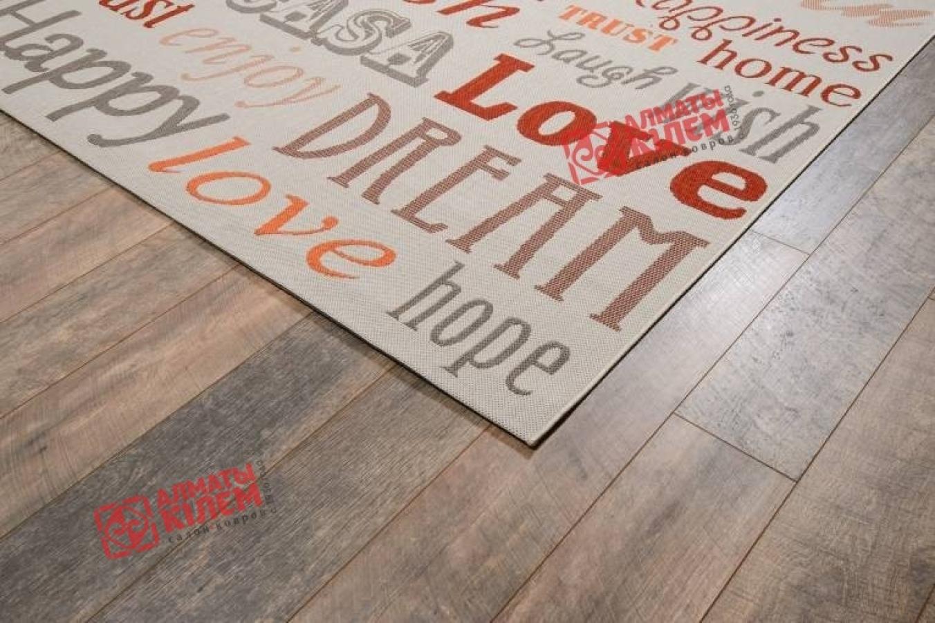 Оригинальный кремовый безворсовый ковер с надписями на английском языке станет прекрасным украшением столовых, кухонь, прихожих. Слова, изображенные на циновке, говорят сами за себя. Здесь написаны слова «дом», «мечта», «счастье». Это привносит в обстановку квартиры особого уюта и комфорта. Современный дизайн в сочетании с графическими надписями смотрится просто великолепно. Такое дизайнерское решение позволяет сочетать циновку абсолютно с любым современным интерьером. Ковер без ворса можно укладывать в помещениях как с яркой палитрой, так и со сдержанной пастельной. В первом случае оно поддержит общую концепцию, а во втором станет главным акцентным элементом.
