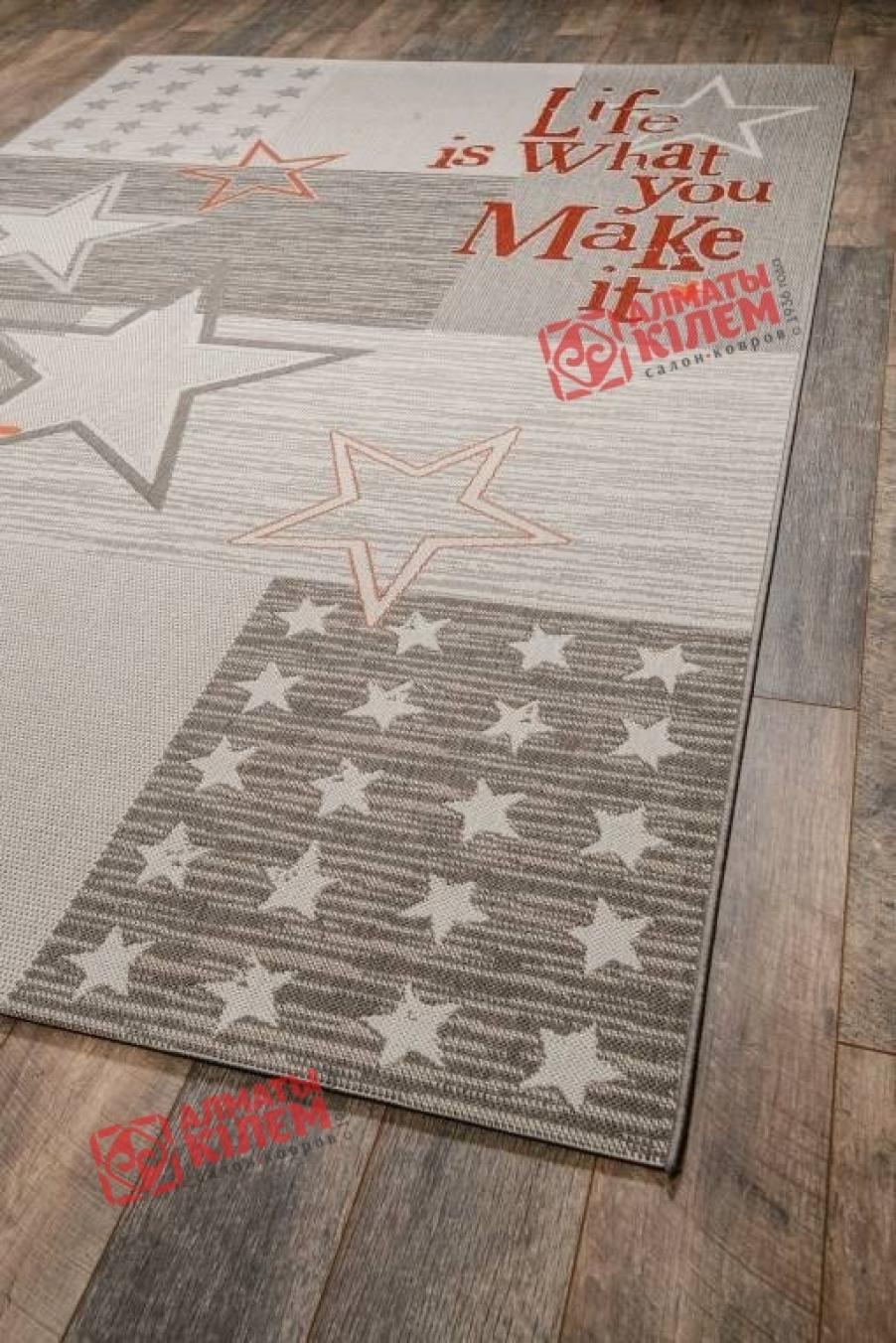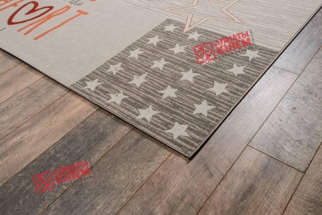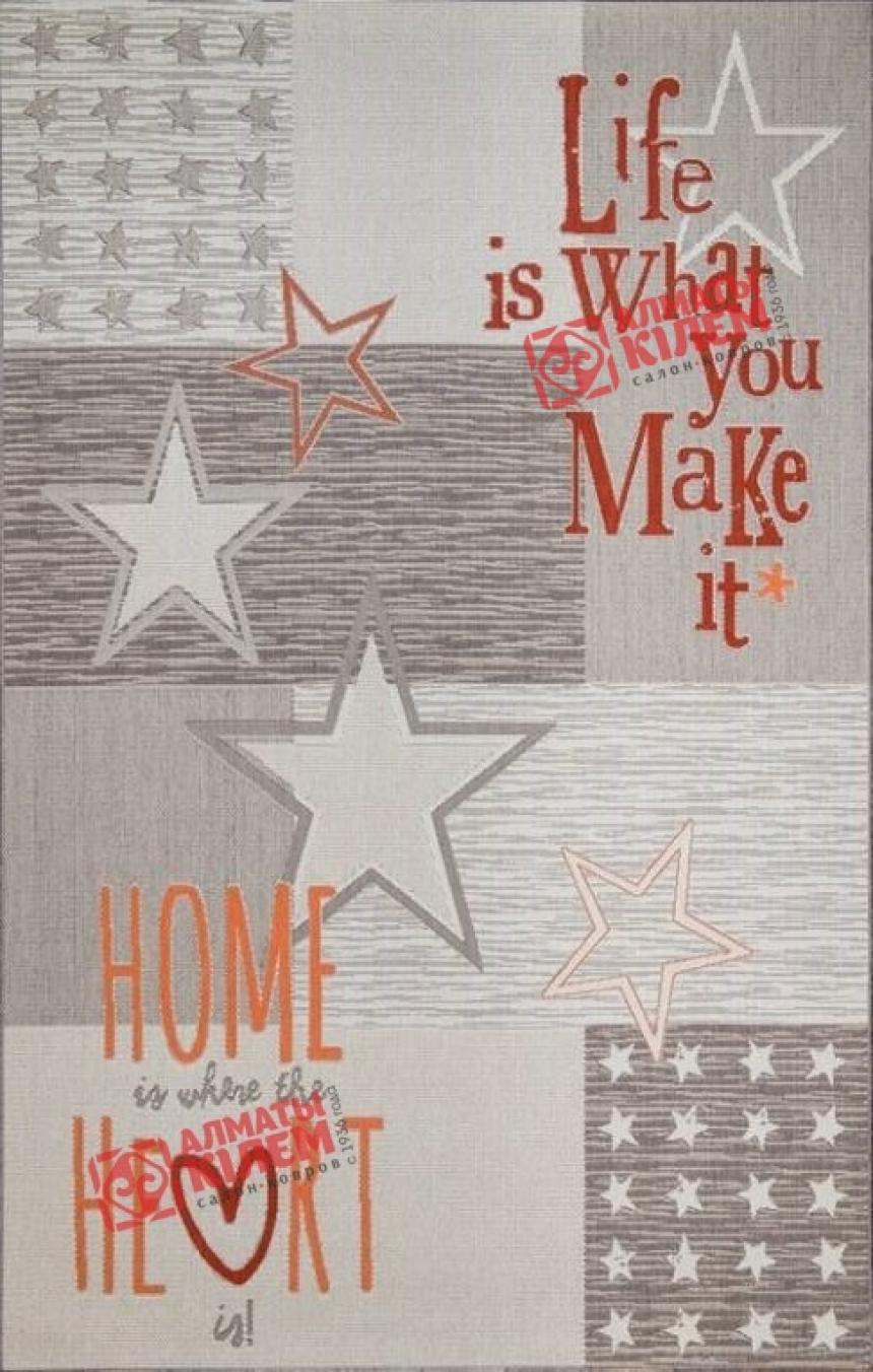 По-настоящему «звездный» ковер из коллекции «Star». Каждый «штрих» дизайна этой циновки буквально наполняет атмосферу дома тем самым неповторимым чувством комфорта и уюта. Бежево-серая палитра одаривает спокойствием, а звезды, разбросанные по полотну, в белых или темных оттенках «заставляют» все вокруг сиять. Надписи о милом доме и жизни в красном и оранжевом цвете настраивают исключительно на позитивное настроение и вызывают улыбку. Покрытие выполнено из устойчивого к влаге полипропилена, а отсутствие ворса препятствует скоплению пыли и грязи, поэтому такой декор будет лучше всего смотреться именно на кухне, в столовой, ванной или прихожей.