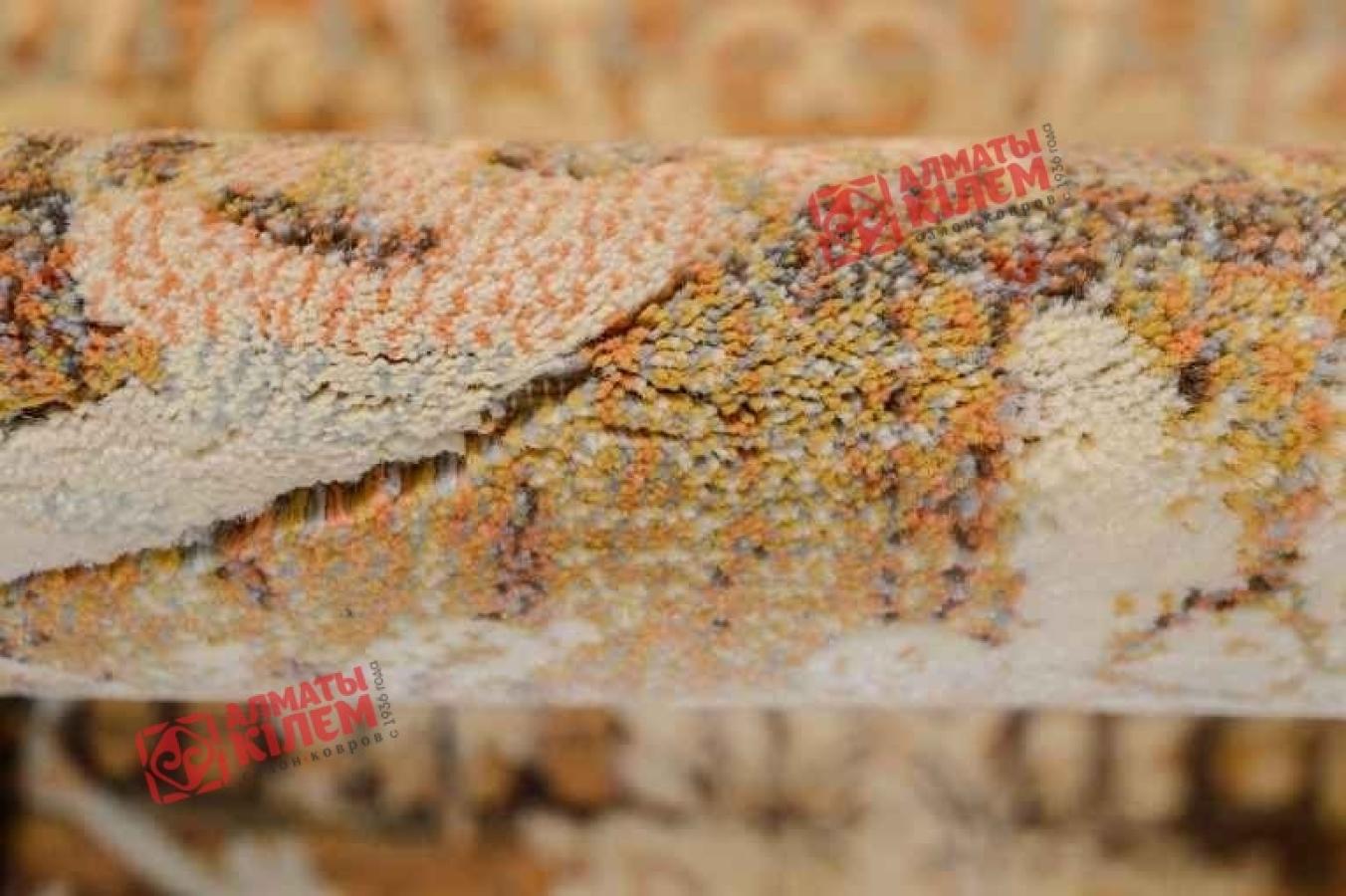 Основная палитра бежевая, а узор нанесен светло-коричневым. Разбавляют фактуру ковра зеленые и темно-коричневые полоски.