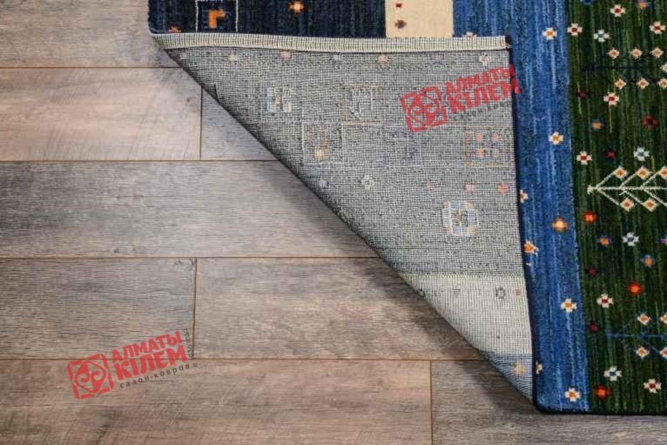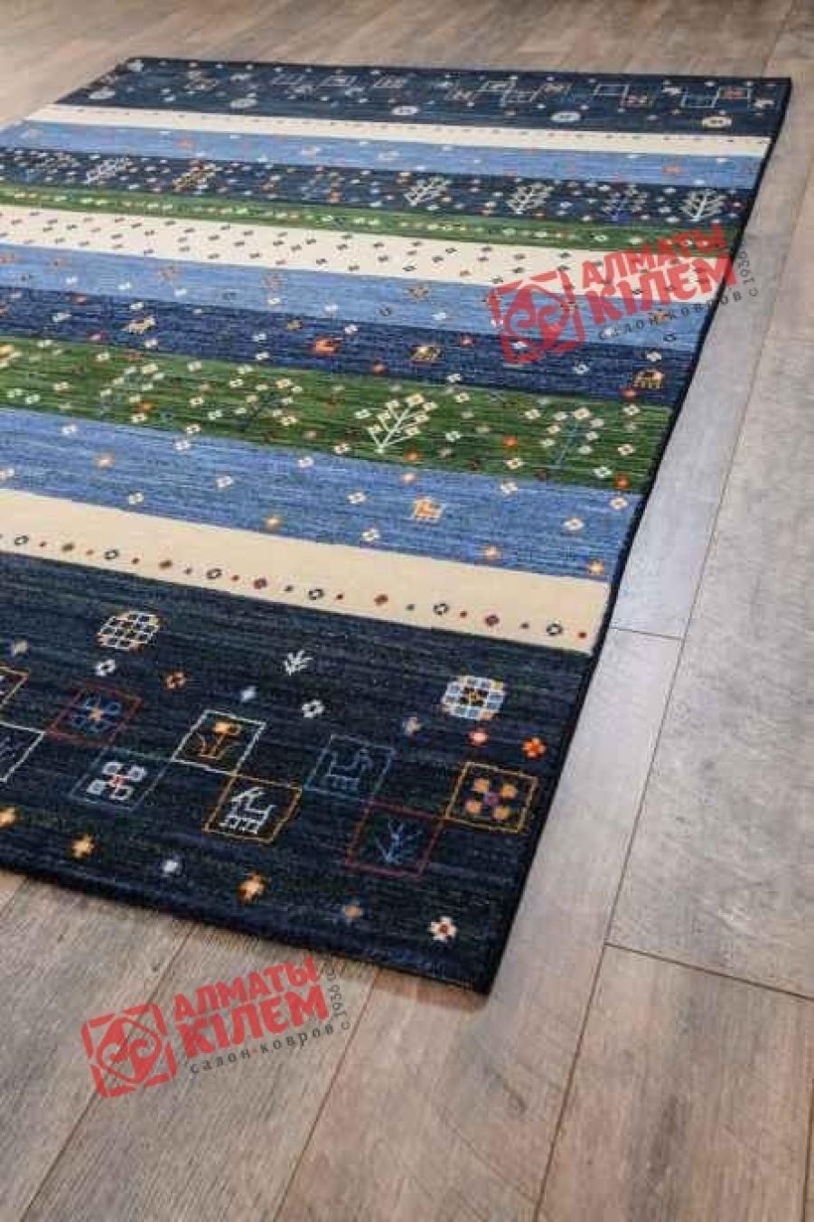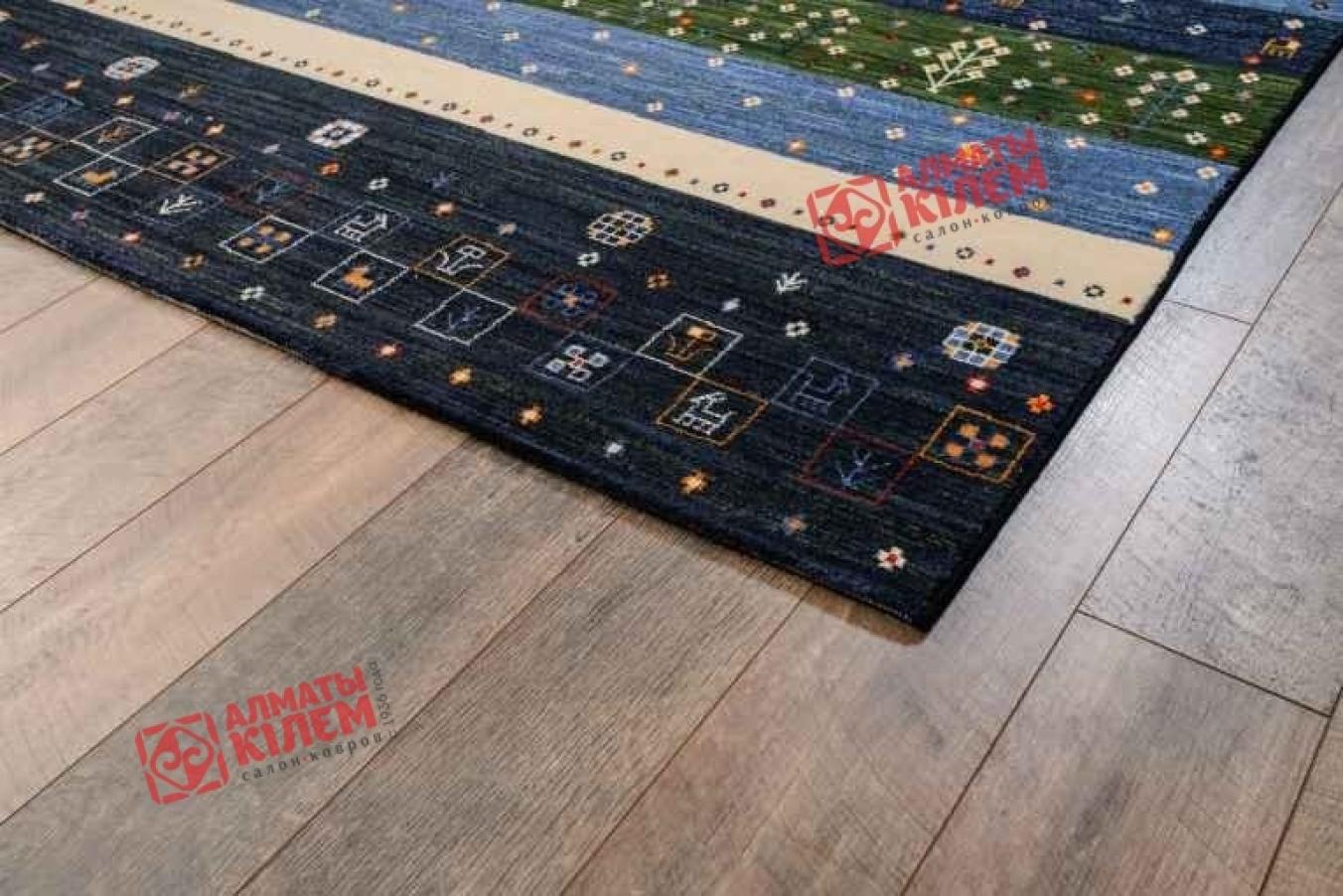 Оригинальный ковер в этническом стиле станет настоящей жемчужиной интерьера. Разноцветные полоски синего, зеленого и бежевого оттенков «изображают» природу. Светлые с геометрическим узором сменяются на цветные с деревьями и оленями. Особую изюминку ковру придают синие широкие полосы с двумя рядами геометрических фигур с узором внутри. Смотрится рисунок, образуемый натуральным шерстяным ворсом, не просто оригинально и интересно, но и по-настоящему богато и дорого. Ковер в этническом стиле украсит собой кабинет руководителя, офисное помещение с преобладанием натуральных материалов в отделке и обстановке. Он великолепно впишется в гостиную, спальню, столовую, прихожую квартиры или загородного дома.