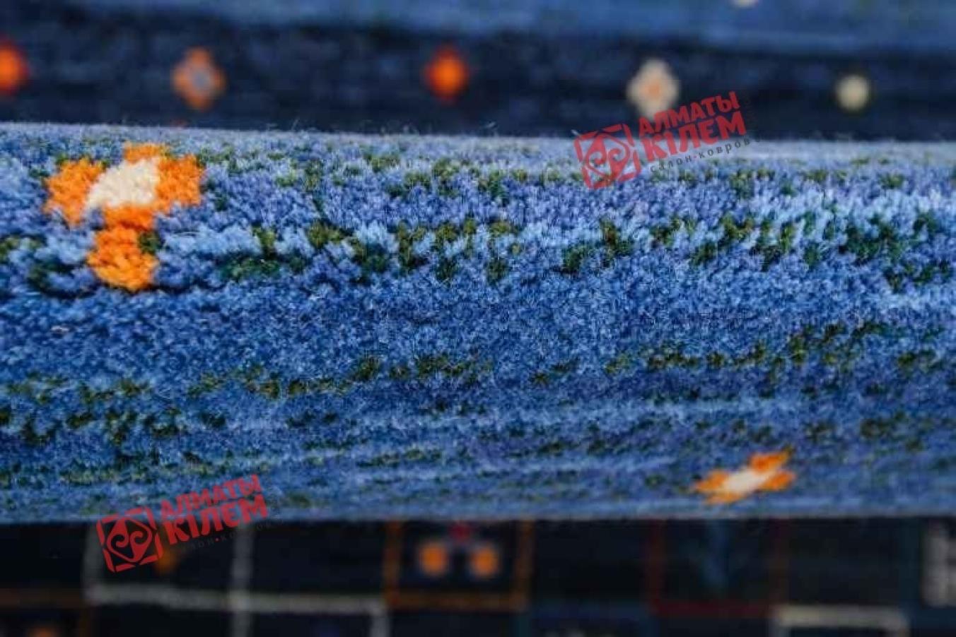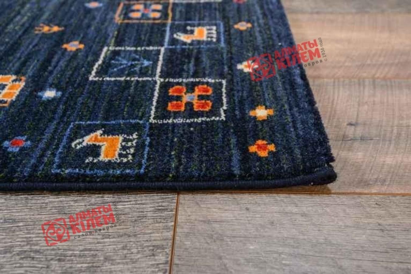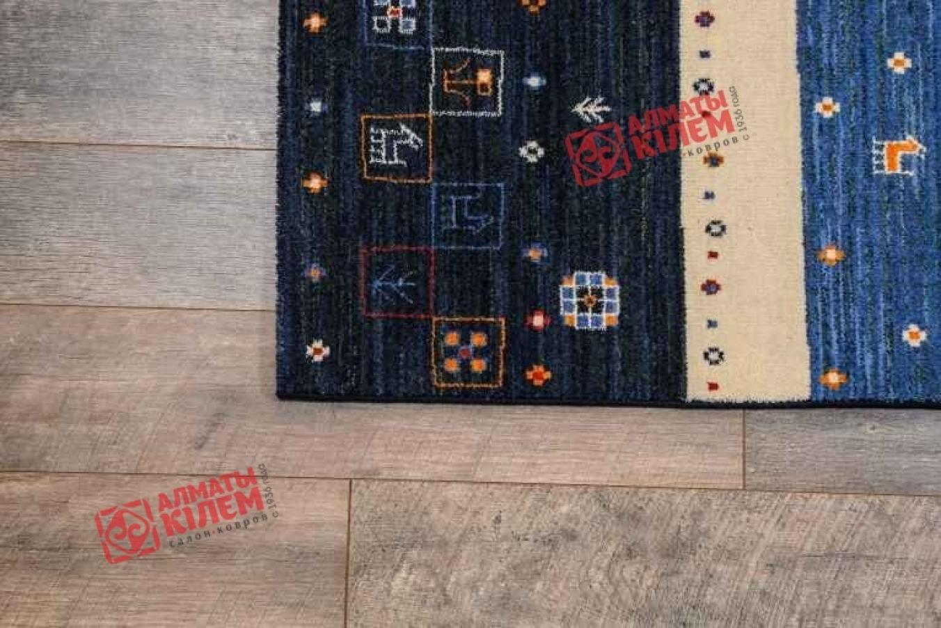 Оригинальный ковер в этническом стиле станет настоящей жемчужиной интерьера. Разноцветные полоски синего, зеленого и бежевого оттенков «изображают» природу. Светлые с геометрическим узором сменяются на цветные с деревьями и оленями. Особую изюминку ковру придают синие широкие полосы с двумя рядами геометрических фигур с узором внутри. Смотрится рисунок, образуемый натуральным шерстяным ворсом, не просто оригинально и интересно, но и по-настоящему богато и дорого. Ковер в этническом стиле украсит собой кабинет руководителя, офисное помещение с преобладанием натуральных материалов в отделке и обстановке. Он великолепно впишется в гостиную, спальню, столовую, прихожую квартиры или загородного дома.