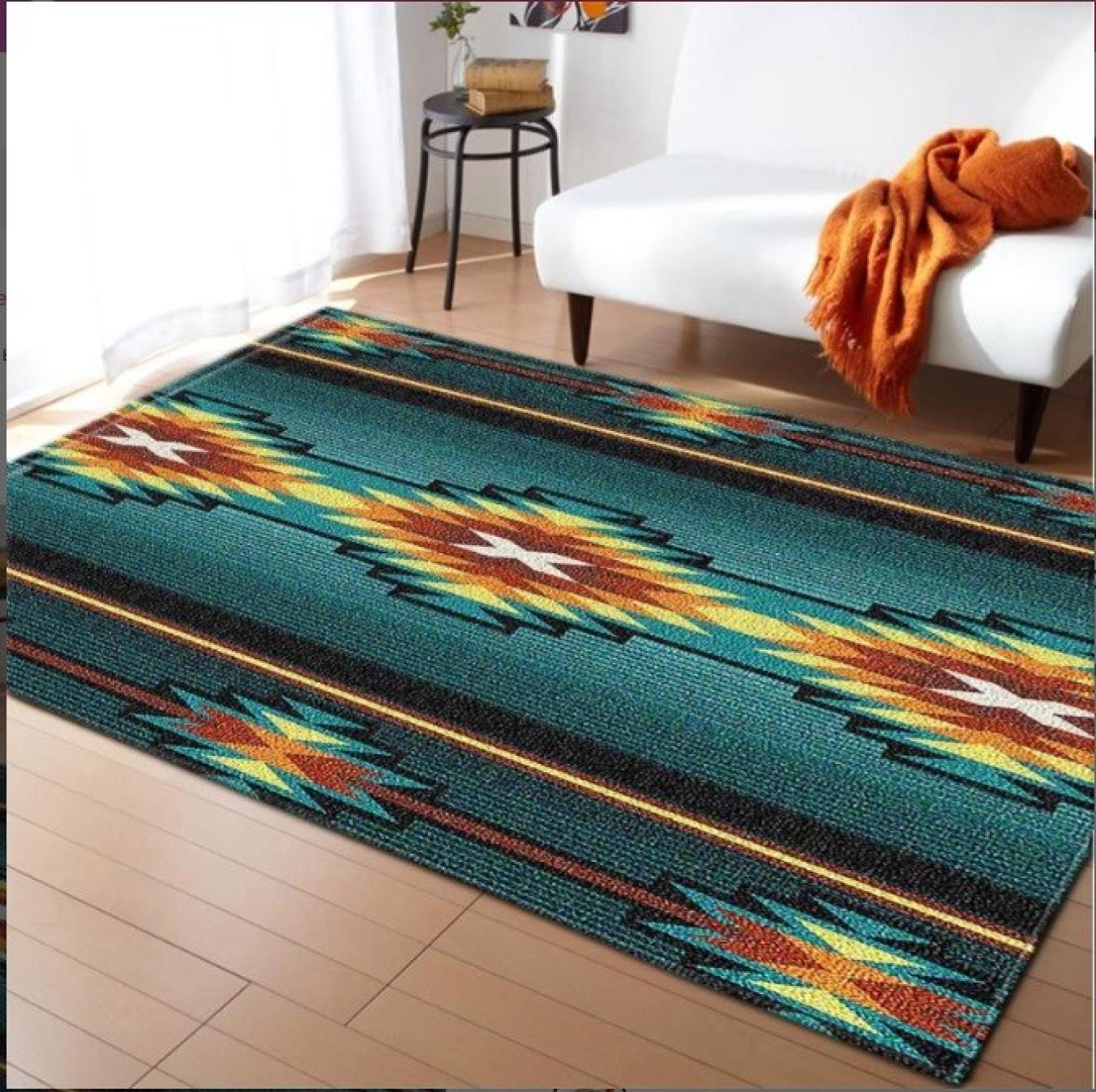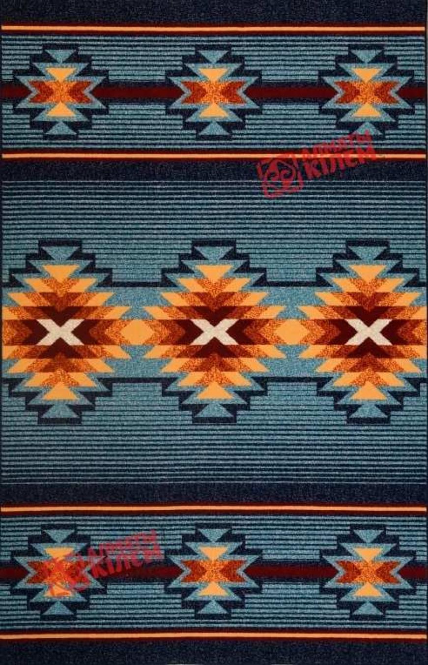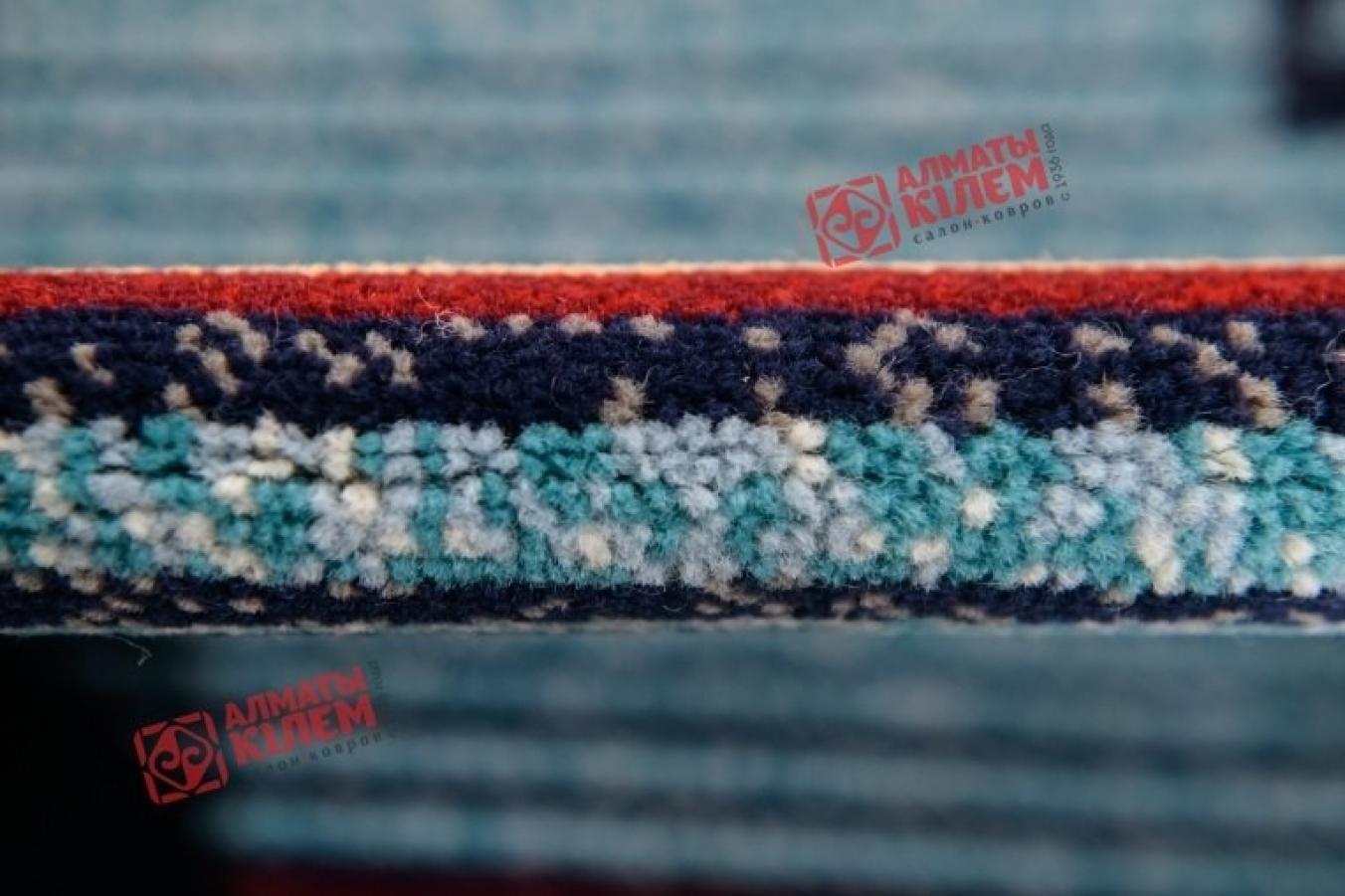 Великолепный шерстяной ковер с добавлением полиамида, улучшающего прочность и эластичность покрытия, с геометрическим узором в современном стиле не оставит вас равнодушными. Он станет центральным украшением абсолютно любой комнаты в доме, квартире, а также офисе или личном кабинете. На бирюзово-синем фоне изображены три ряда геометрических фигур по три в каждом. В центре этнического ковра крупные, а по краям более мелкие.