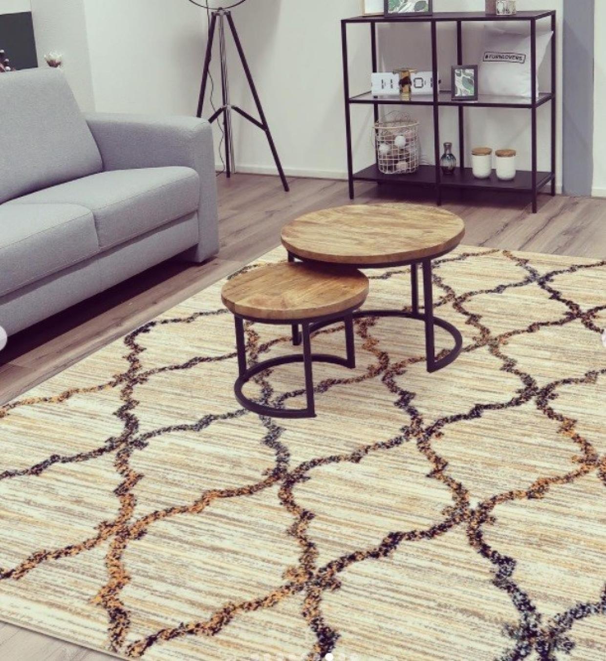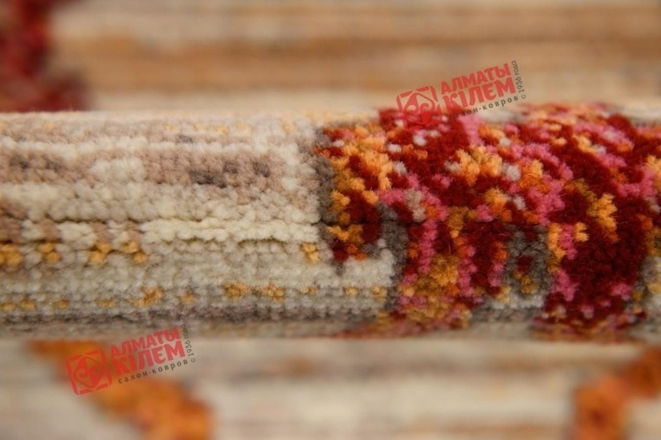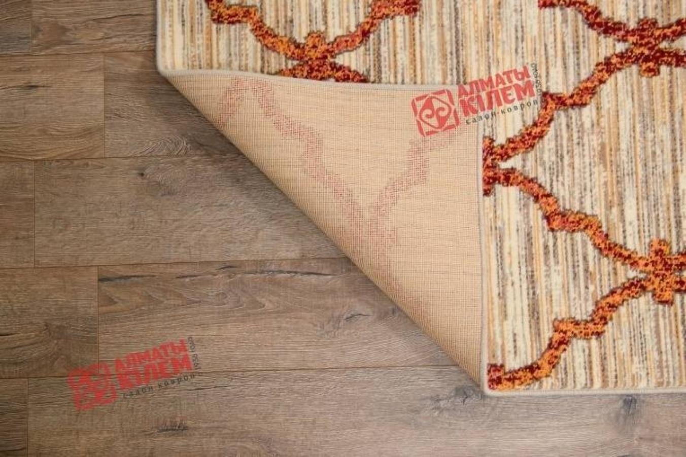 Роскошный напольный ковер из натуральной шерсти в современном дизайне с геометрическим узором. На бежевом фоне с вкраплениями более темного оттенка изображены медальоны. В отличие от традиционных, здесь они имеют миниатюрную форму и лишены рисунка, и лишь очерчены терракотовой линией. Все фрагменты объединены в одно целое. Видимость соединения создает впечатление того, что рисунок на геометрическом ковре соткан вручную и наброшен поверх светлого полотна напольного покрытия.