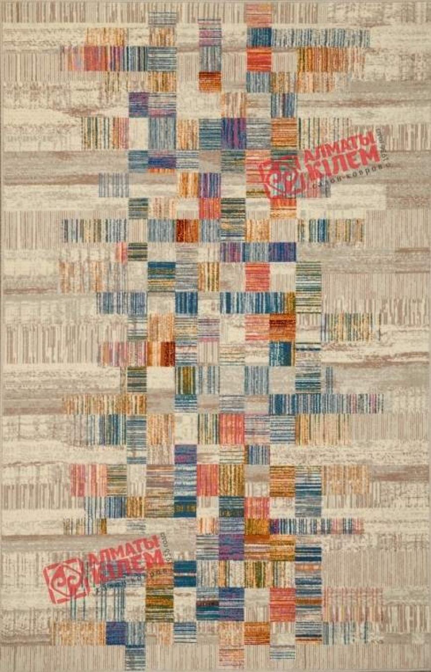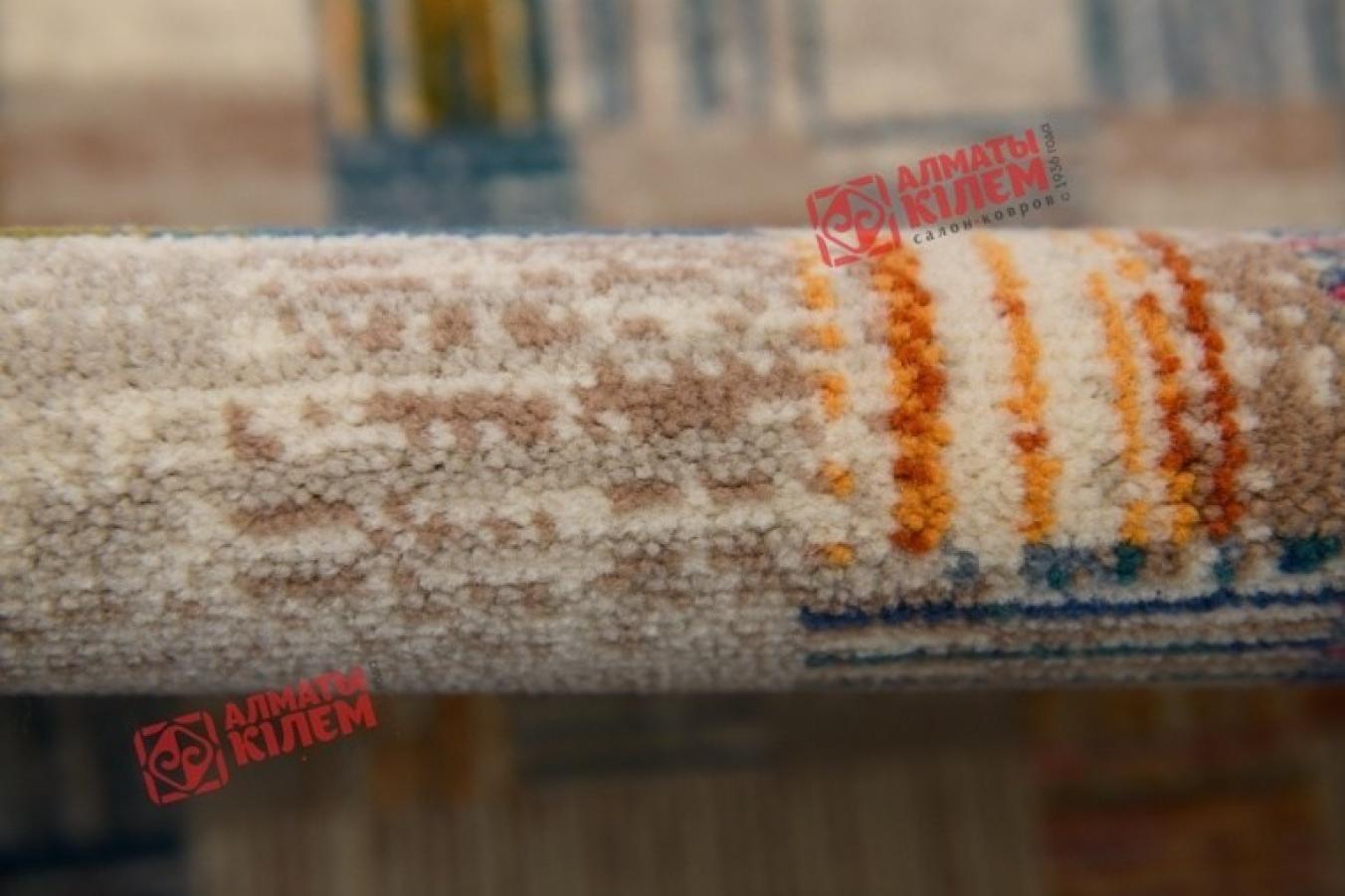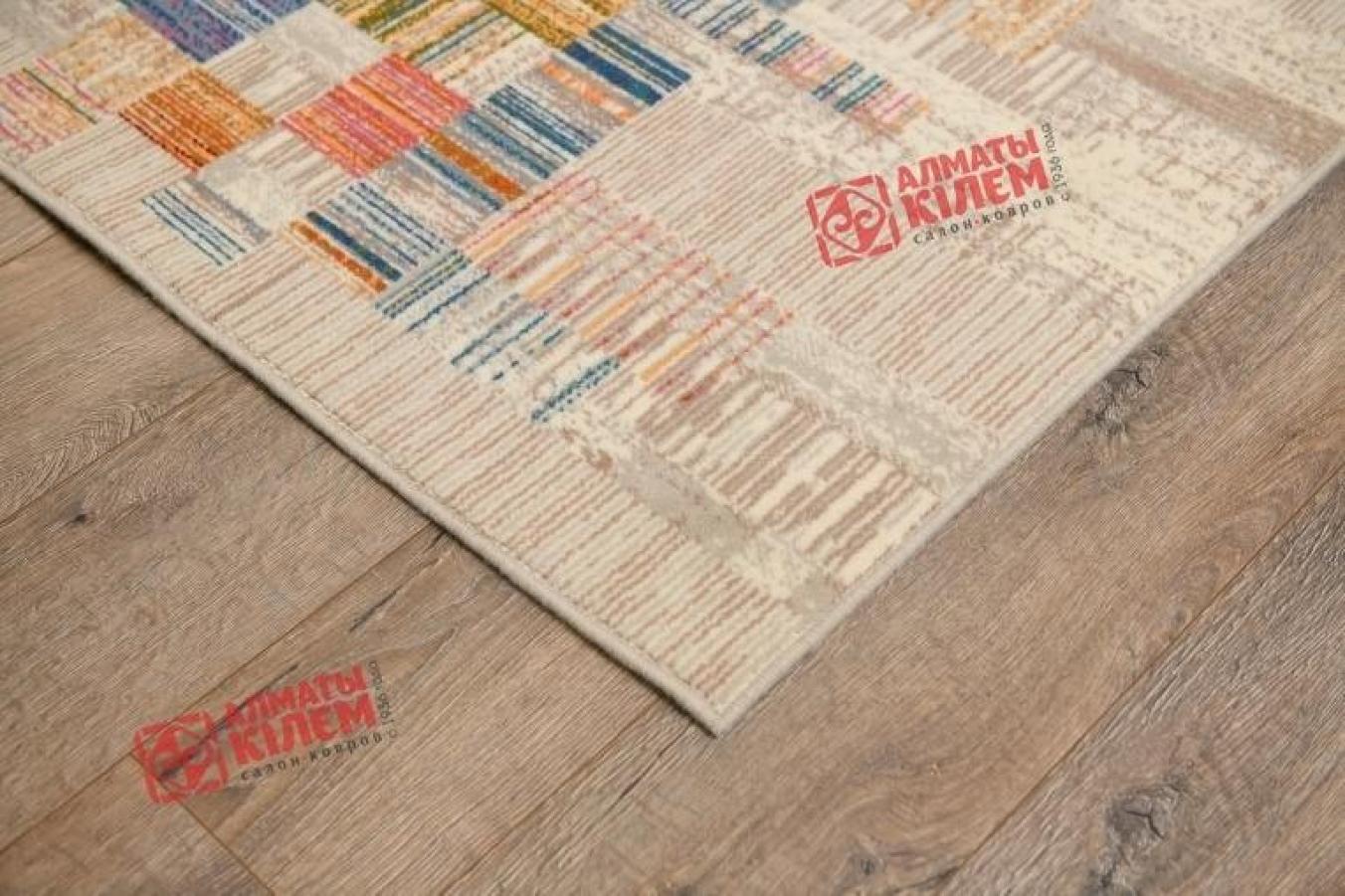 Оригинальный шерстяной ковер, купить который с доставкой в Алматы-Кілем можно не выходя из дома, с геометрическим разноцветным узором создан для ультрасовременных интерьеров. Вертикально расположенные кубики по центру бежевого фона создают трехмерный эффект. Они слегка размыты к краям и плавно переходят в основной светлый оттенок. Полотно одновременно и расширяет комнату благодаря наличию горизонтальных полос, и вытягивает за счет удлиненной формы.